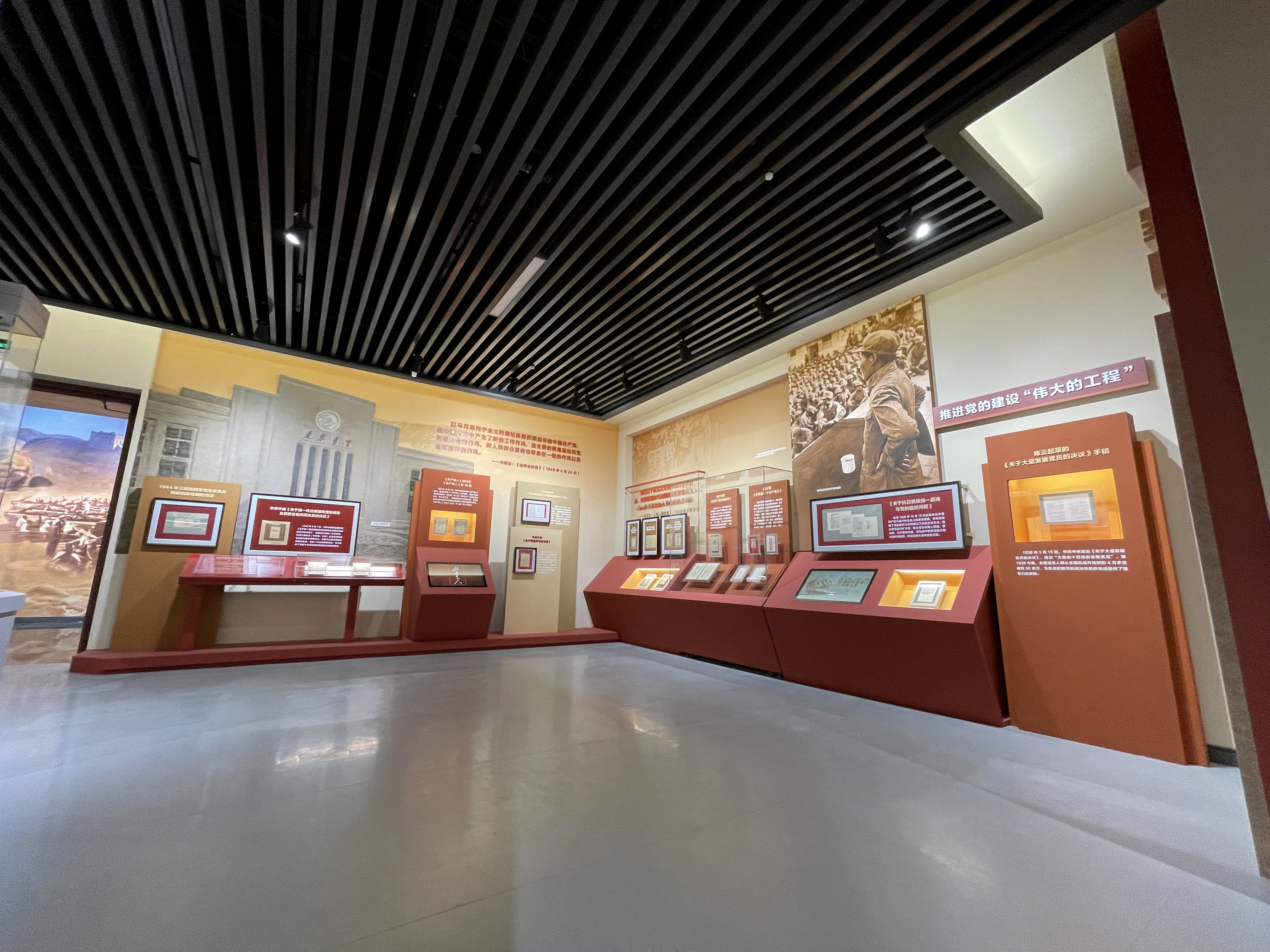 这次展览是中宣部和国家文物局共同推介的 109 个建党百年的精品展览之一。由清华大学美术学院展示艺术研究所主持艺术形式设计,北京清尚公司九部承担施工布展任务。