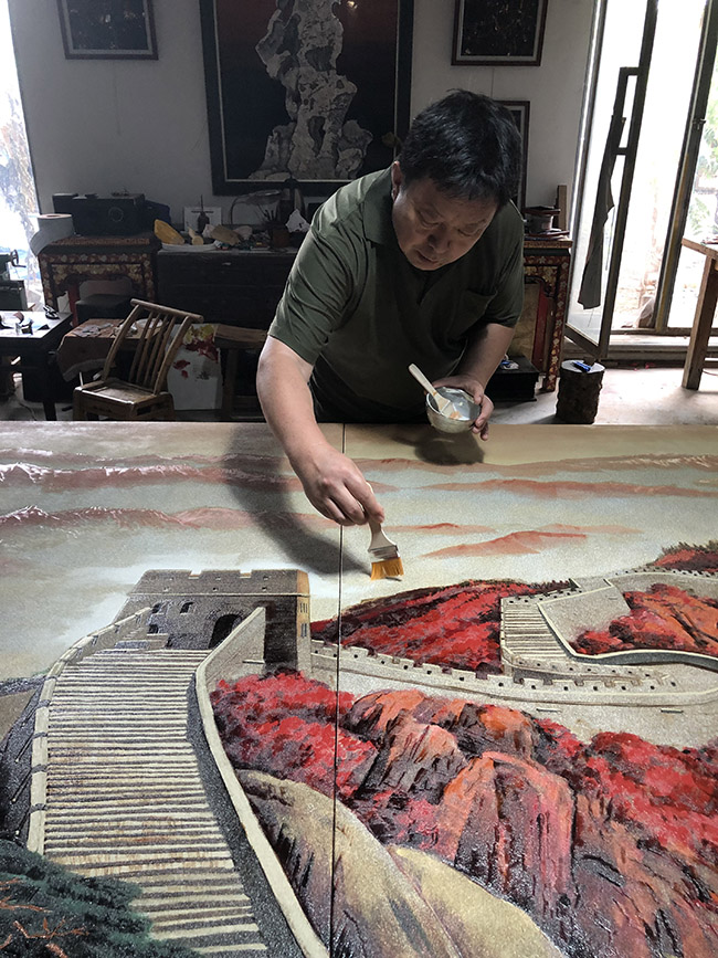 关于创作工艺方案,程向军教授多次征求乔十光先生的意见。著名漆画家乔十光教授是中国漆画的开拓者之一,是清华大学美术学院漆艺专业的创始人,他担任了这次《长城颂》漆壁画的艺术顾问。主创者程向军教授则多次到长城实地考察写生,反复推敲创作稿。这幅壁画是漆画史最大的室内漆壁画,对于壁画工艺实施方案有许多新挑战,艺术质量及安装工艺标准高。