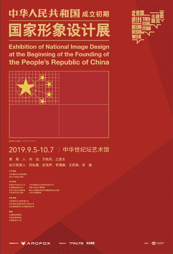 2019年9月5日,由北京国际设计周组委会和清华大学美术学院主办的中华人民共和国成立初期国家形象设计展,作为2019北京国际设计周主题展览在中华世纪坛艺术馆隆重开幕。北京国际设计周组委会秘书长、北京市委宣传部副部长赵磊,北京国际设计周组委会办公室主任、北京市国有文化资产监督管理办公室副主任董殿毅,清华大学美术学院党委书记马赛、副院长方晓风、教授何洁,曾参与建国瓷设计及制作的清华大学美术学院教授张守智,红旗CA770、北京BK651型公共汽车设计者、清华大学美术学院(原中央工艺美术学院)校友贾延良,油画《开国大典》作者董希文之女董一沙,北京国际设计周组委会办公室常务副主任、北京歌华文化发展集团有限公司党委书记、总经理李丹阳等出席开幕活动。北京市委常委、宣传部部长杜飞进一行在开幕式后参观展览。