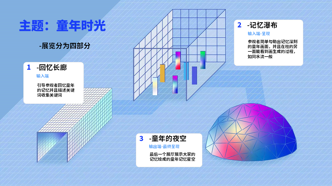 在当下,人们容易产生各种焦虑和问题,这些负面情绪和复杂经历让人变得不再纯粹。而童年是每个人最美好纯粹的时期,AI绘画又象征着技术日新月异的现代生活形态。这个展览想利用AI算法引导人们回忆童年,从而生成记忆中过去那些美好的画面,最后众人的画面汇聚在一片星空之上。希望观者在这样沉浸的过程中能找回过去那些美好的状态。