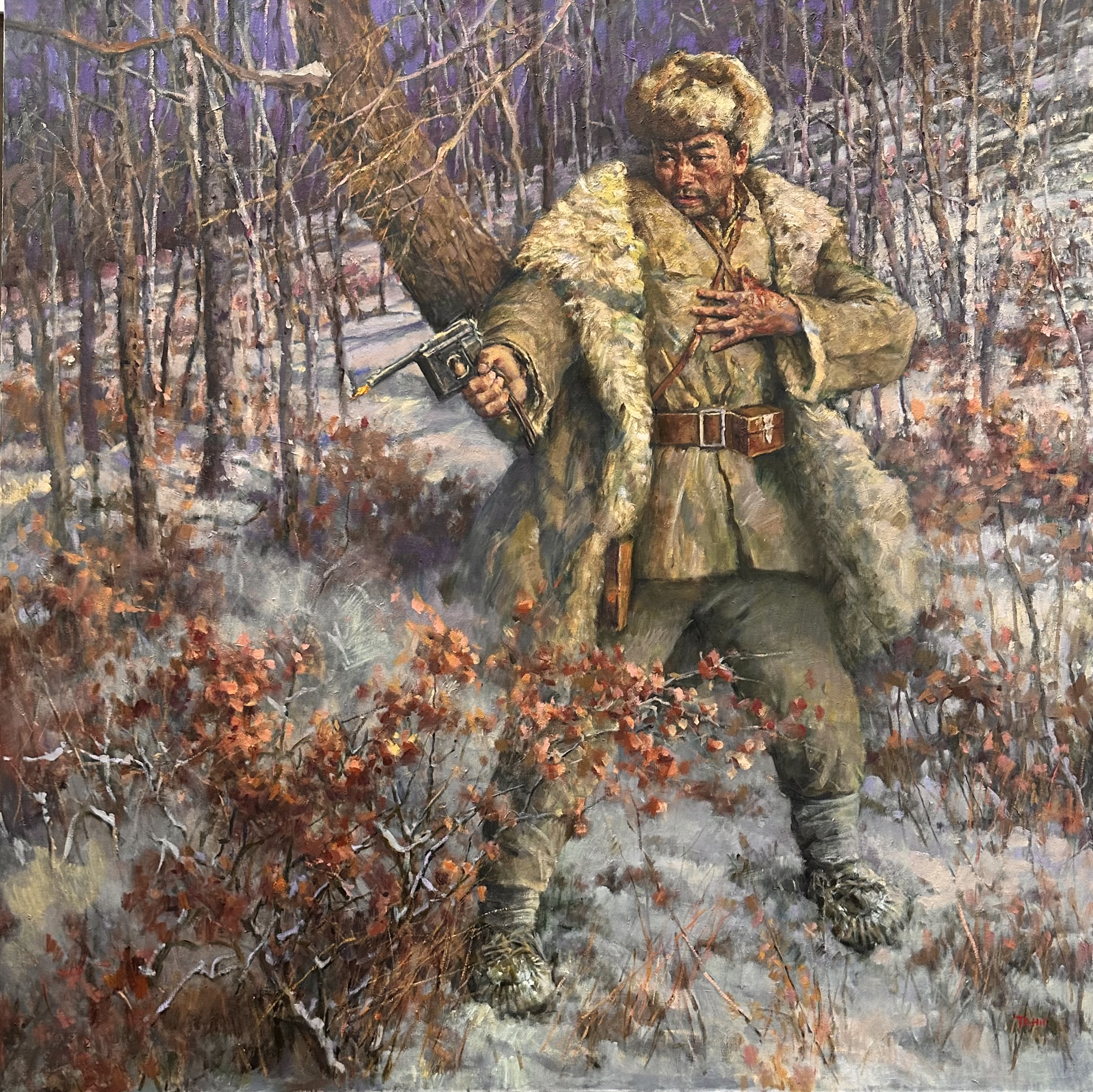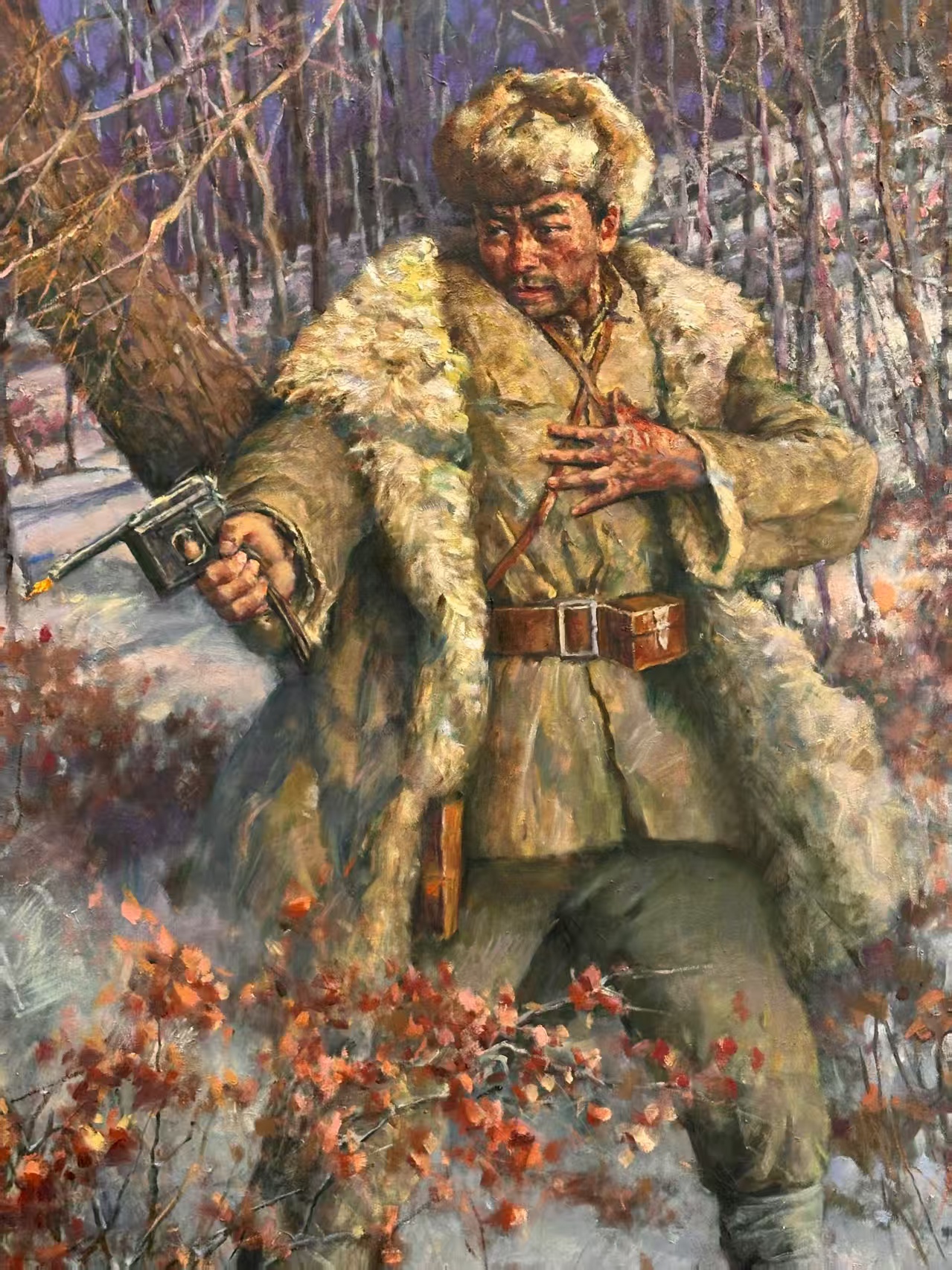 1940年2月23日,杨靖宇在吉林濛江县被日伪军包围,壮烈牺牲。画面选取杨靖宇将军生命的最后时刻,午后斜阳映照在白雪覆盖的山林坡地上,负伤后的杨靖宇将军靠在一棵树前,向敌人发射出最后的子弹。