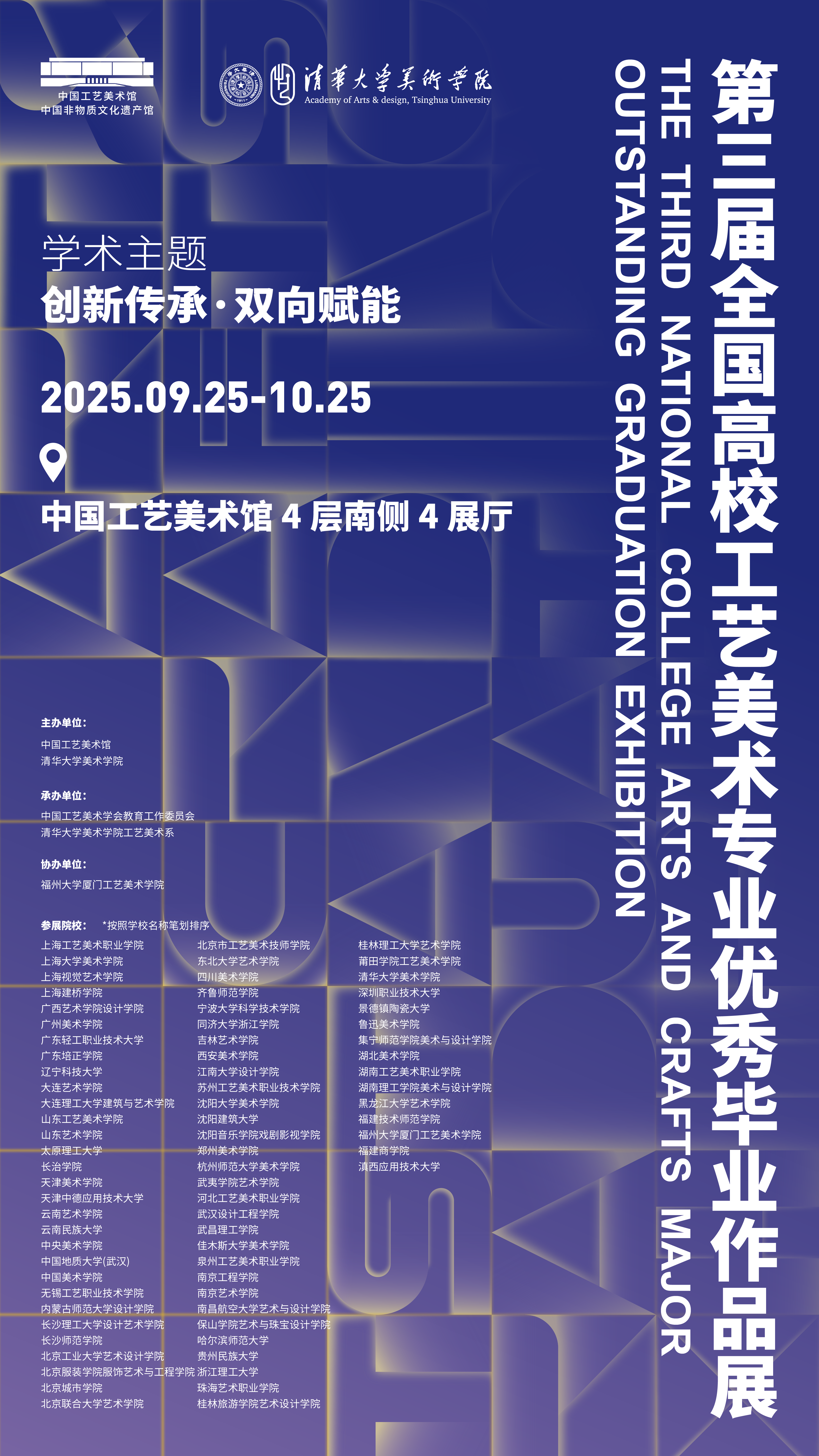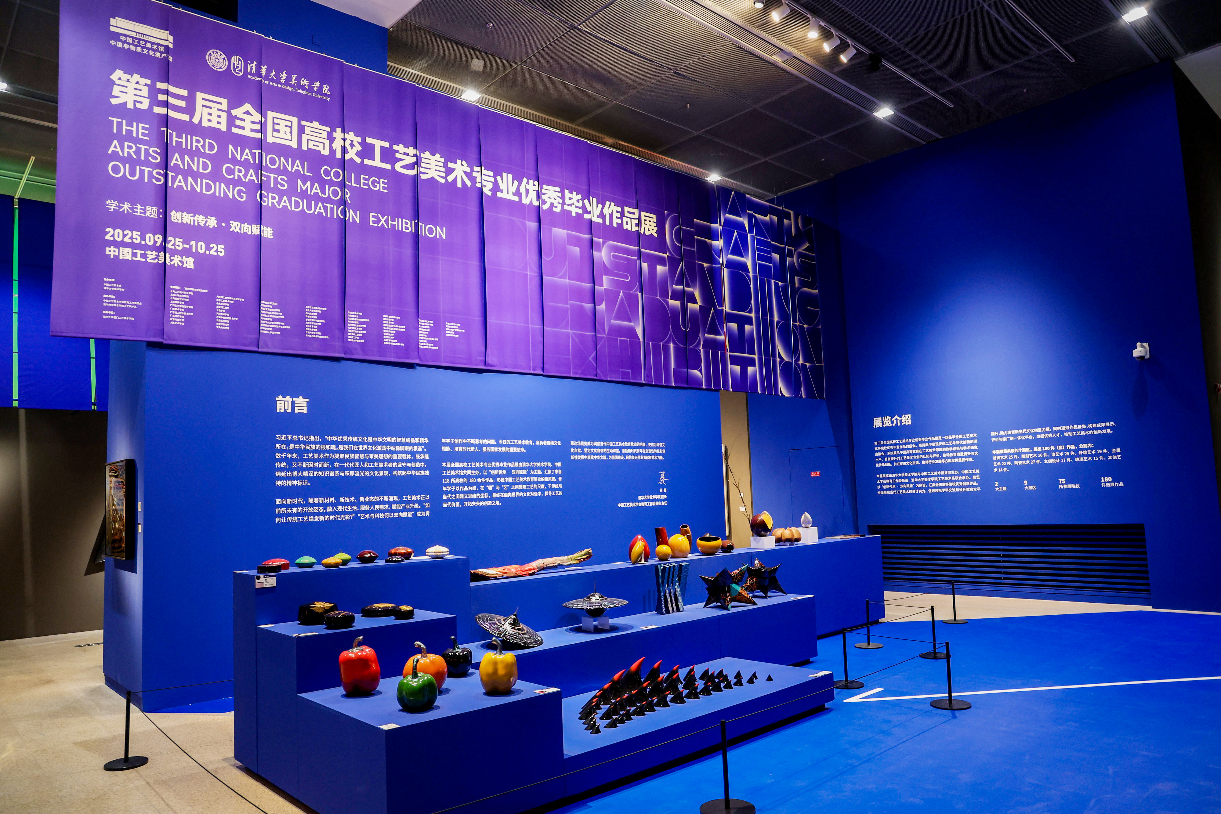 9月25日, “第三届全国高校工艺美术专业优秀毕业作品展”在中国工艺美术馆开幕。展览由清华大学美术学院与中国工艺美术馆共同主办,中国工艺美术学会教育工作委员会、清华大学美术学院工艺美术系联合承办,以“创新传承·双向赋能”为主题,展出来自 118 所院校的 180 余件作品,涵盖首饰、雕刻、漆艺、纤维、金属、陶瓷、玻璃、文创等九大门类。展览集中呈现了传统工艺与当代创新的深度融合,系统展示中国高等教育在工艺美术领域的教学成果与学术研究水平,在促进文化交流、推动行业发展等方面发挥着重要作用。