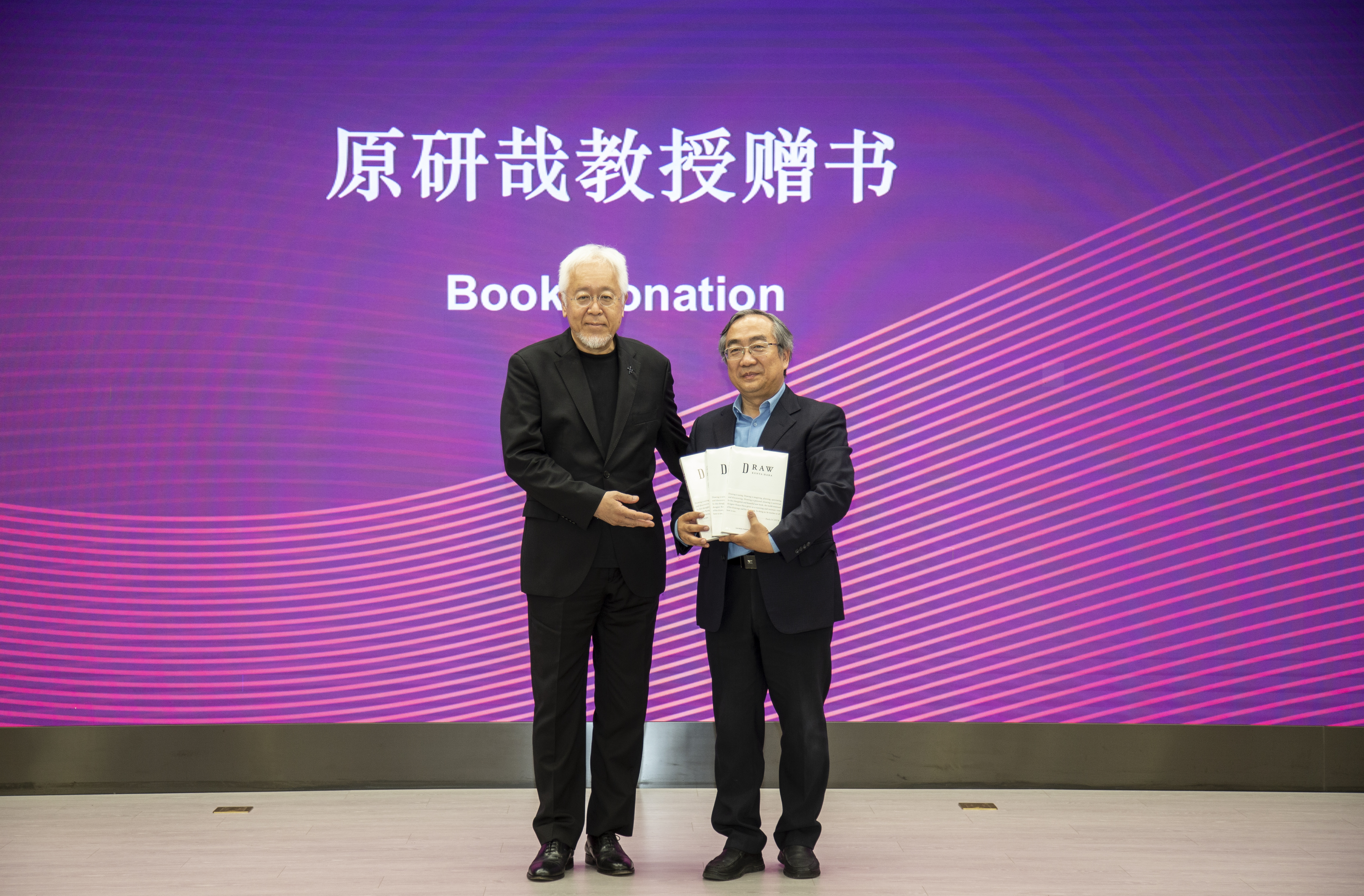 过勇为原研哉颁发“清华大学名誉教授”聘书,随后原研哉向清华大学赠送自己的新书,覃川代表学校接受赠书。