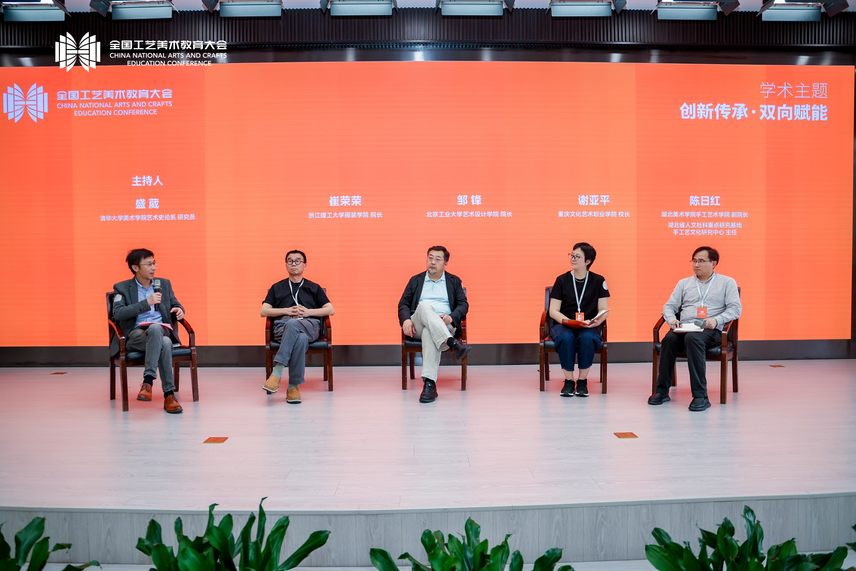 之后是“学术对话”环节,“学术对话”沿袭院校长学术交流论坛主题,分为上下两场。在“学术对话”上半场,重庆文化艺术职业学院校长、中国工艺美术学会学术委员会委员谢亚平,浙江理工大学服装学院院长崔荣荣,北京工业大学艺术设计学院院长、中国工艺美术学会理事邹锋,湖北美术学院手工艺术学院副院长陈日红,围绕从“技艺传承”到“智能创新”的主题,聚焦于工艺美术技艺传承对创新设计的正向赋能,旨在探究手工艺文化价值如何为技术时代的行业发展。清华大学美术学院艺术史论系研究员盛葳担任学术主持。