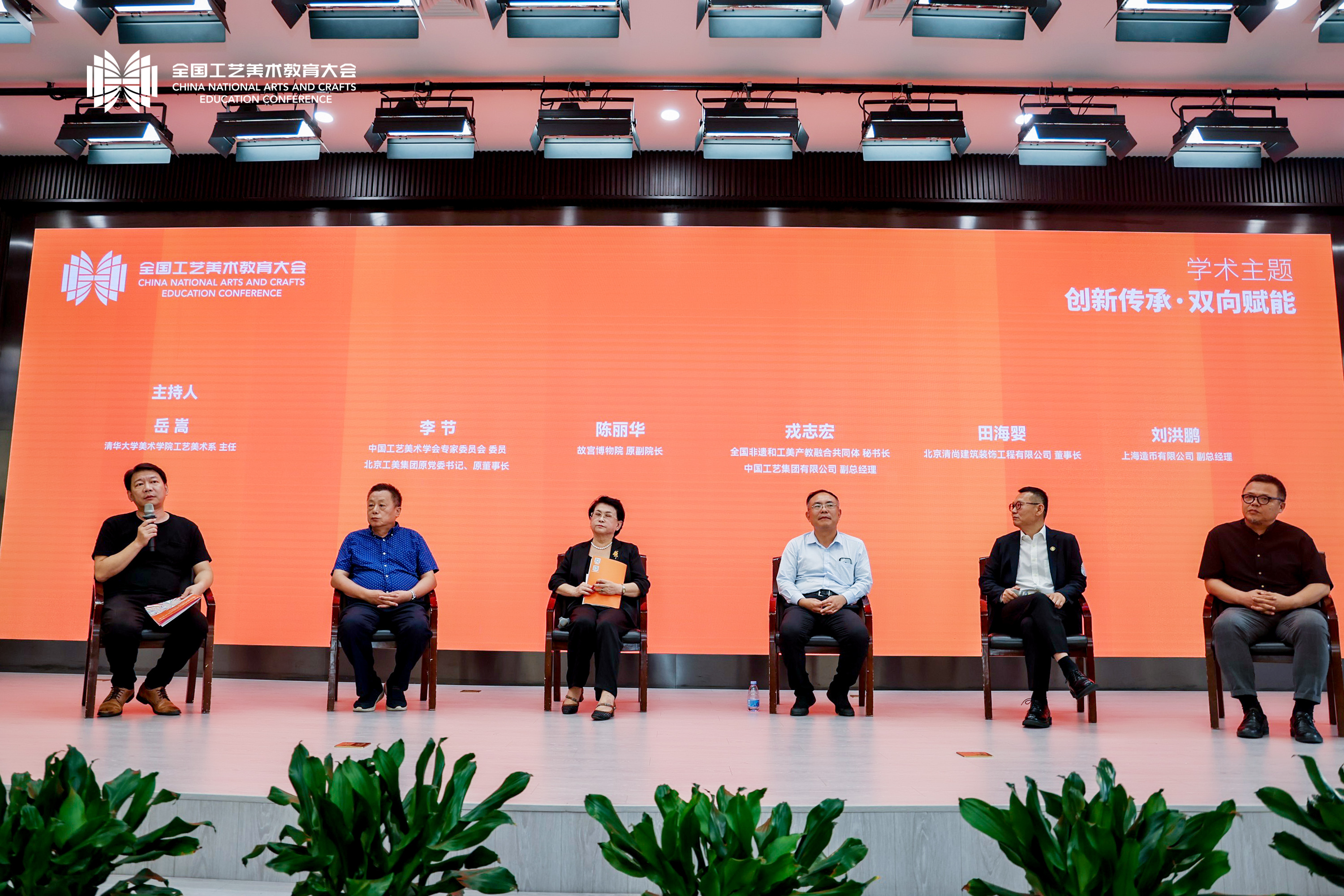在“学术对话”下半场,中国工艺美术学会专家委员会委员李节,北京清尚建筑装饰工程有限公司董事长田海婴,中国工艺集团有限公司副总经理、中国工艺美术学会常务理事戎志宏,故宫博物院原副院长陈丽华,上海造币有限公司副总经理刘洪鹏,围绕从“思维创新”到“人文传承”的主题,聚焦于工艺美术创新思维对文脉传承的反向赋能,旨在发掘创新思维如何使手工艺教育在数字时代焕发崭新生命力。清华大学美术学院工艺美术系主任、中国工艺美术学会纤维艺术与设计专委会执行秘书长岳嵩担任学术主持。