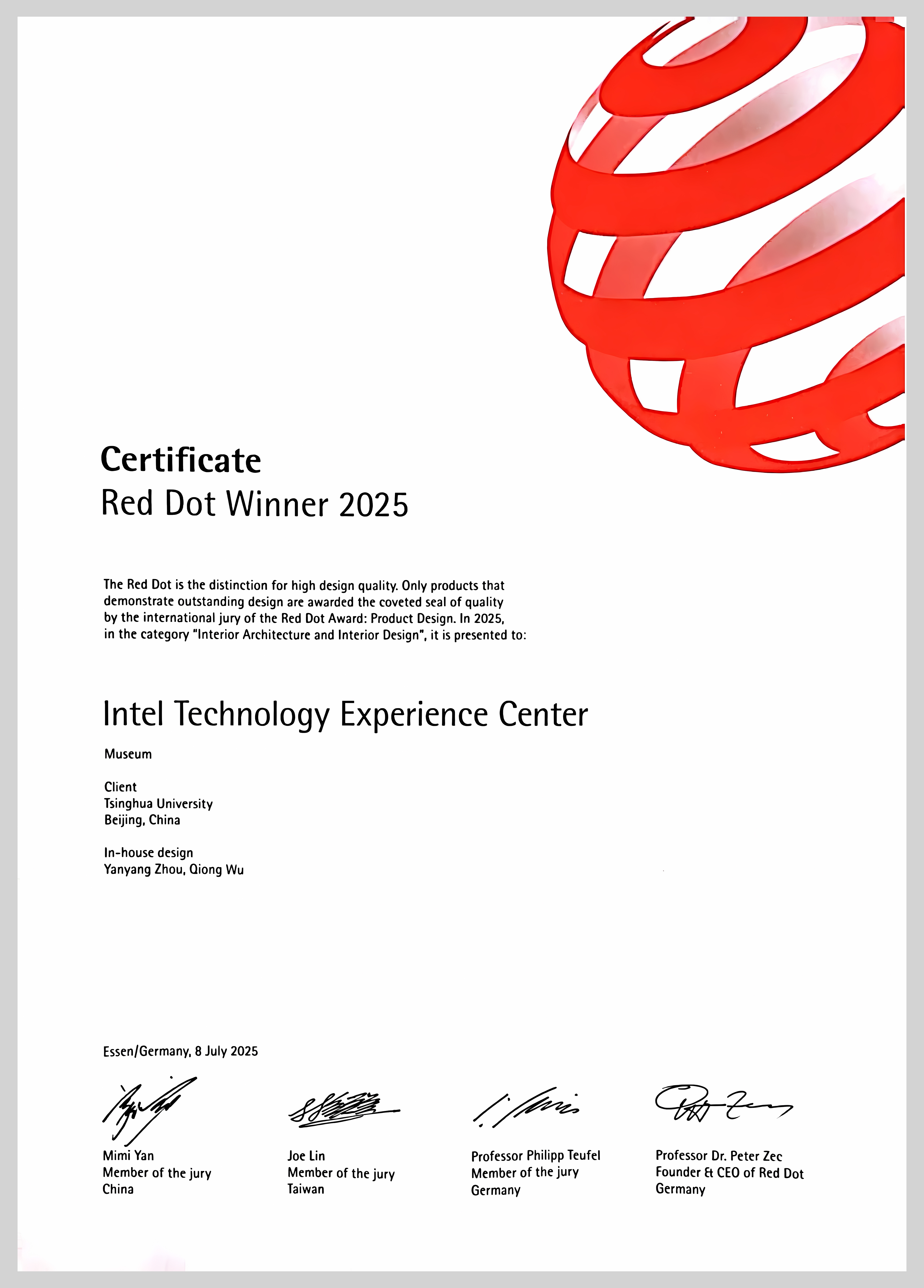 近期,德国红点设计奖(Red Dot Design Award)最终获奖名单揭晓,由清华大学美术学院周艳阳、吴琼老师设计的“英特尔全球科技体验中心”从全球逾万件参赛作品中脱颖而出,荣获“室内建筑与室内设计”类红点奖(Red Dot Winner 2025)。这是该作品继美国 MUSE 国际创意金奖、美国 IDA 设计铜奖之后再度斩获的重要国际殊荣。
