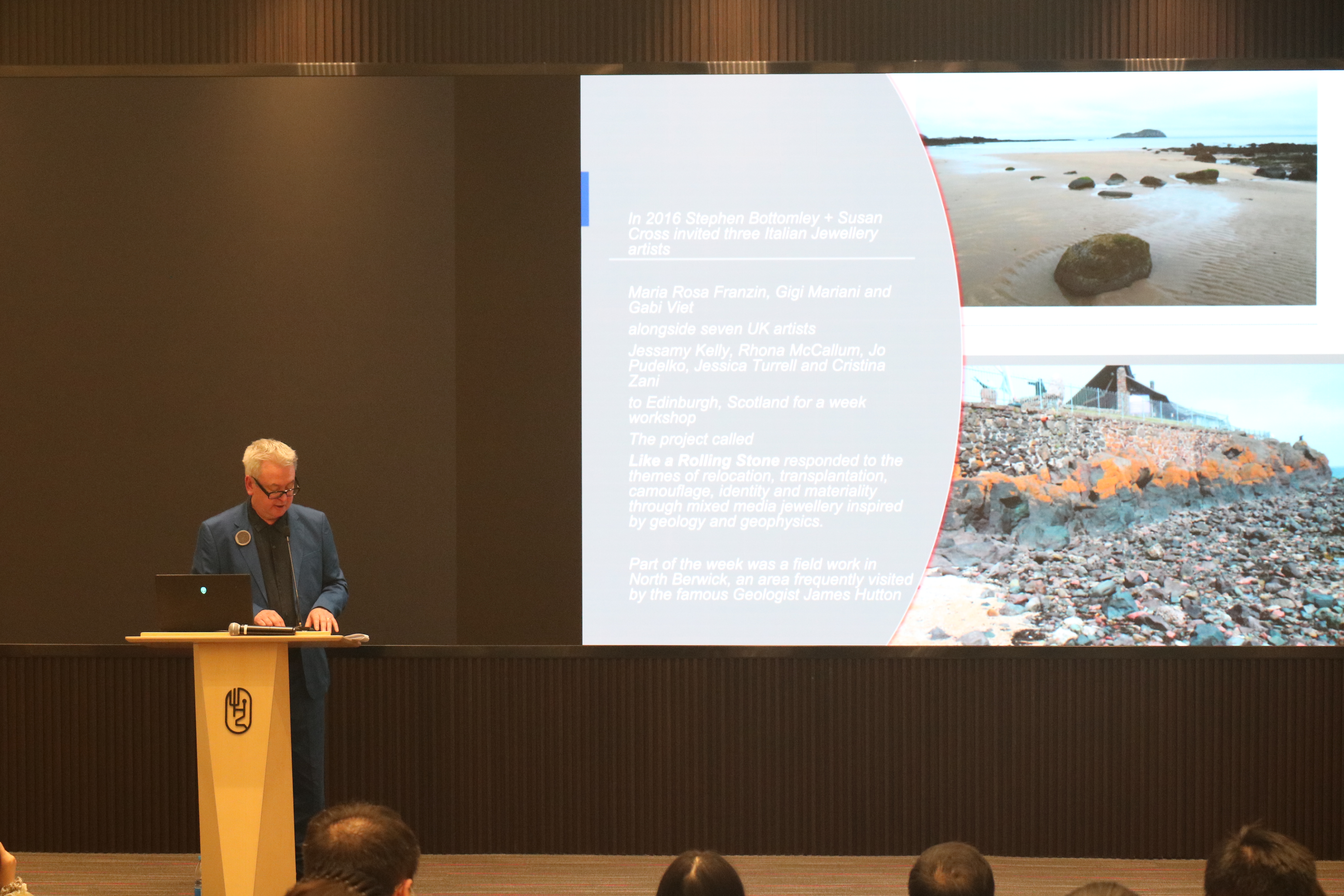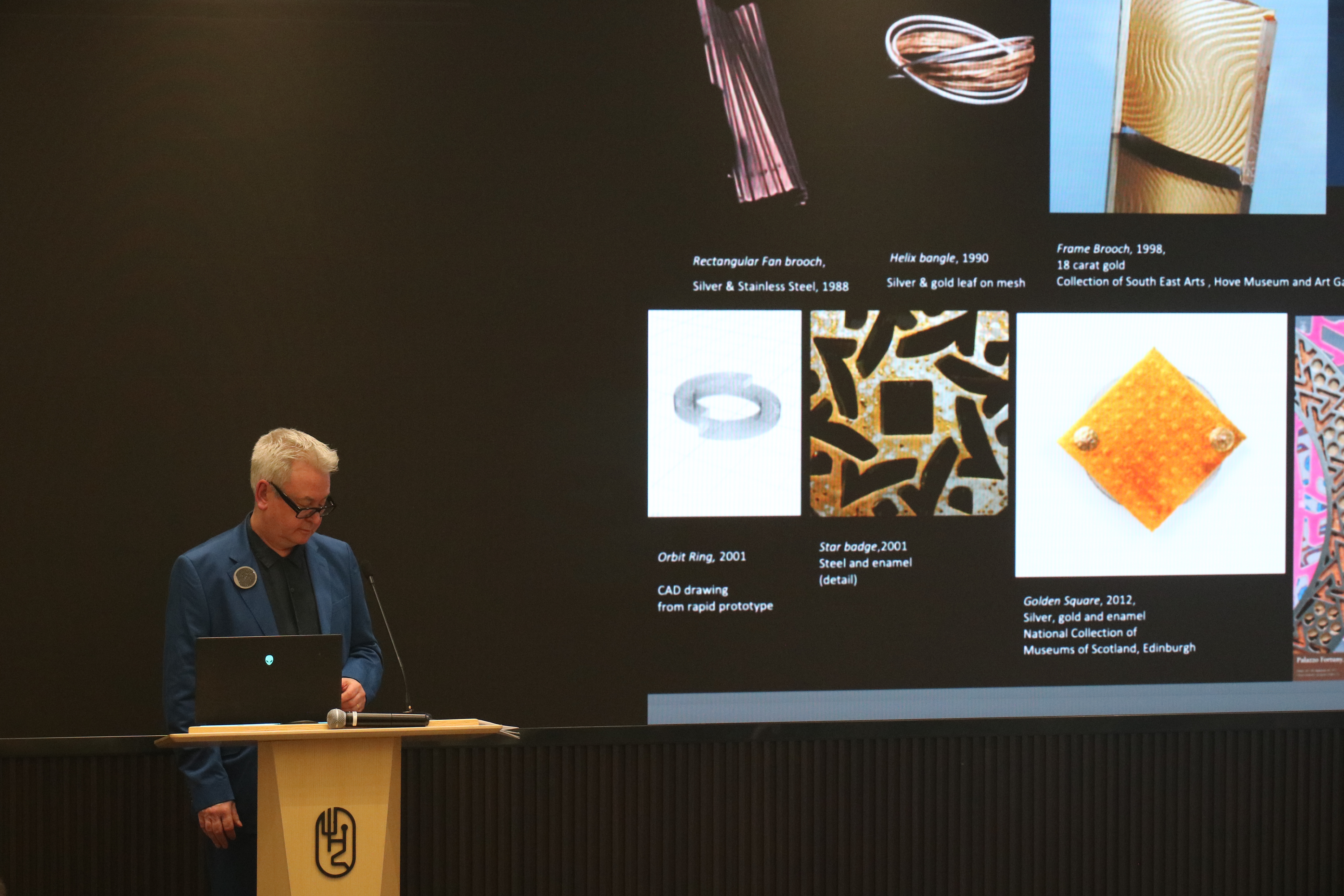 讲座伊始,Stephen Bottomley带领观众走近他所在的格拉斯哥市,生动地描绘了这座曾被誉为“欧洲文化之都”和“音乐之都”的城市风貌。在城市文化的熏陶和塑造之下,拥有近两百年历史的格拉斯哥美术学院在1845年成立,目标是以“装饰设计”服务社会、改善生活,其工艺和设计实践成就显著。Stephen Bottomley特别介绍了设计学院所在地——里德大楼,这一建筑由美国著名建筑师斯蒂文·霍尔设计,楼中的圆柱形光井将照明引入中心、宽敞走廊和阶梯鼓励人们相遇与交谈。在介绍学院时,Stephen Bottomley将荣耀归于多元化、国际化的团队,银器与珠宝系的专业教师们正是教学与创作的坚实力量。