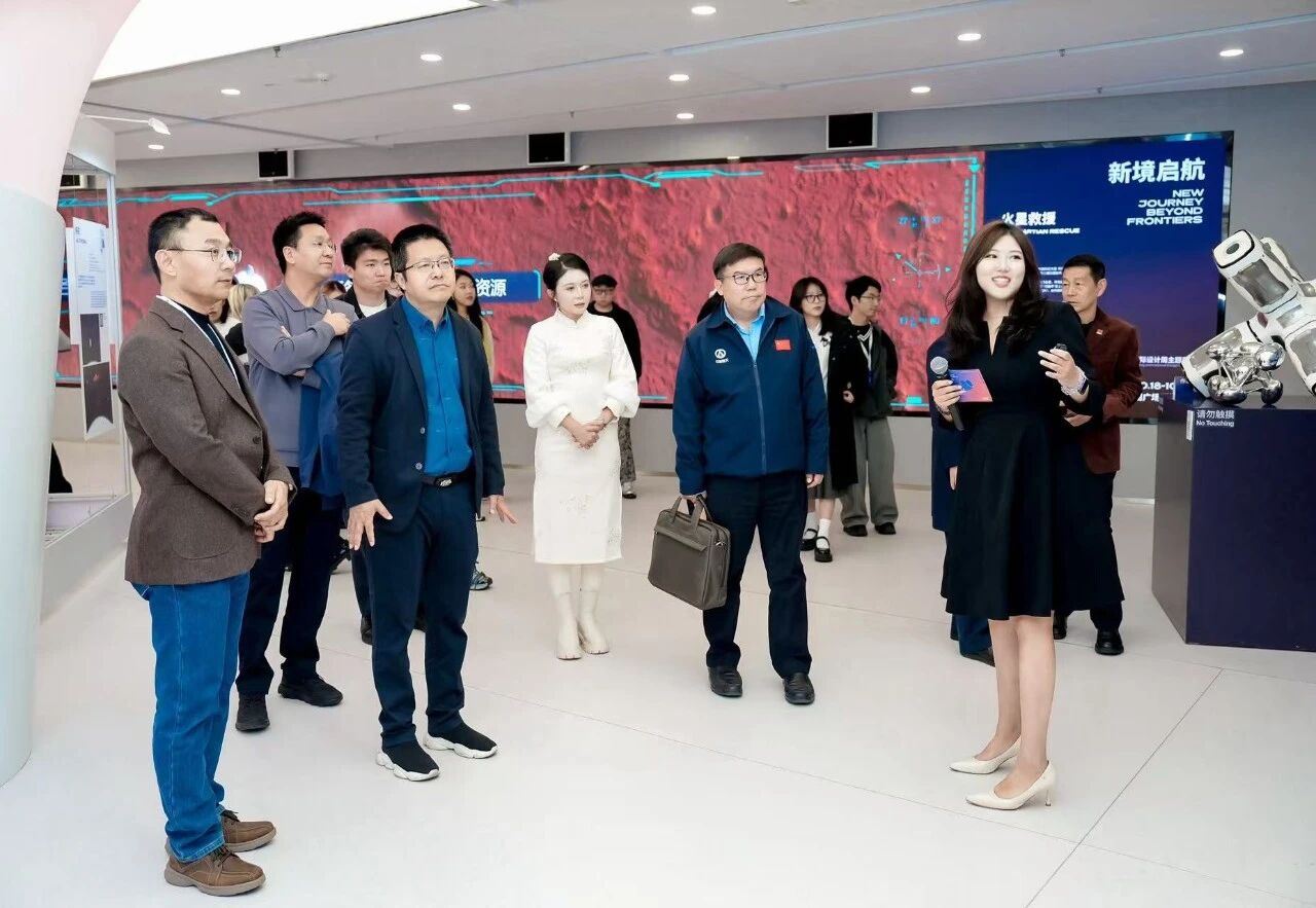 开幕式环节结束后,在执行策展人博士生徐佳旋的引导下,到访嘉宾和指导老师一同参观“未来图景2025:新境启航”展览。本次展览由清华大学美术学院付志勇、师丹青联合策展,汇聚多领域创作者,运用MR、AI交互等技术,邀请公众共同想象未来生活。展览以中华民族的飞天梦想为起点,从明代万户的火箭尝试,到如今“天宫”空间站和火星探测成果,构建了一条连接历史与未来的文化脉络。