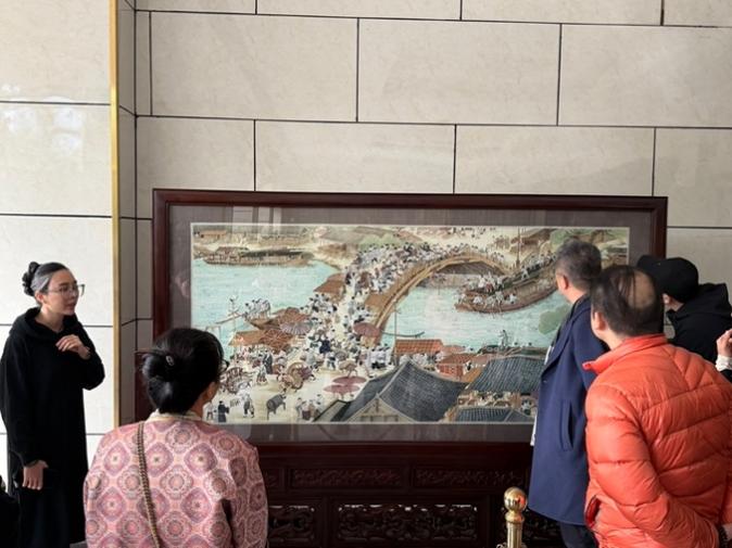 在北京工美集团白孔雀艺术世界(工艺品厂)总工艺师席闻(创新工作室领军人、北京市级工艺美术大师)的讲解介绍下,师生们深入工艺品厂,观摩了包括老一辈手艺人贾大双制作的北京补绣座屏《清明上河图》在内的多件艺术珍品,并亲手体验了各类新研发的非遗研学体验包。