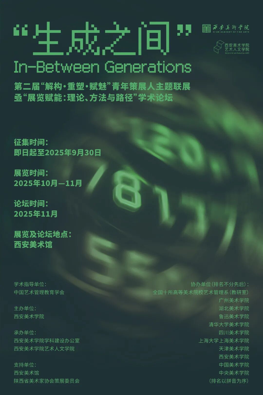 本届联展以“生成之间”为总主题,旨在探讨AI深度介入艺术展览策划实践的可能性与边界,构筑人类审美感知与人工智能逻辑之间充满张力的创意空间。展览汇聚了来自全国十所美术院校艺术管理专业的青年策展团队,围绕“AI × 策展”的命题进行实验性探索,共同打造艺科融合、产教协同、无界互联的展览新生态。