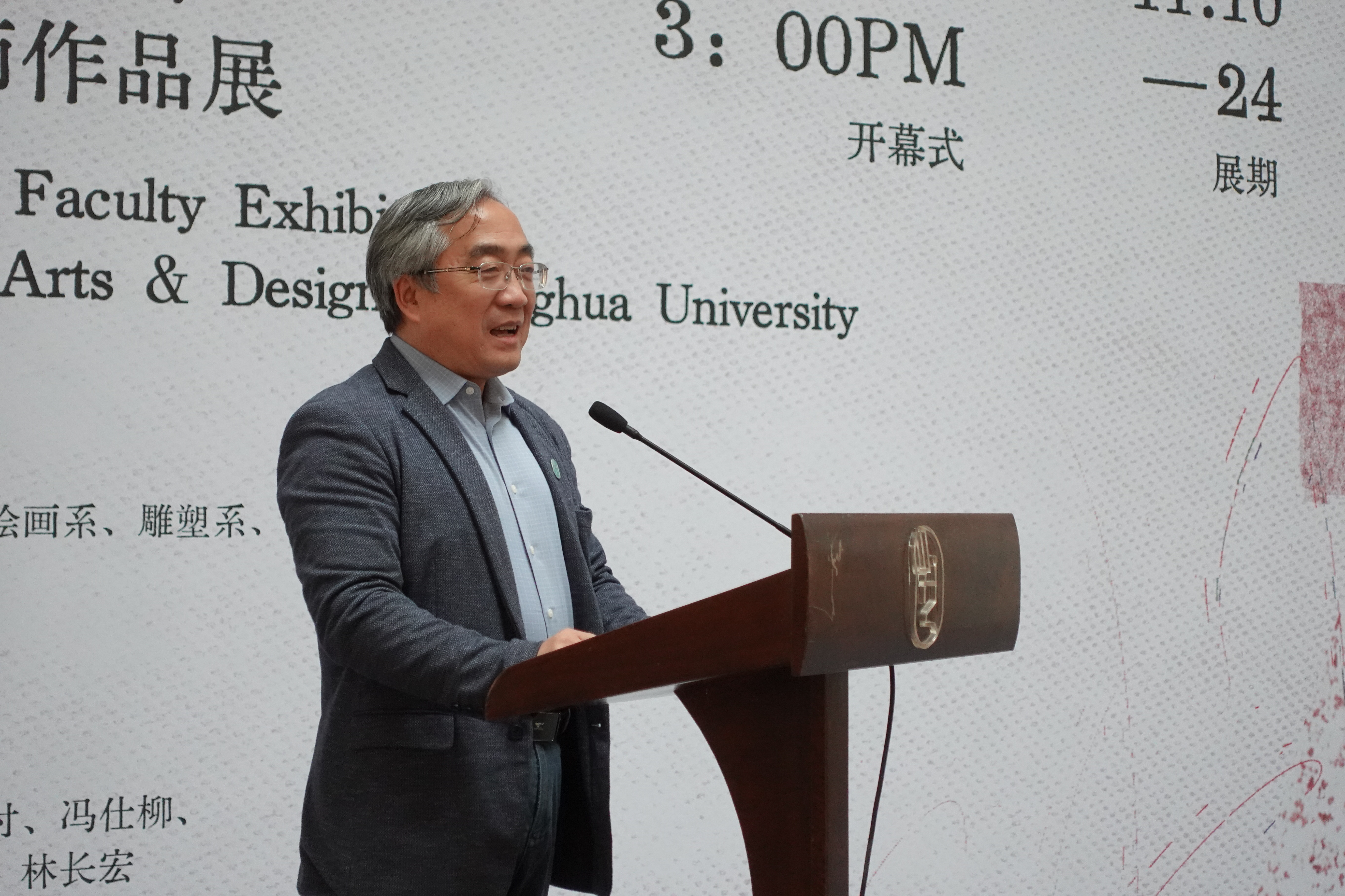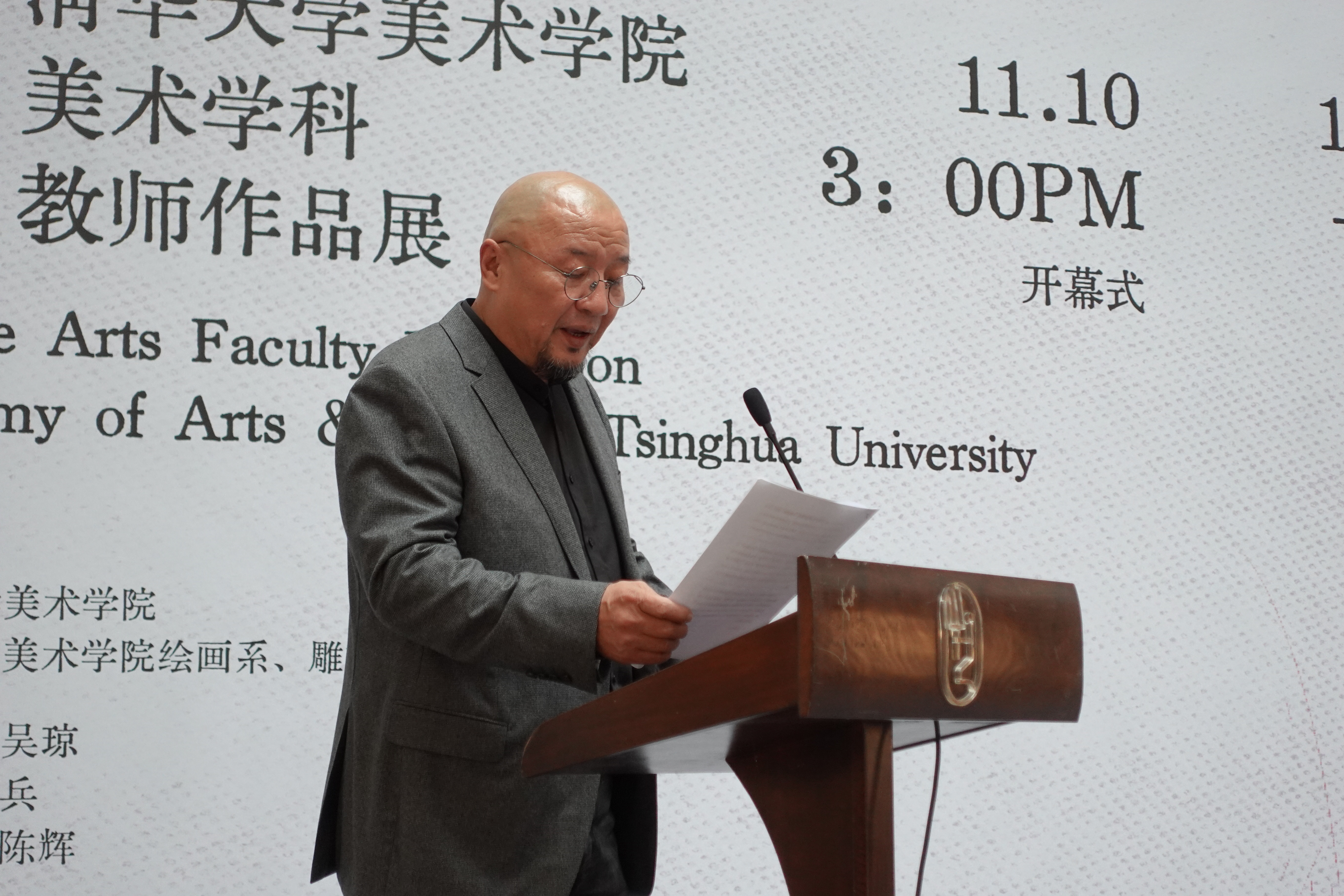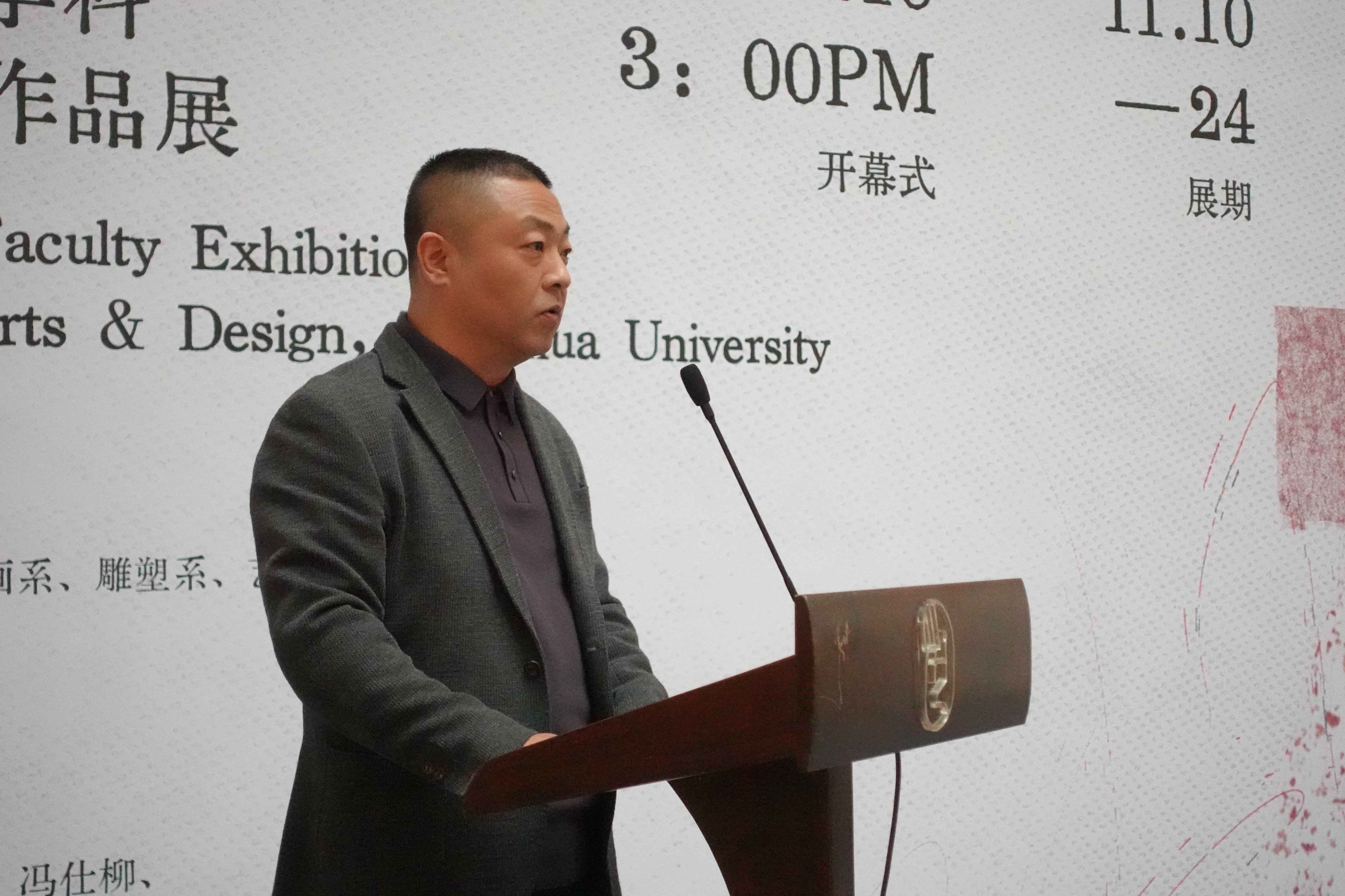 本次展览学术主持、雕塑系教授董书兵阐述了本次展览的学术立意。他指出,“教师创作的本质,在于‘以作品教作品’”。 展厅中的每一件作品,既是教师们呕心沥血、锐意创新的结晶,亦是课堂生动鲜活的延伸,诠释着“行胜于言”的清华精神。本次展览汇聚雕塑系、绘画系、信息艺术设计系、视觉传达设计系教师的作品,展现了艺术创新在服务党和国家重大战略、乡村振兴与城市更新、科技与艺术交叉融合等多方面的最新成果,使得青年学子可以在观摩中领悟艺术真谛与教育精髓。