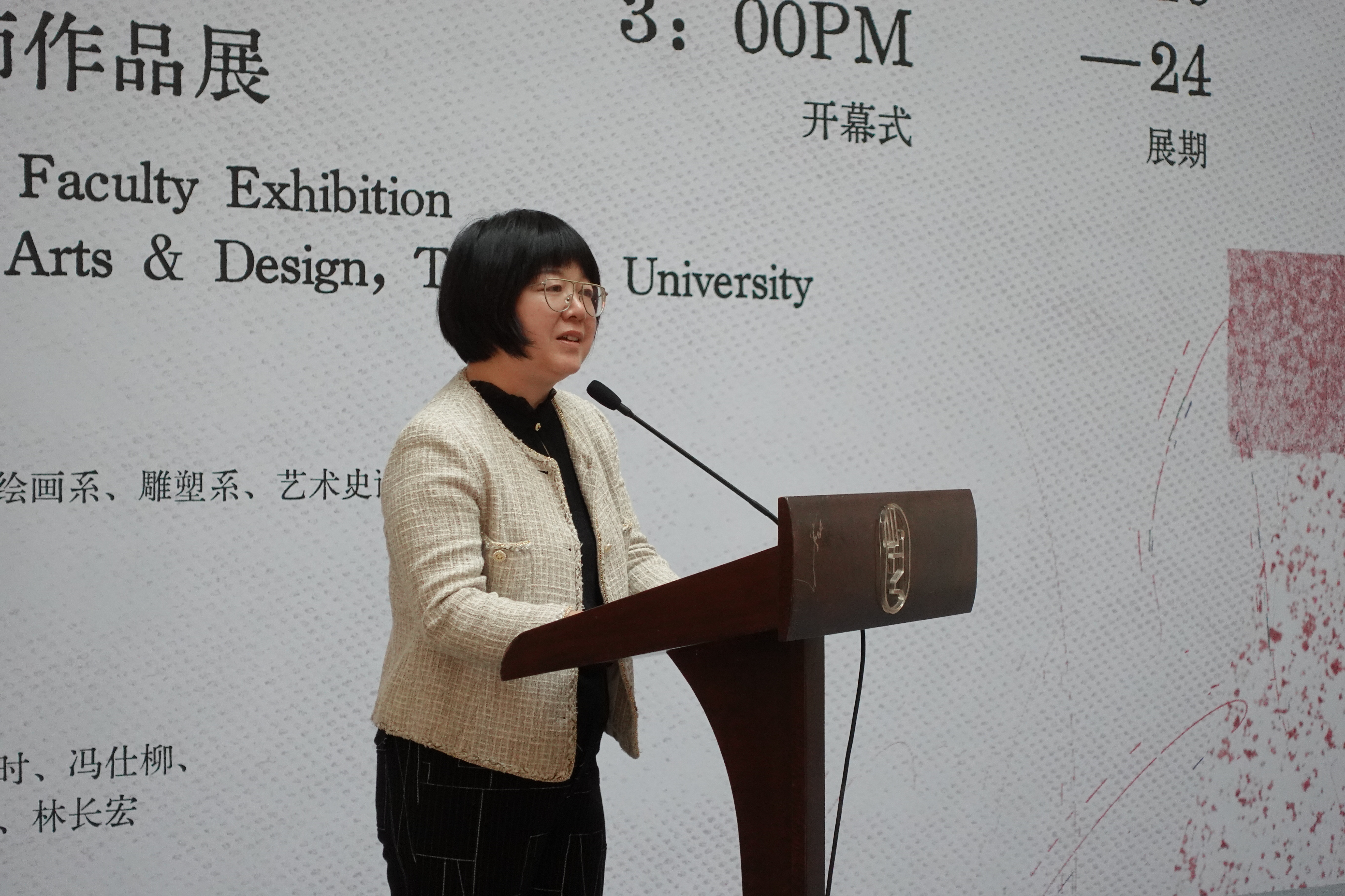 吴琼表示,教师是学院宝贵的财富,他们一方面以教学传递艺术的薪火,另一方面以不懈的探索拓展艺术的边界。清华美院的美术学科与设计学科同生共长,美术不仅是设计的滋养,更是思想创新的源头活水。她援引近期“人民的形式”展览前言中“建立一个宏大的、藉由艺术推动社会变革和大众生活改造的教育实践中心”这一前辈理想,点明了美术学科在学院使命中的核心地位。面对从“文化大国”迈向“文化强国”的时代征程,她认为本次展览中多学科教师的跨领域对话,正体现了清华美院学术生态的独特魅力,为艺术与科技的深度融合开辟了新的可能。