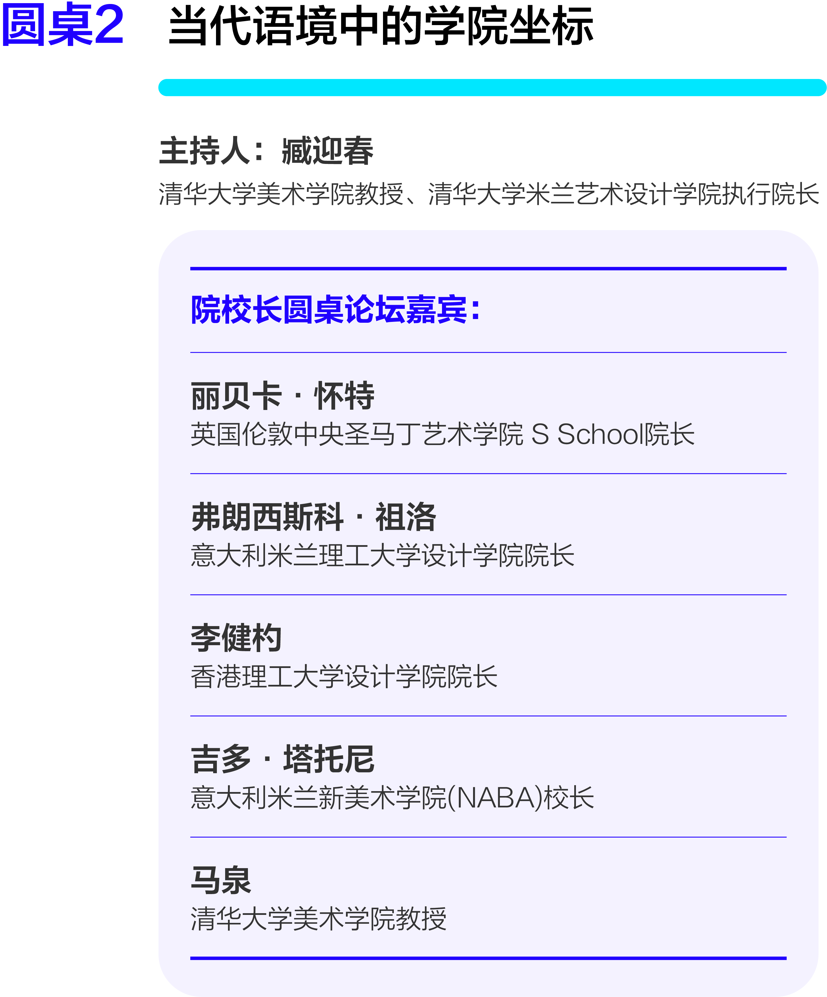 演讲和论坛展现出了全球艺术教育界多元化的观点和立场,既包括有英国皇家艺术学院、中央圣马丁艺术与设计学院、格拉斯哥艺术学院等百年学府,也有美国麻省理工晨星设计学院等新锐力量;既有米兰(NABA)新美术学院等独立院校,也汇聚了清华大学美术学院、米兰理工大学设计学院、香港理工大学设计学院、爱丁堡大学艺术学院等综合性大学体系中艺术设计院校。