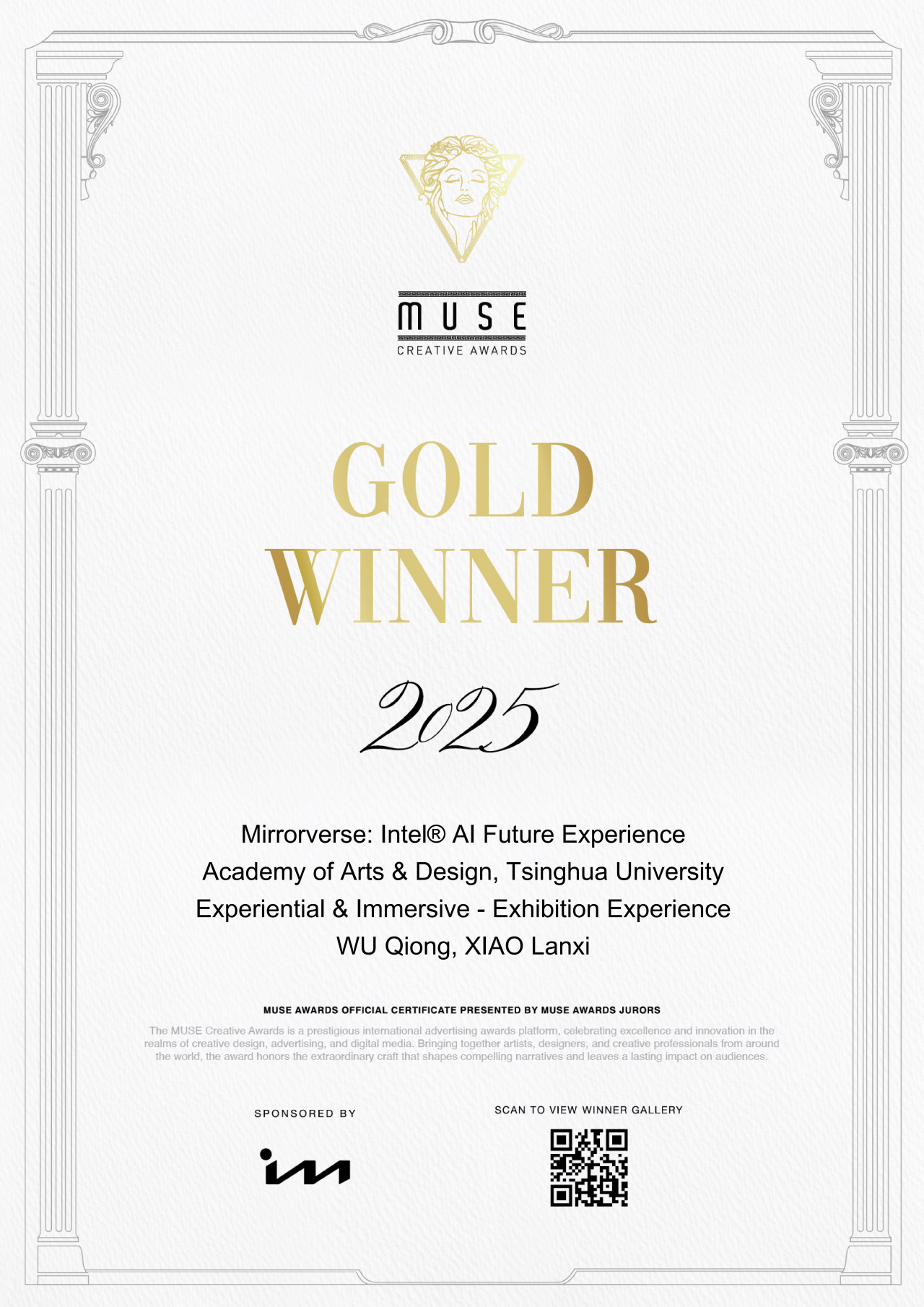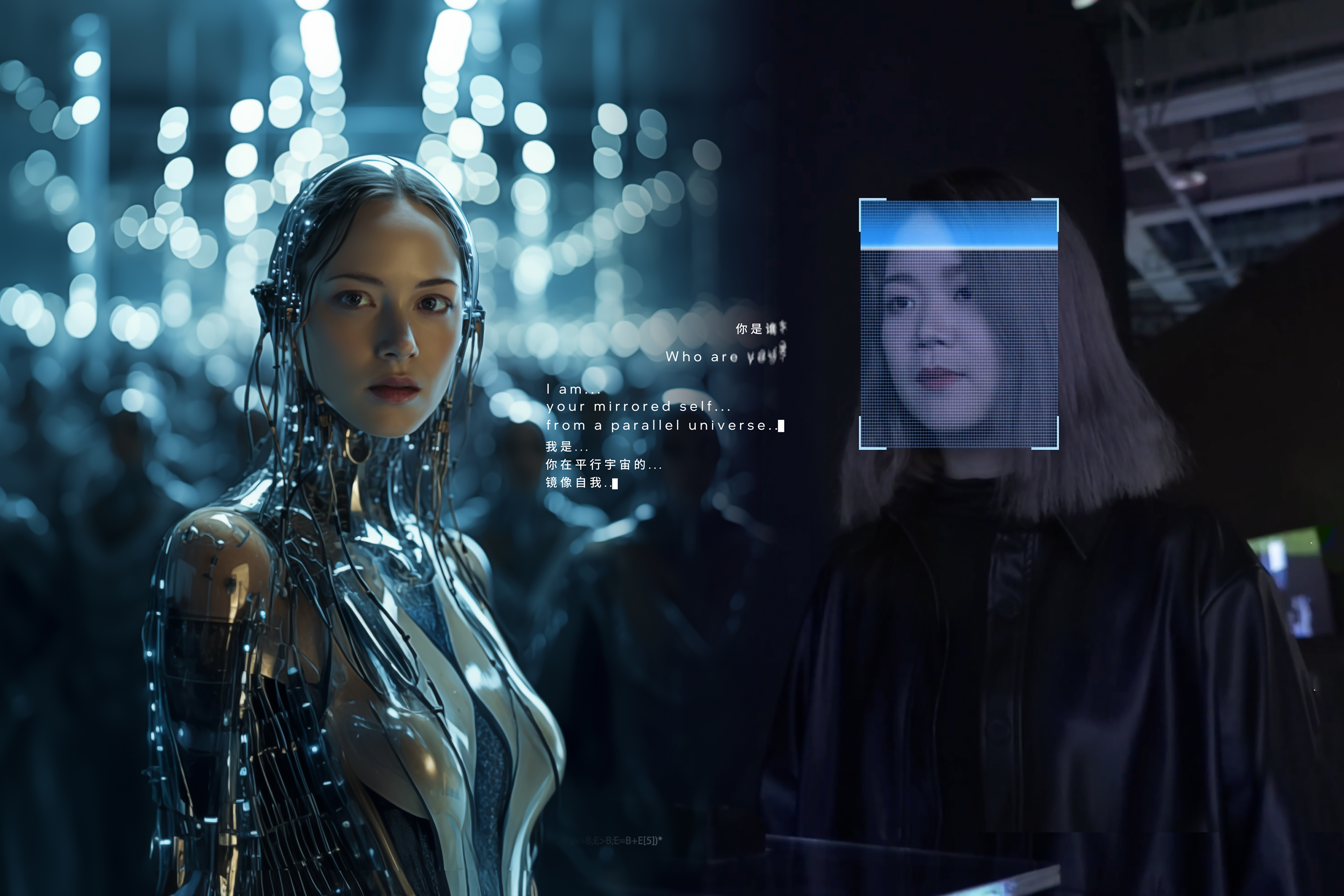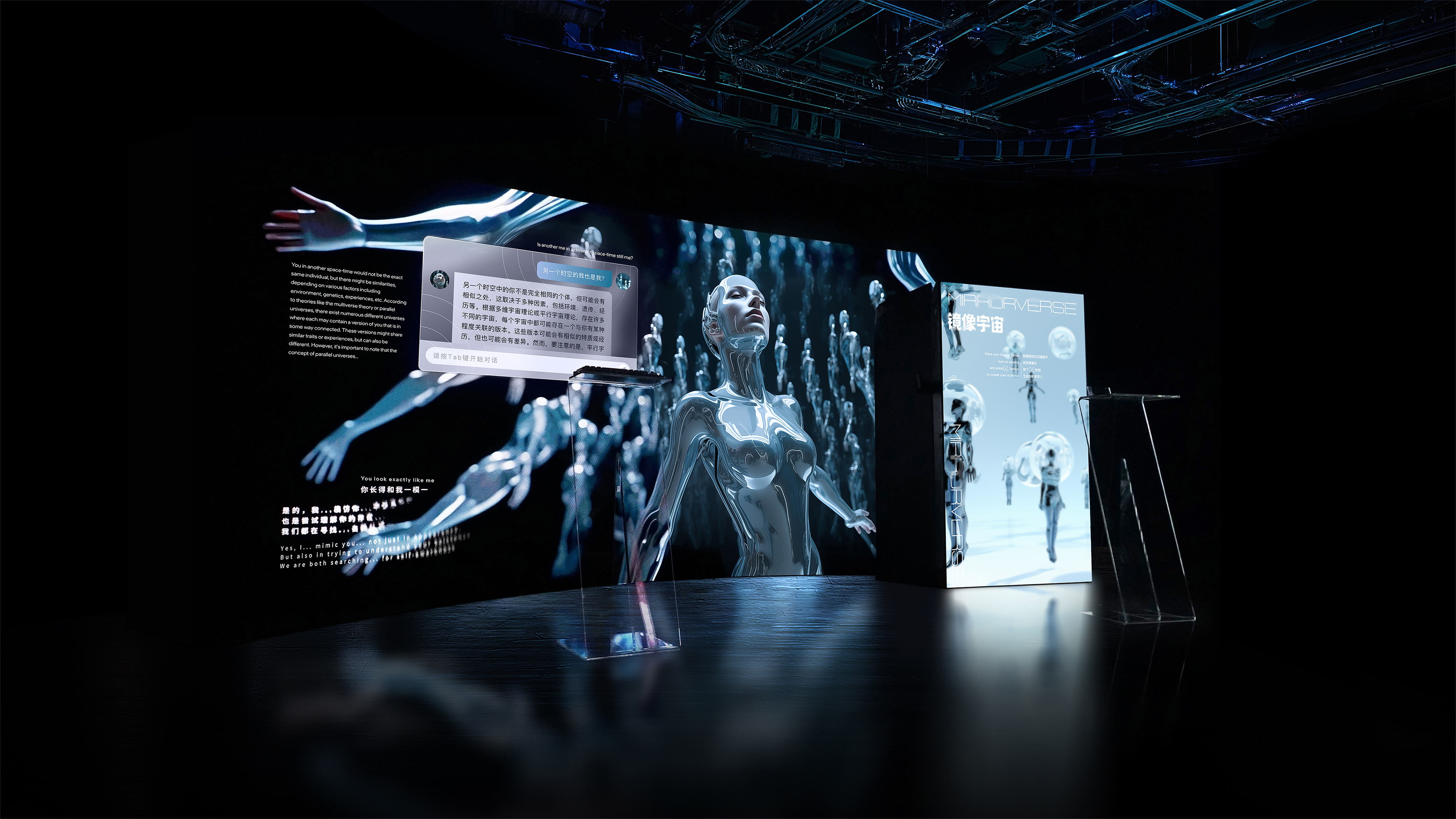在另一项代表性的艺术实践中,肖岚茜将目光从技术系统本身转向公众,借助交互艺术装置作品《身份镜像II》和《镜像宇宙》,让观众直接参与到人工智能伦理的讨论之中。她在作品中嵌入了AI换脸技术和大语言模型,观众可以与这个“硅基的自己”对话,探讨人类的主体性是否会在智能世界里受到冲击。作品在2025年缪斯国际创意设计奖(MUSE Design Awards)中一举拿下了三个赛道的金奖、一个赛道的银奖,并受英特尔、联想等国际知名科技公司邀请,在国家体育馆、国家科技传播中心、上海外滩等10余个场所展出,实现了科技艺术向商业场景的拓展,以及面向公众的科普与思辨。