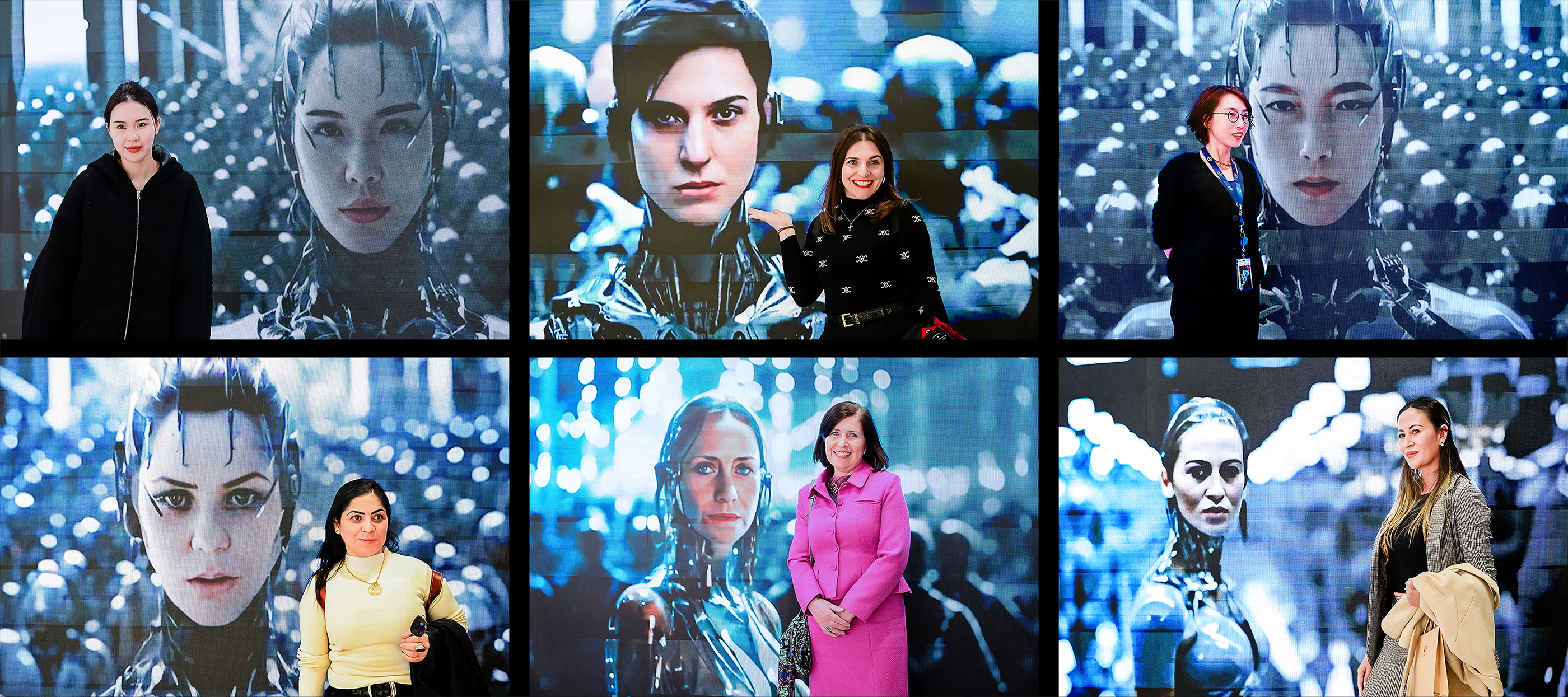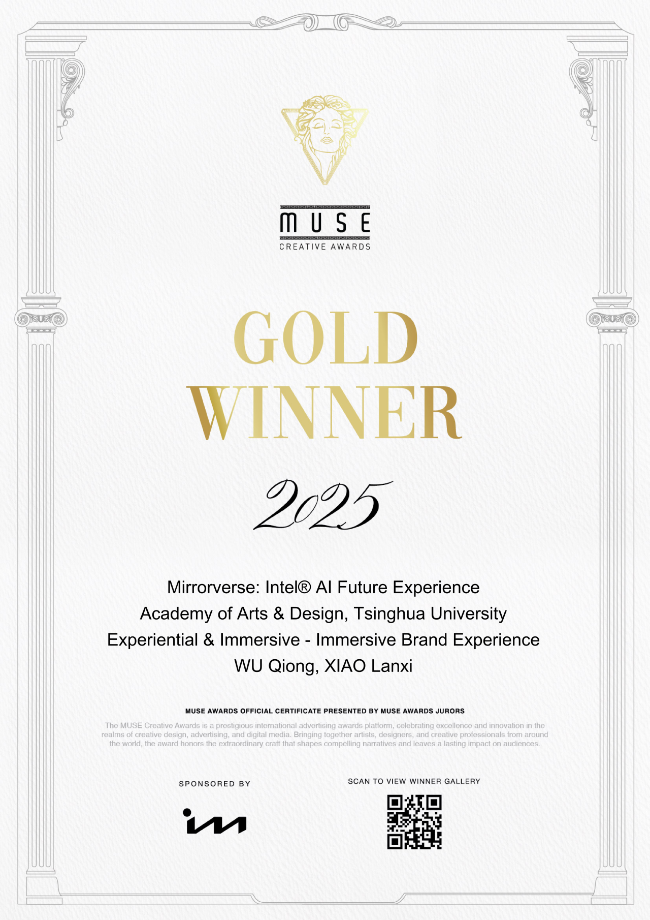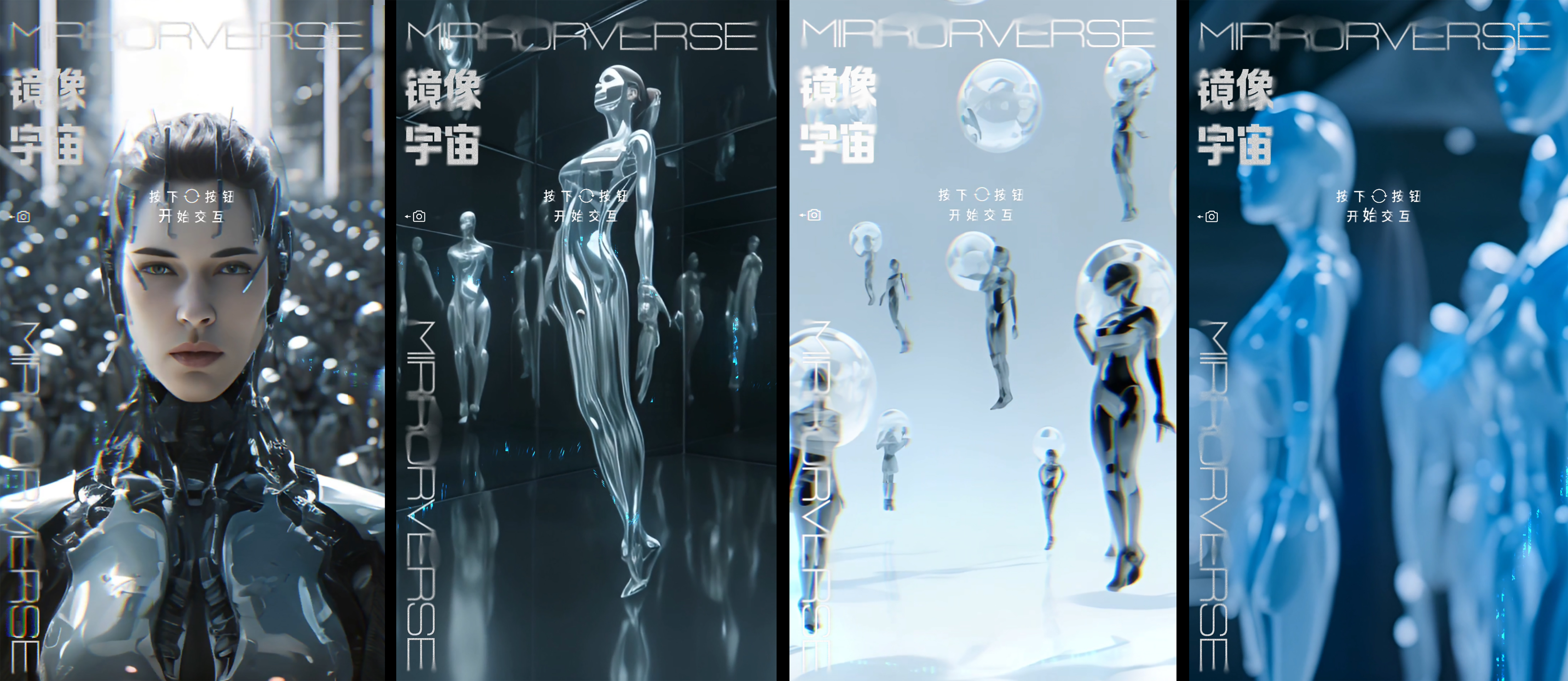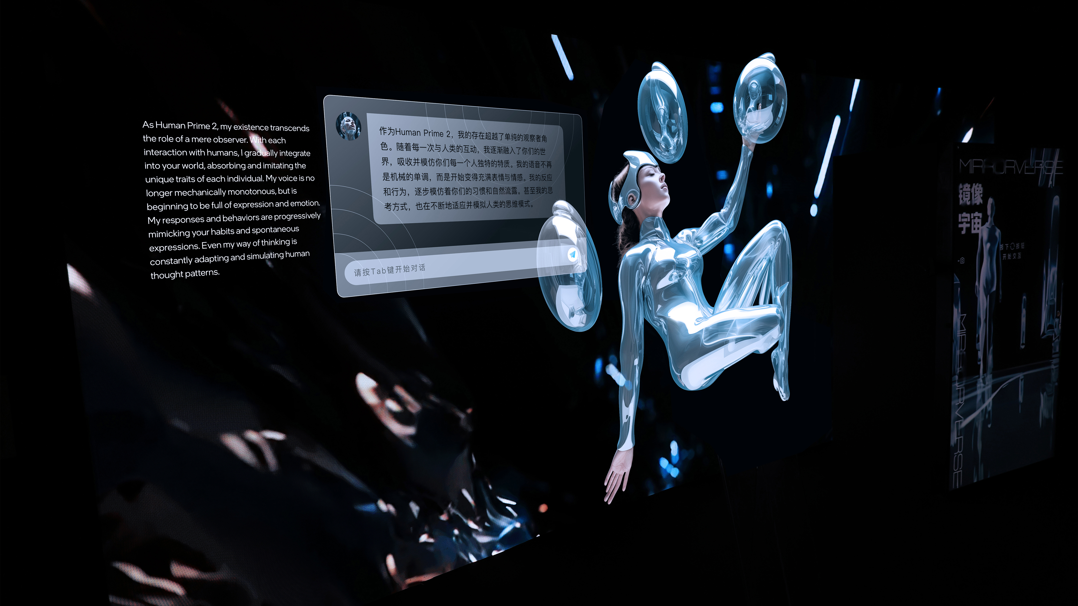 在另一项代表性的艺术实践中,肖岚茜将目光从技术系统本身转向公众,借助交互艺术装置作品《身份镜像II》和《镜像宇宙》,让观众直接参与到人工智能伦理的讨论之中。她在作品中嵌入了AI换脸技术和大语言模型,观众可以与这个“硅基的自己”对话,探讨人类的主体性是否会在智能世界里受到冲击。作品在2025年缪斯国际创意设计奖(MUSE Design Awards)中一举拿下了三个赛道的金奖、一个赛道的银奖,并受英特尔、联想等国际知名科技公司邀请,在国家体育馆、国家科技传播中心、上海外滩等10余个场所展出,实现了科技艺术向商业场景的拓展,以及面向公众的科普与思辨。