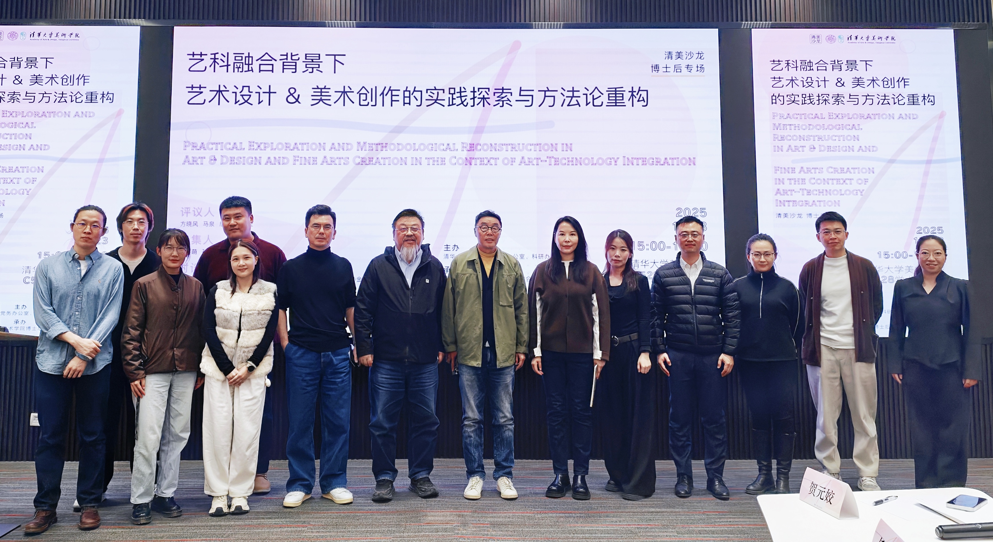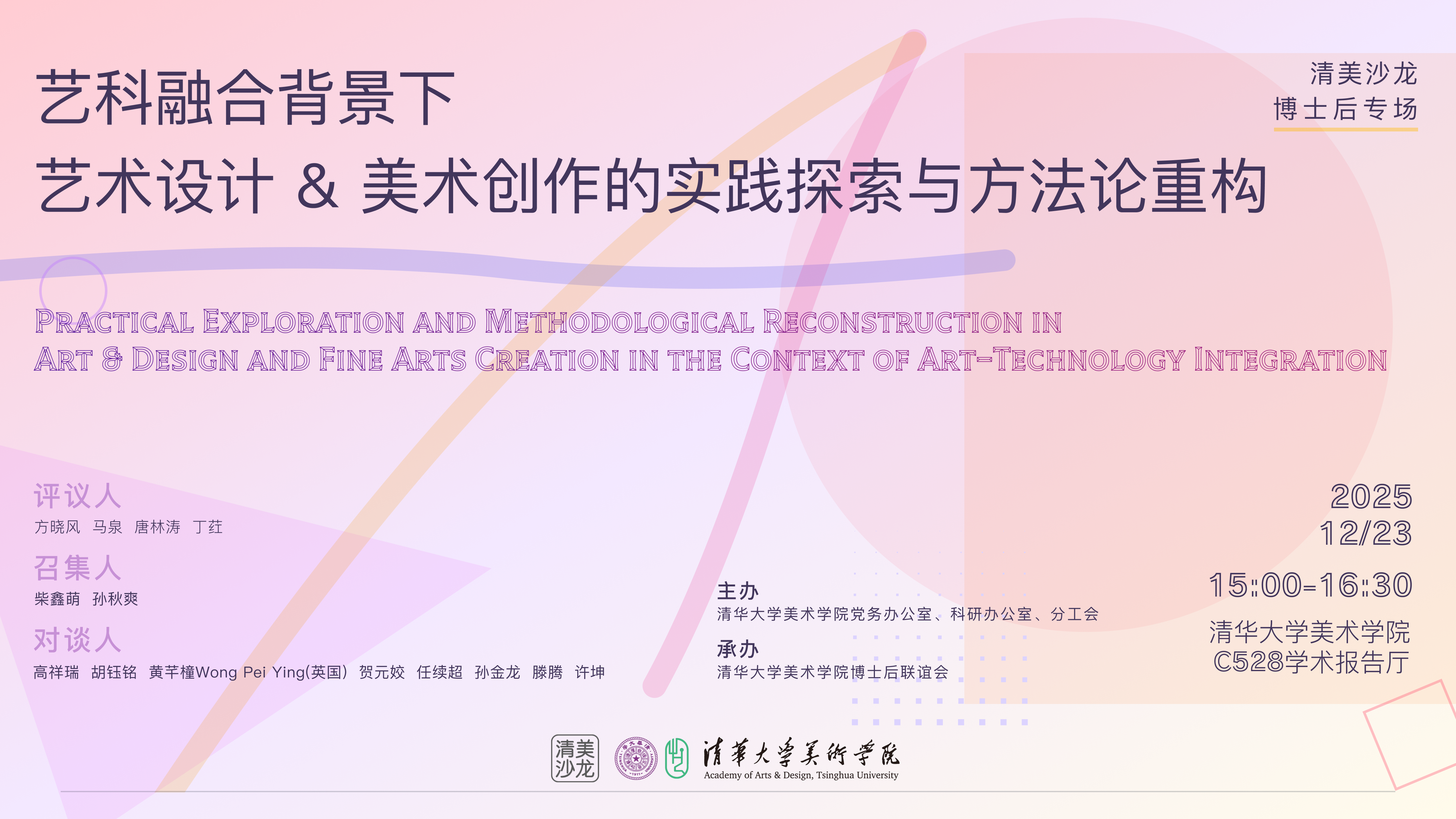 清华大学美术学院院长吴琼,《装饰》杂志主编方晓风教授,学院学术委员会委员马泉教授,清华大学博士后校友会艺术分委会理事唐林涛教授,研究生工作组组长丁荭副教授出席沙龙。本次活动召集人为学院在站博士后柴鑫萌与孙秋爽,主旨分享为高祥瑞、胡钰铭、黄芊橦(Wong Pei Ying 英国)、贺元姣、任续超、孙金龙、滕腾、许坤。沙龙围绕“艺科融合背景下艺术设计&美术创作的实践探索与方法论重构”这一主题展开。