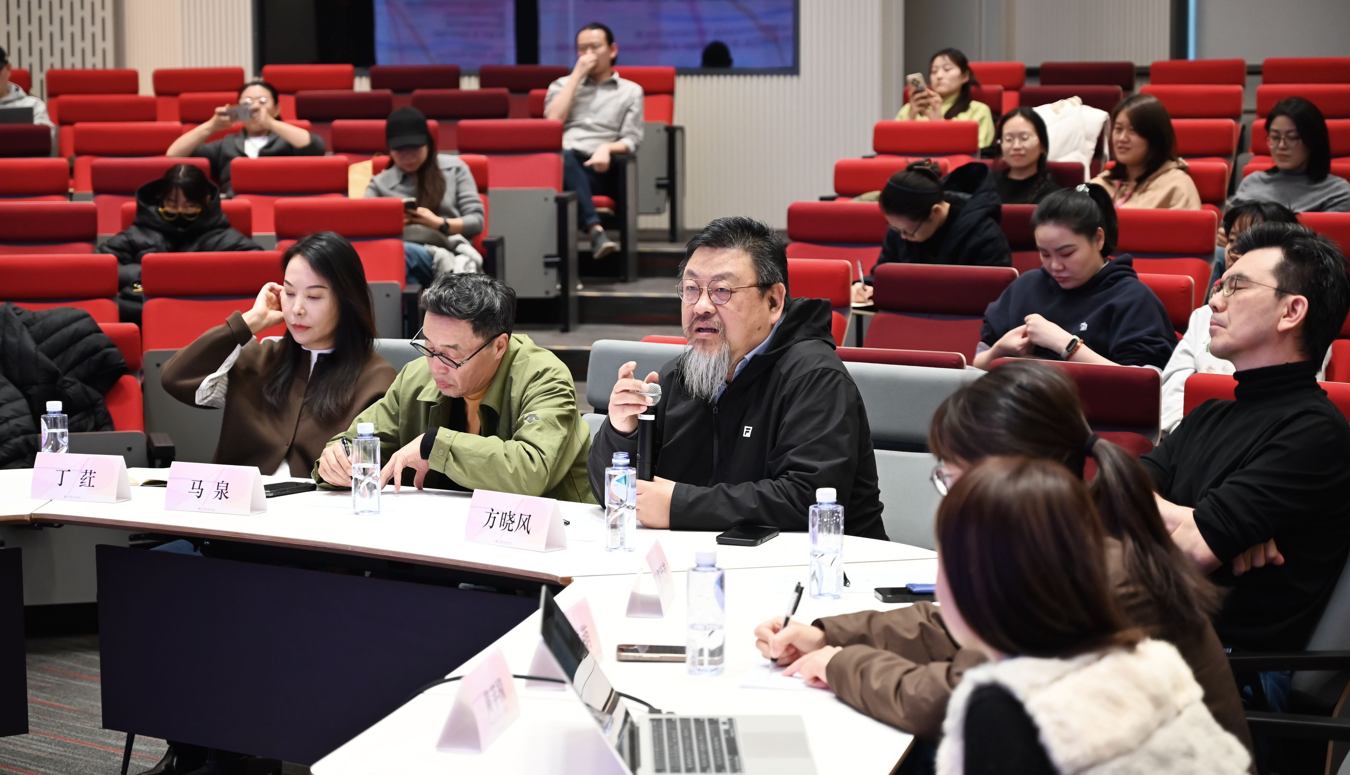 评议环节,四位教授围绕学科边界、创作思维与展览实践等议题展开了讨论。多位老师强调在当代艺术与设计实践中应淡化学科分野,倡导以问题为导向的研究方式,主张将议题置于具体语境中分析,以增强思考的锐度与深度。方晓风教授强调研究应避免空泛,“限制条件的不断深入,往往反映你对问题的了解深度。”马泉教授呼吁:“真正珍贵的是个体。你的任务是想说什么、如何说、用什么来说——这是构建个人语法的全部。”唐林涛教授以“游牧”作喻,鼓励青年学者行走于学科城邦之间,勇敢探索“无主之地”。丁荭副教授则温柔提醒,在学术化探索中需“时常回望‘最初的冲动’,保持与内心感知的鲜活连接”。