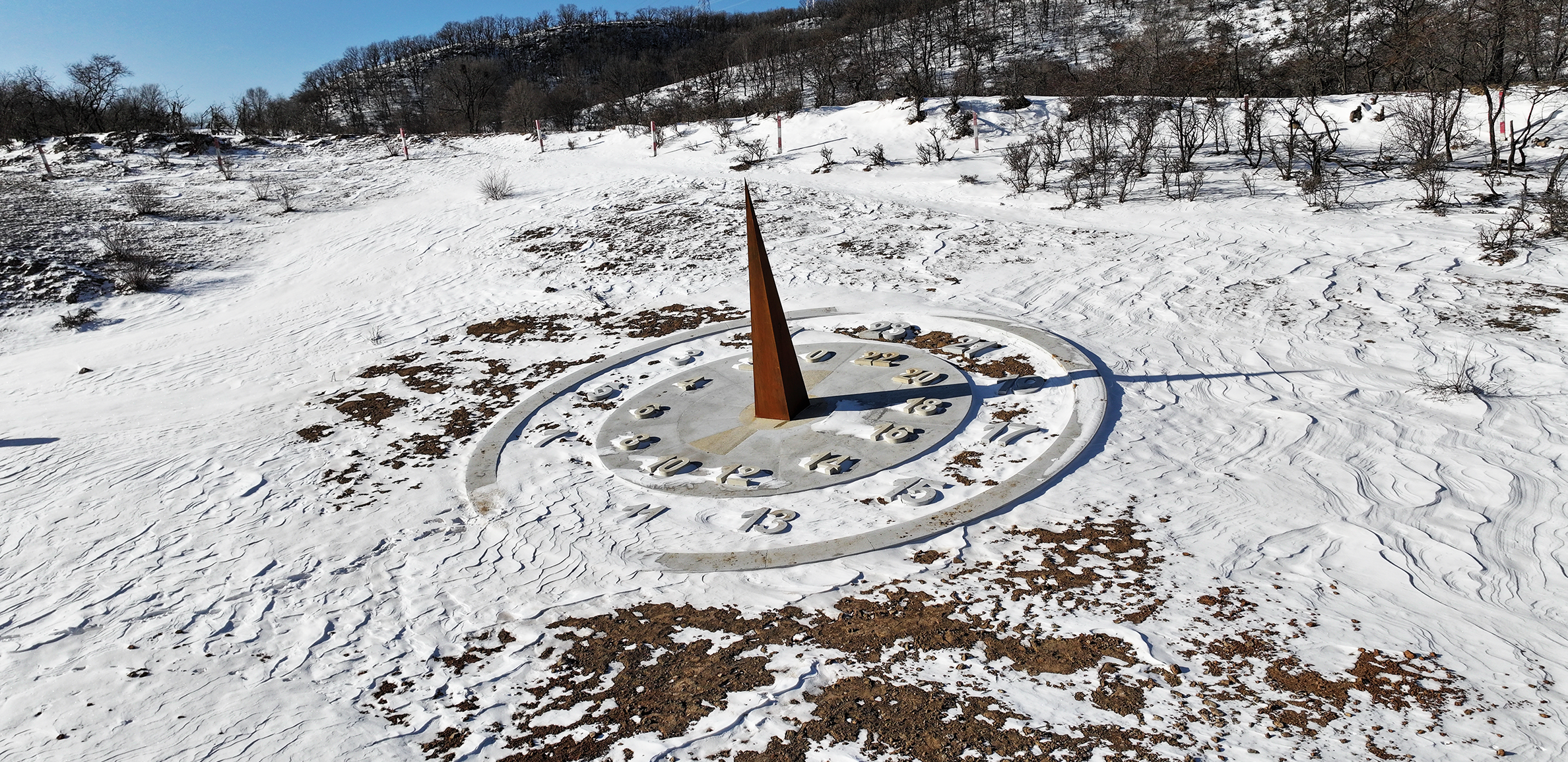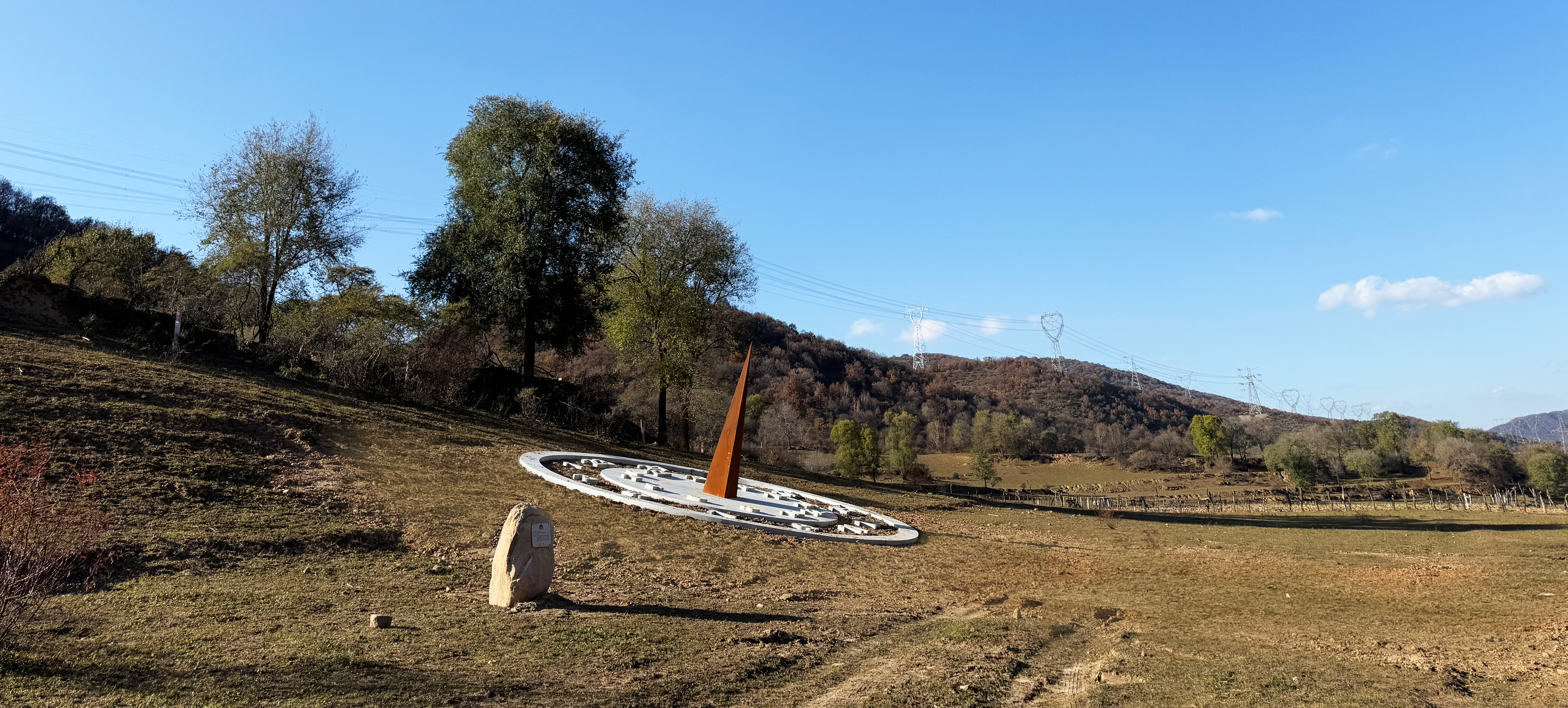 作品以质朴的石头雕琢为晷针与刻度,使其自然嵌入大地,融于起伏的茵茵草甸,宛如大地之灵显现的古老计时,揭示时间即自然本身的生命脉动。