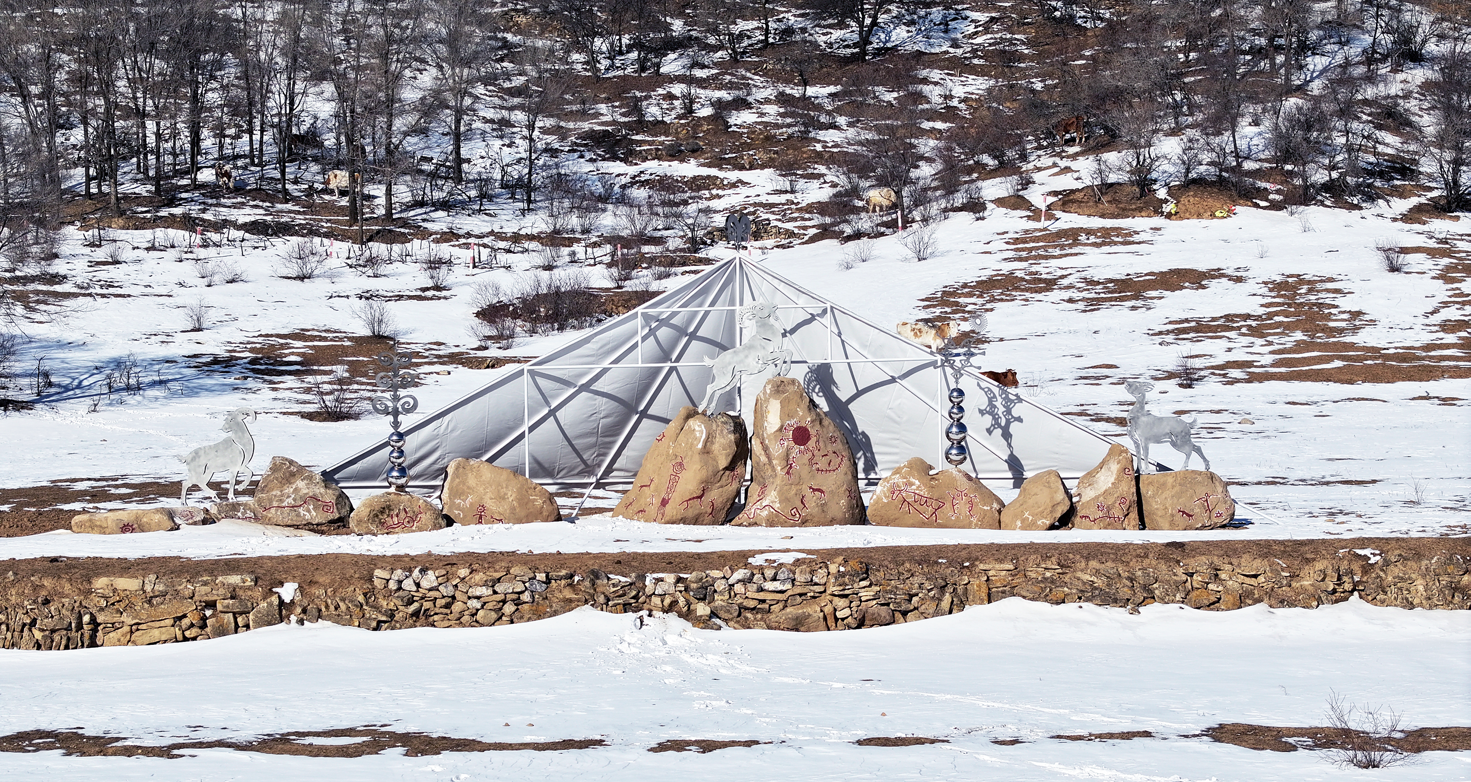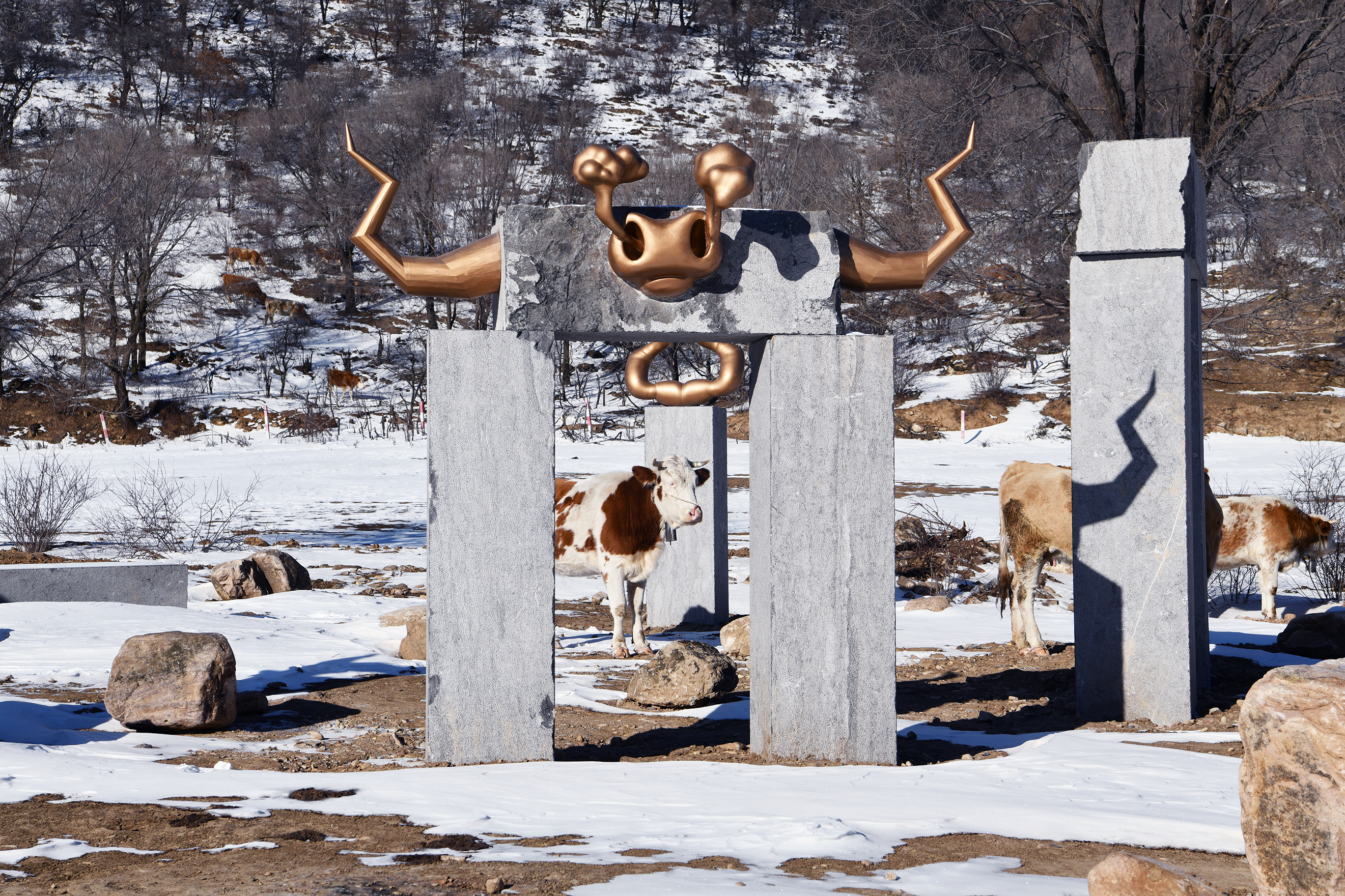作品将羊角、牛角等与石头阵列融合,分别将它们安置在自然阵列石头上,在阳光照射下,这些角散发出金光。形成趣味性的景观装置,同时,这些造型可转化为文创产品。
