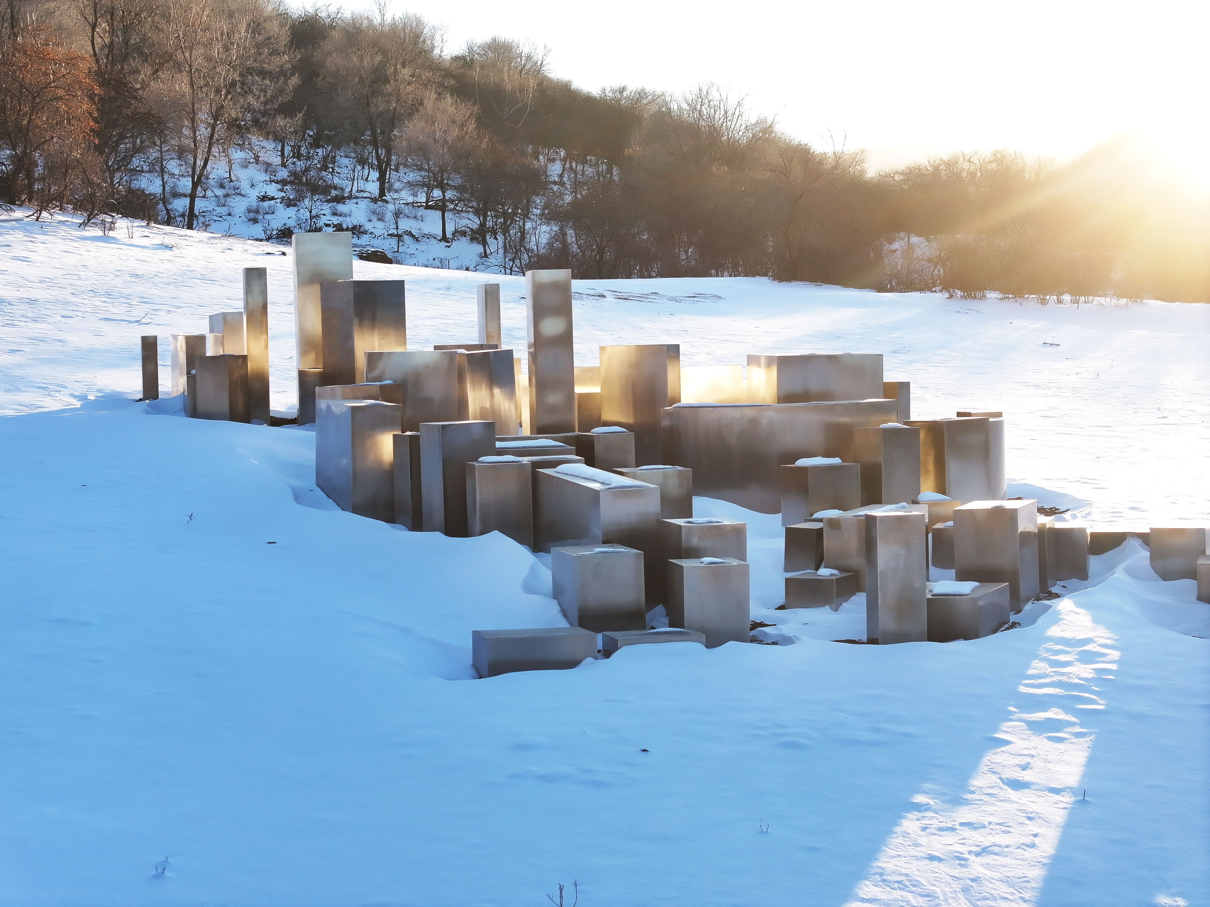 作品采用不锈钢材质创作,柱体高度、截面尺寸各不相同,按古文字“弓阳”字形列成矩阵。方柱表面做拉丝处理,整体布局从山坡上呈波浪式高度递减排列,以中心为高点向两端降低。展现弓阳村的自然风景与文化元素,实现了材质功能与艺术表达的结合。