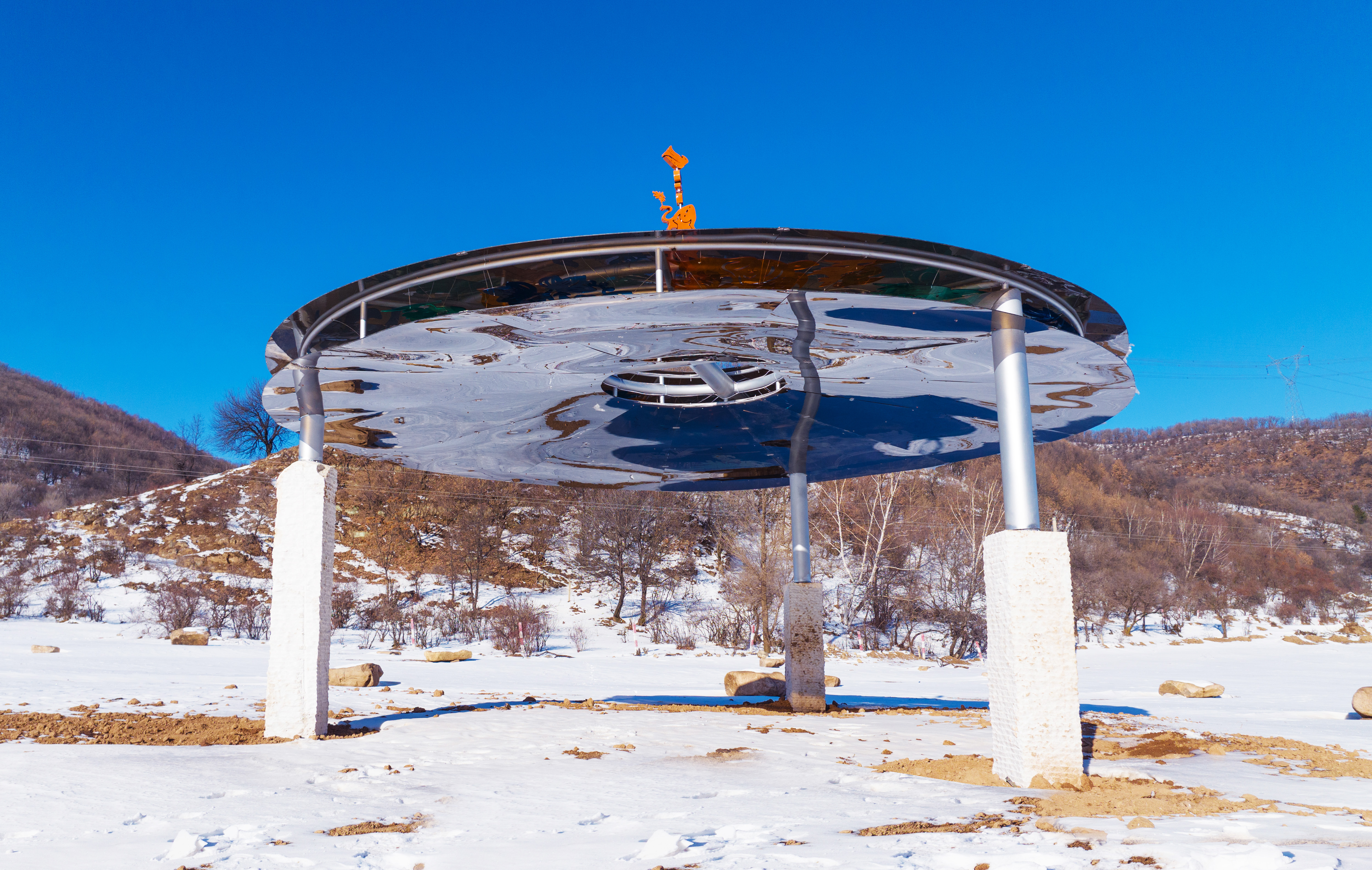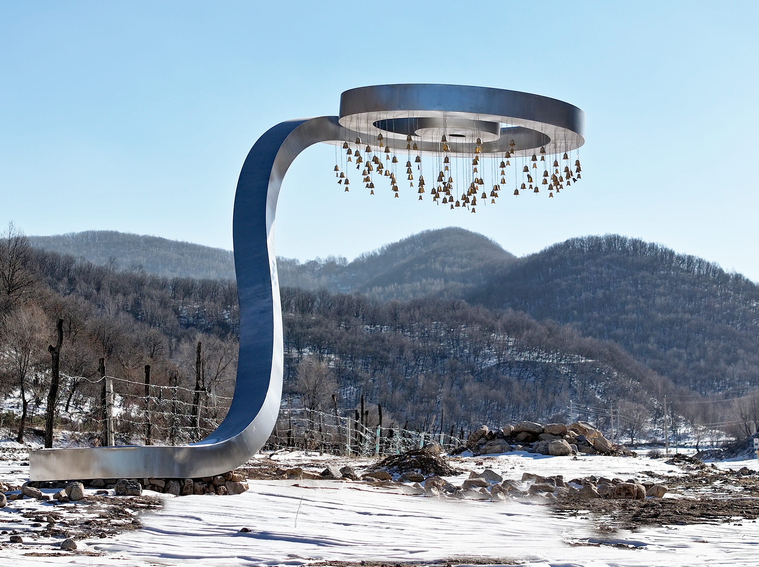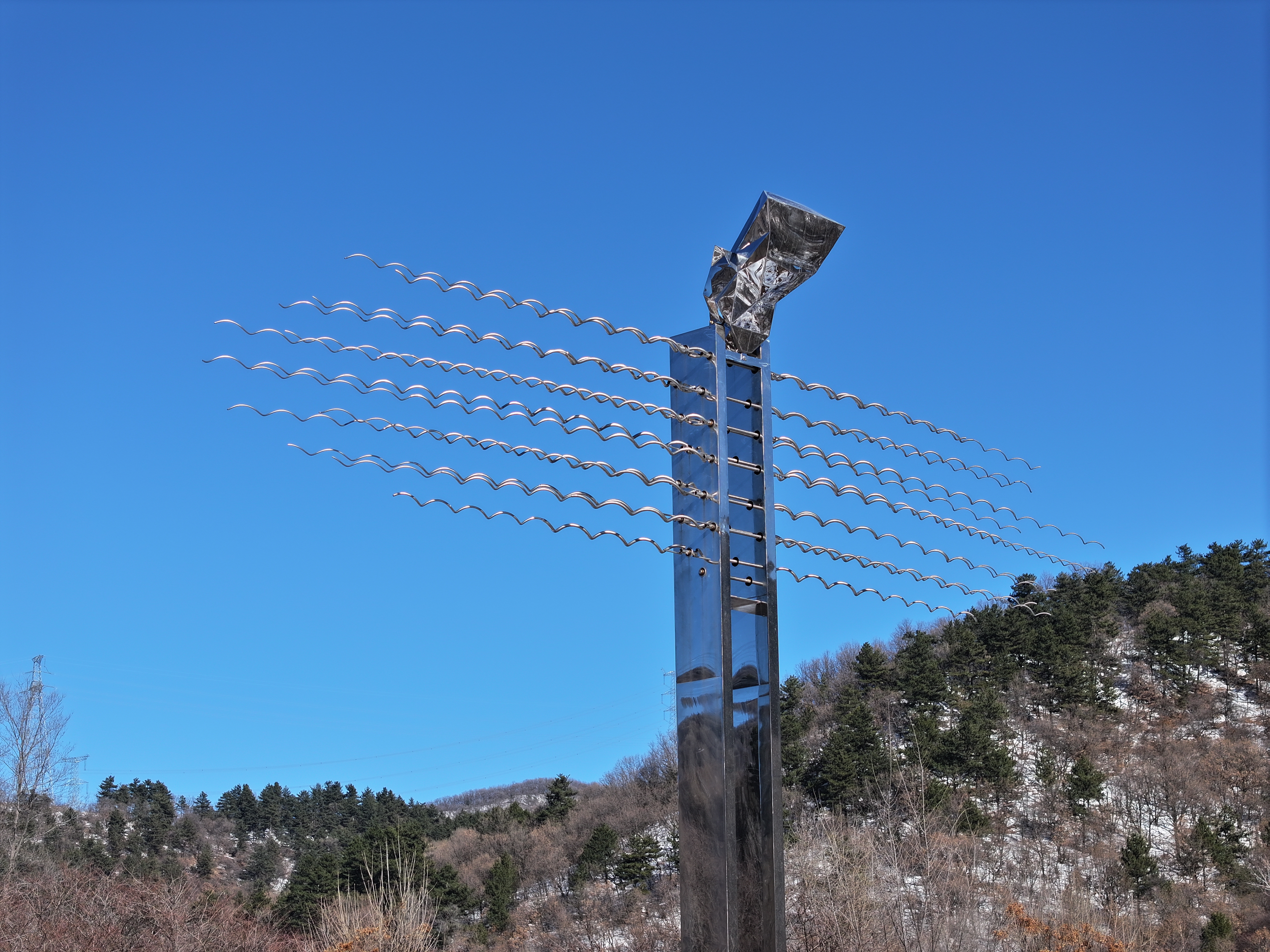 作品用具有弓阳气质的符号将画转换为雕塑,雕塑利用山灵传说制造悬念,以抽象牛头为造型,放置于山包上,体现见山灵首不见尾的悬念和神秘感。牛头顶部设置开放空间,当观众进入内部空间时,牛角处的镜面不锈钢会折射出远处的风景。