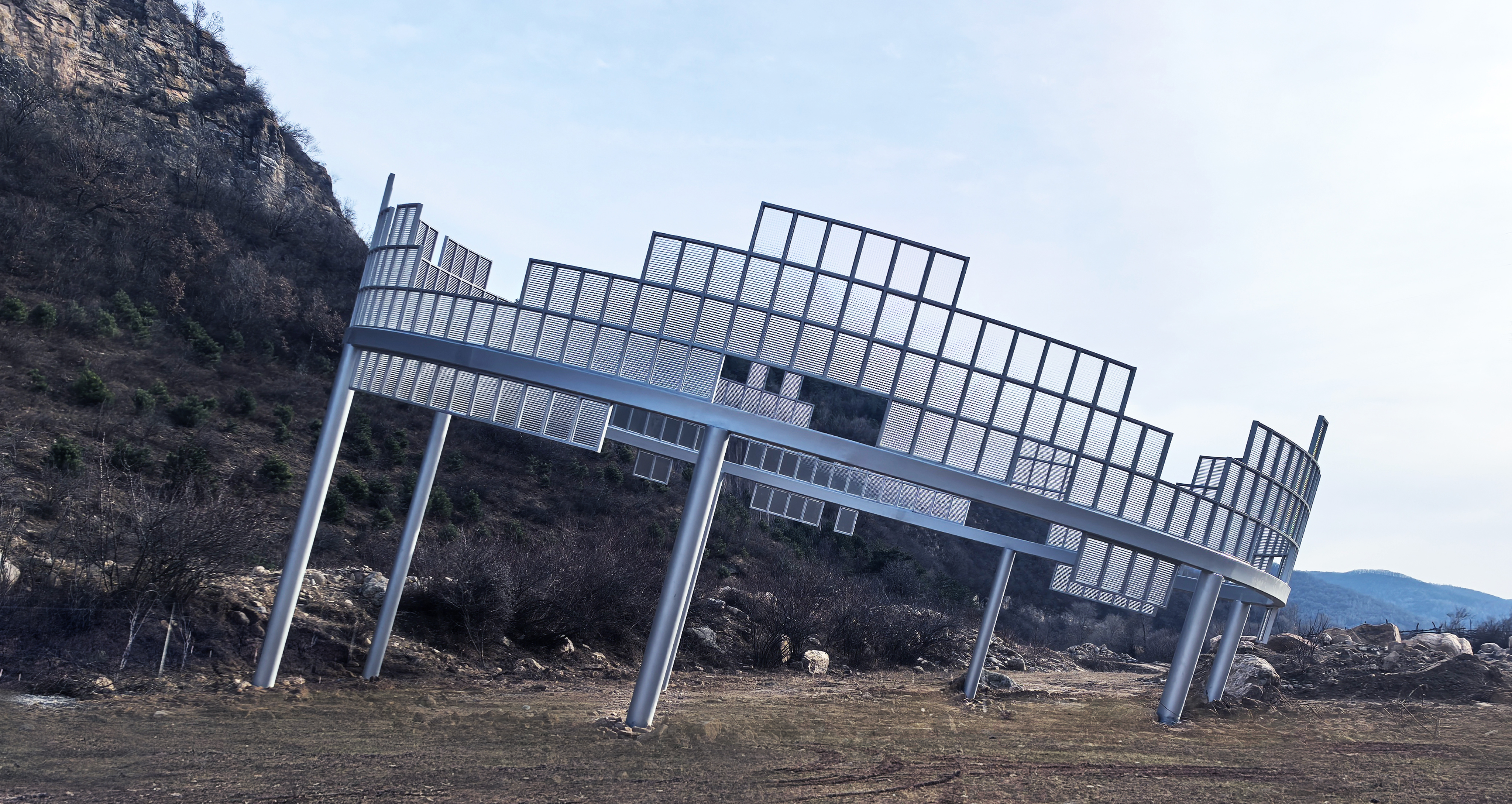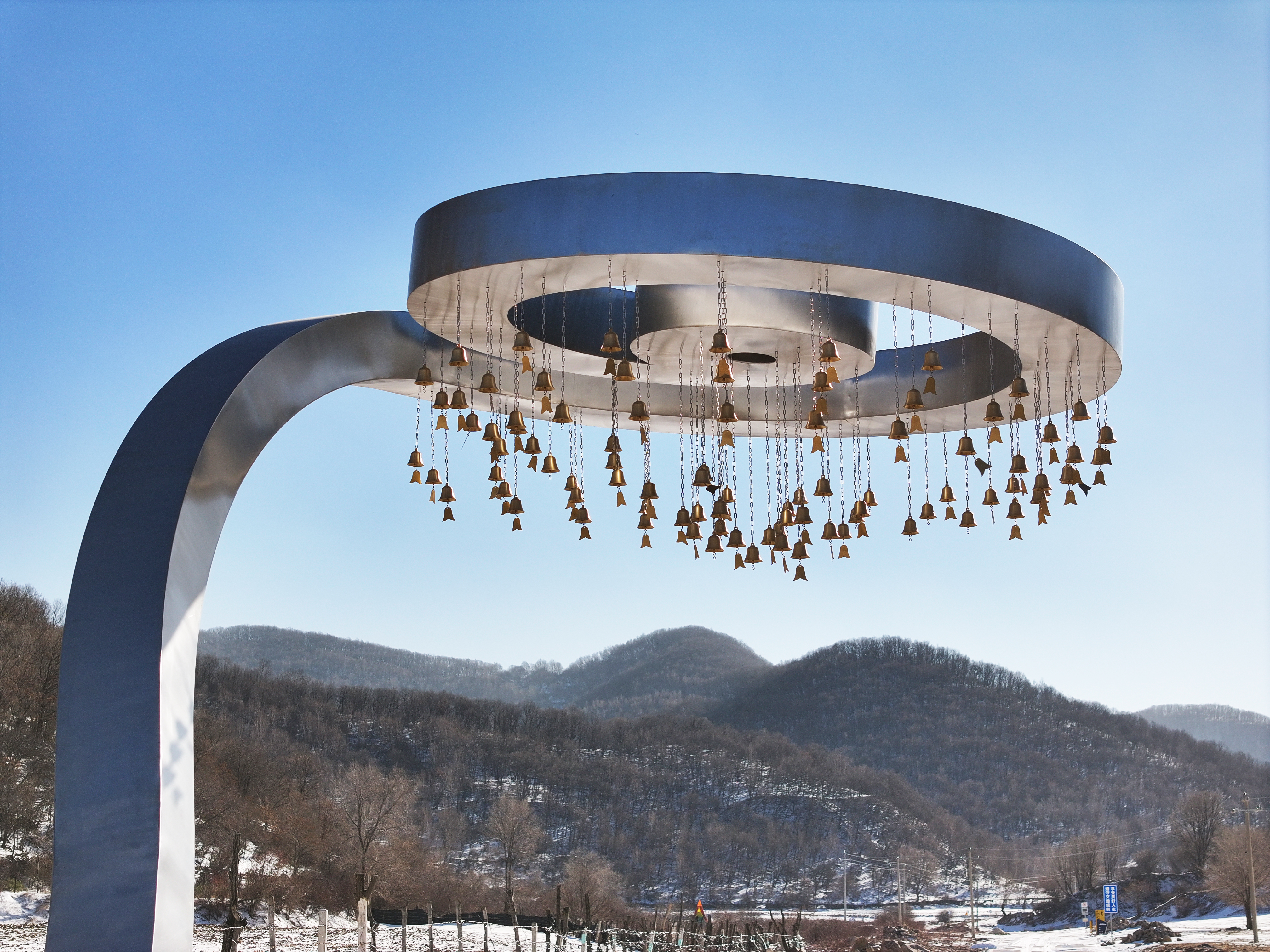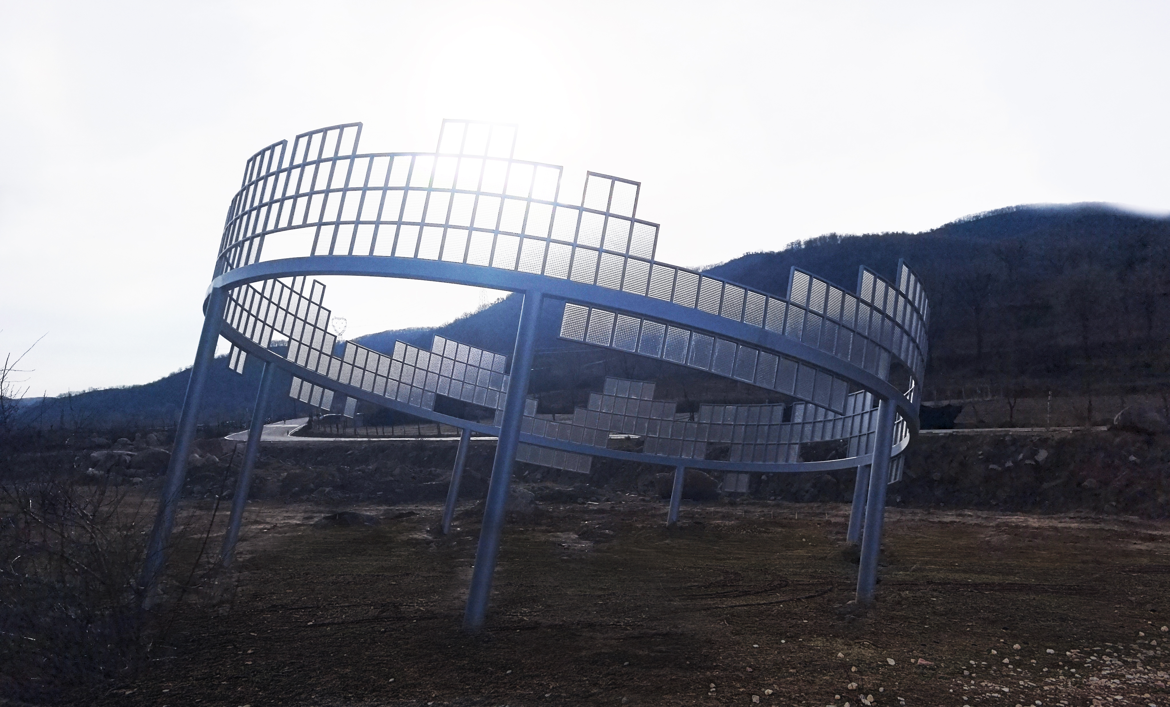 作品用具有弓阳气质的符号将画转换为雕塑,雕塑利用山灵传说制造悬念,以抽象牛头为造型,放置于山包上,体现见山灵首不见尾的悬念和神秘感。牛头顶部设置开放空间,当观众进入内部空间时,牛角处的镜面不锈钢会折射出远处的风景。