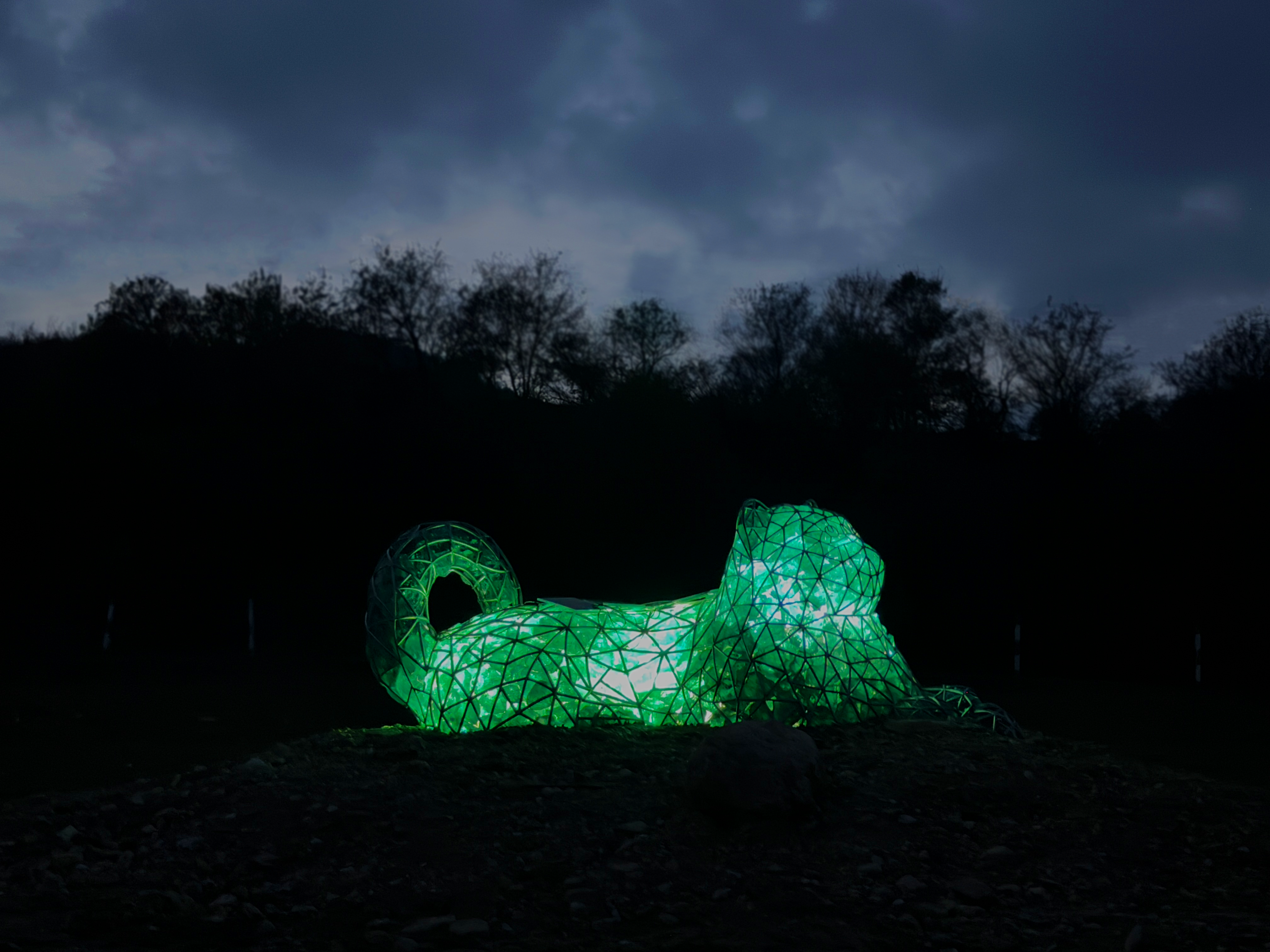 作者用金属框架勾勒出猫的轮廓,蓝色透明石头填充其中,内部安置灯光,刚柔并济。金属的冷峻与彩石的斑斓碰撞,带来奇妙而又充满灵气的视觉感受。