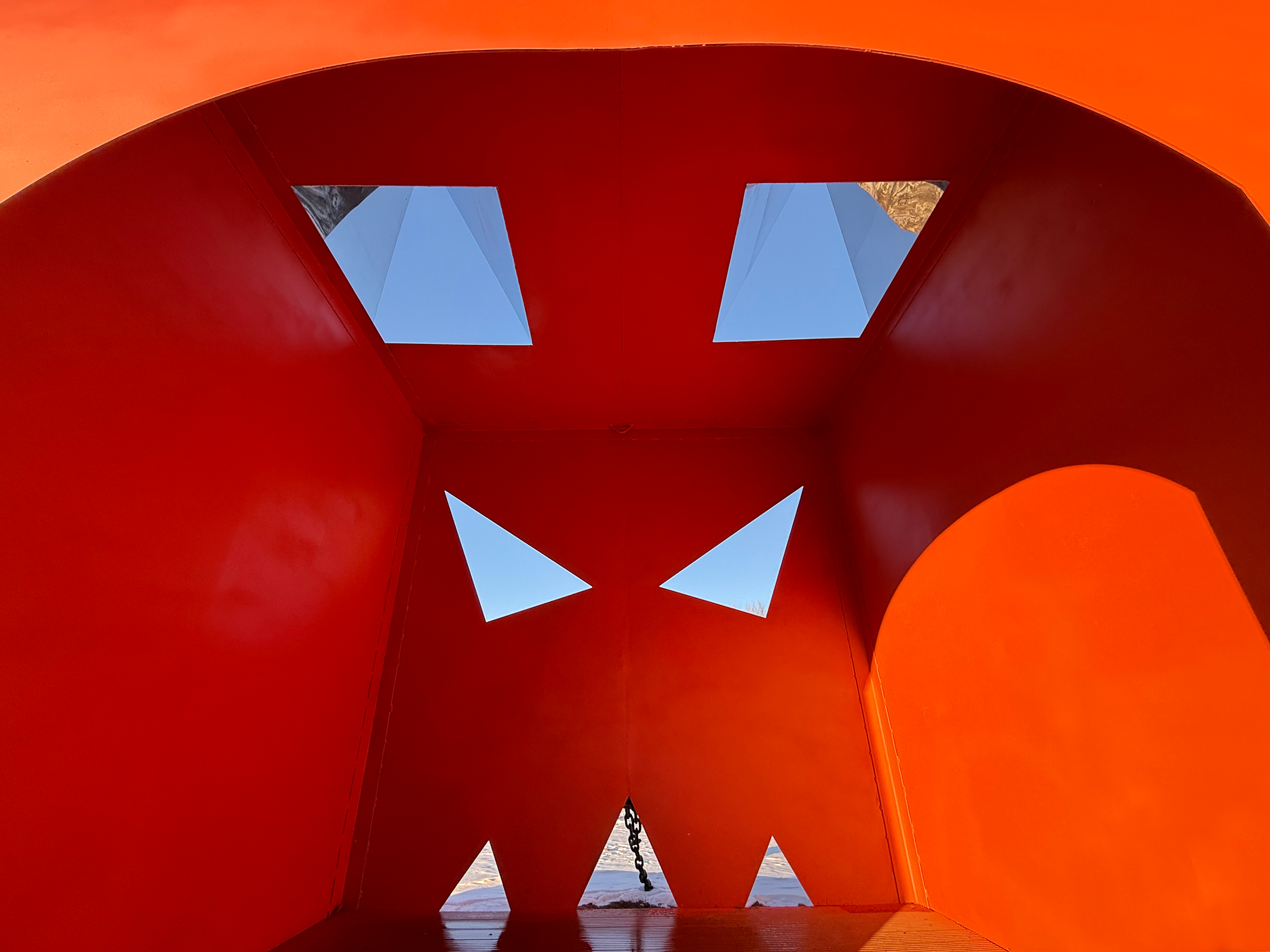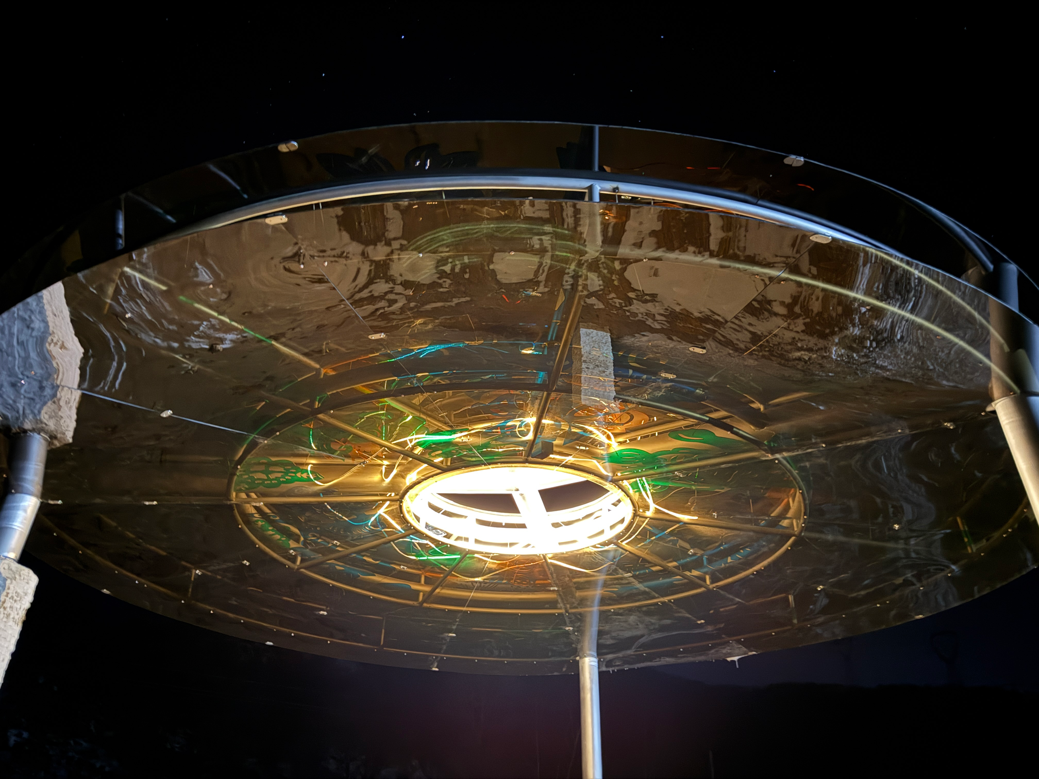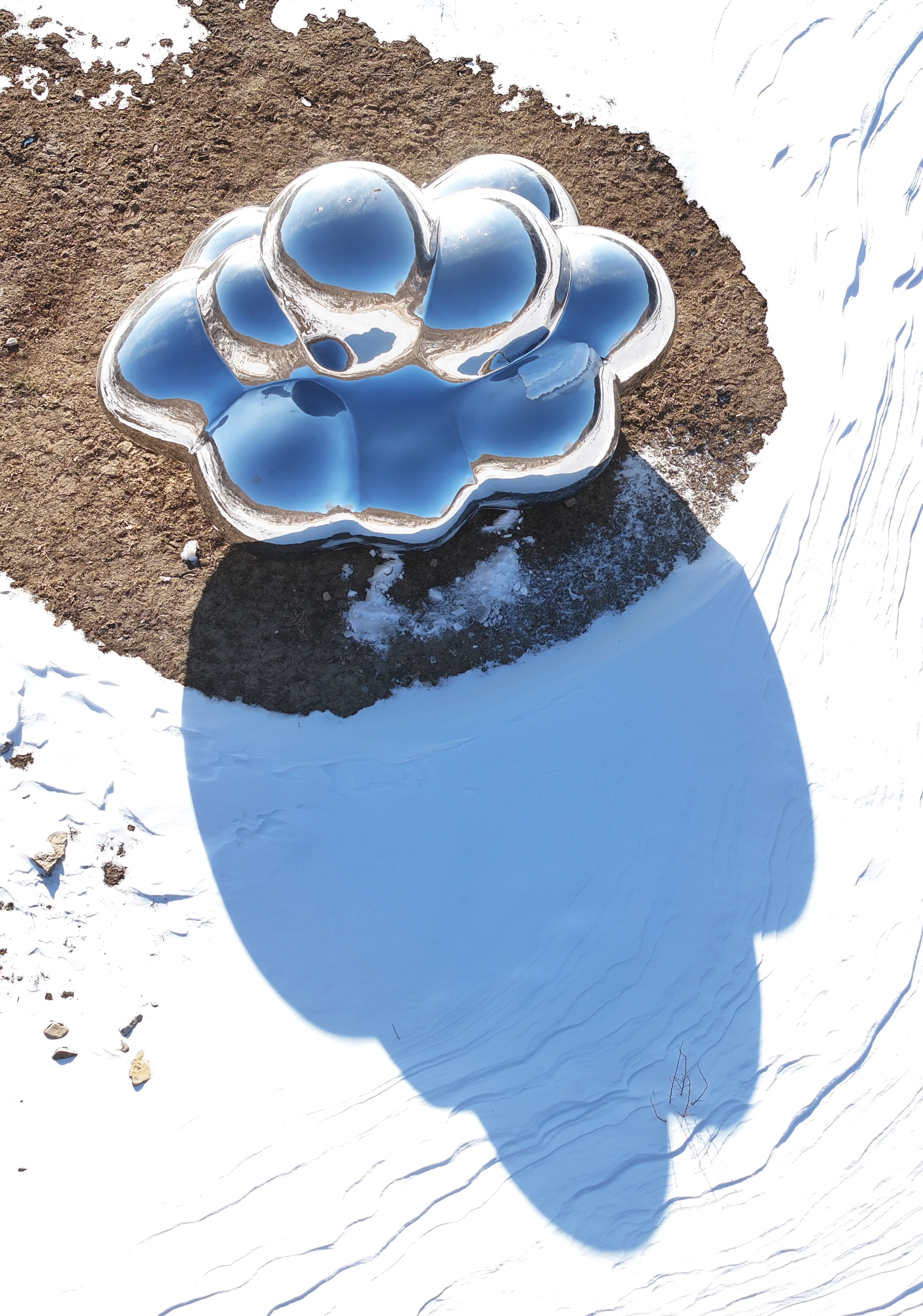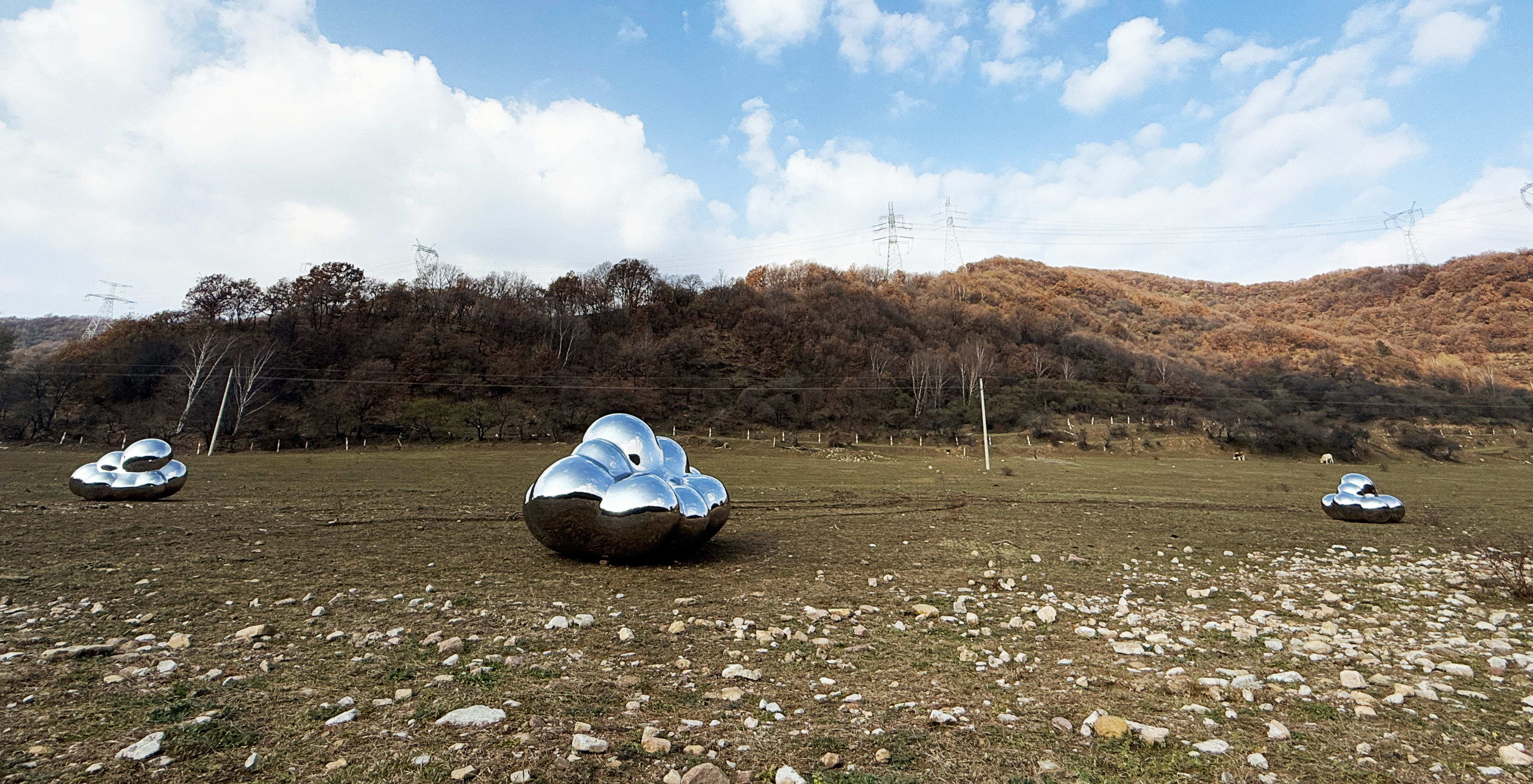 装置以弧面仰角朝向天空,抛光表面实时反射流云、飞鸟与天光,使蓝天成为流动的画卷。低侧边缘没入草地,与真实的树丛、放牧的牛群自然衔接。当观众躺卧于弧面之上,身体将融入倒影——视线掠过镜中浮云,延伸至远山、树木、吃草的牛群,最终与镜中的自己相遇,完美复现诗中“仰观天地,万物见我”的视角循环。镜面在此成为自然与人文的双重隐喻:既呈现“云知道”的苍穹之镜,又揭示“你也知道”的自我觉知。