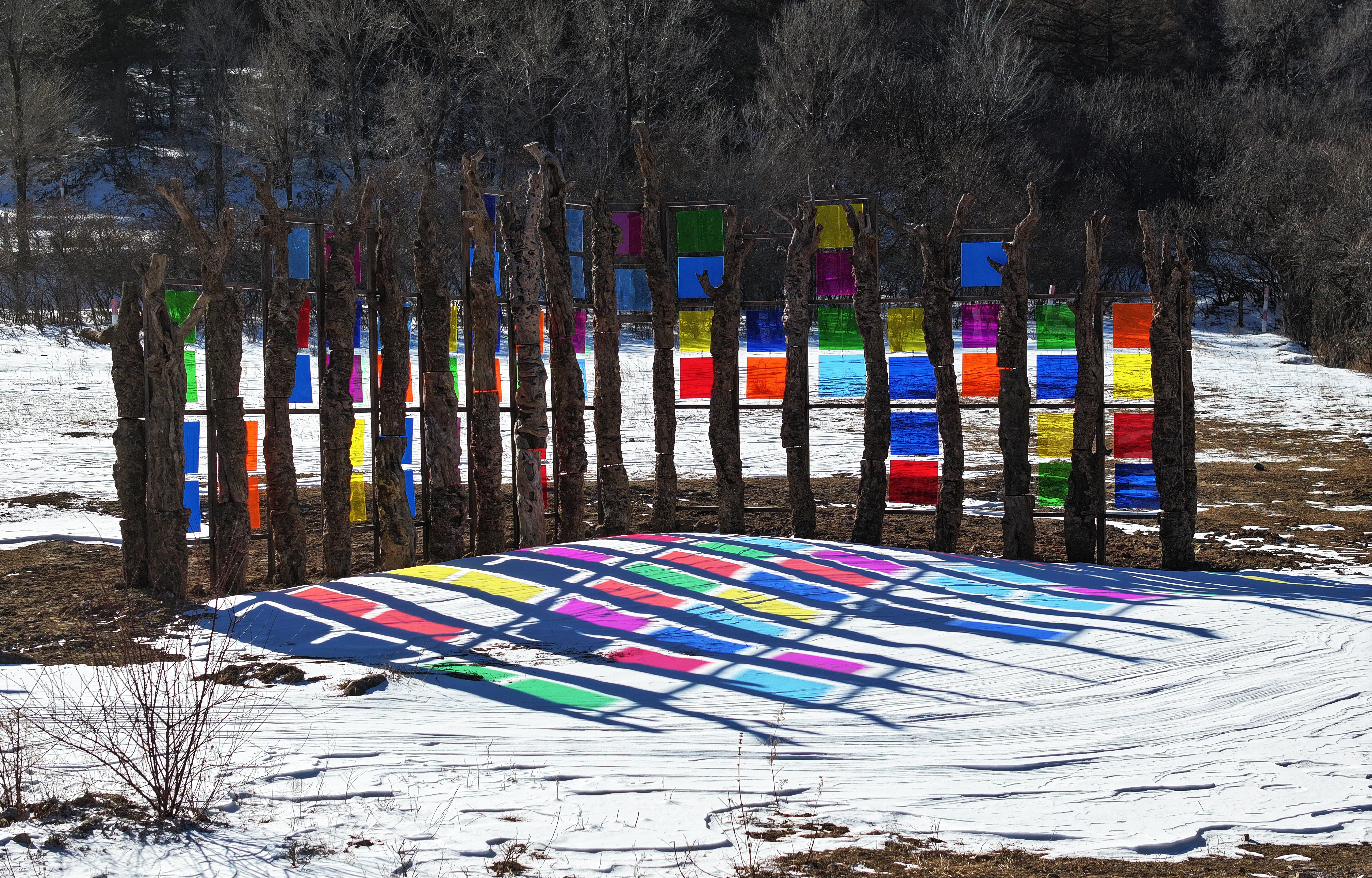 原木的肌理承载着时间的记忆,彩光在木质缝隙间流转,如同山灵若隐若现的踪迹。作品以极简的材质语言,构建出一个连接物质与精神的灵性空间。