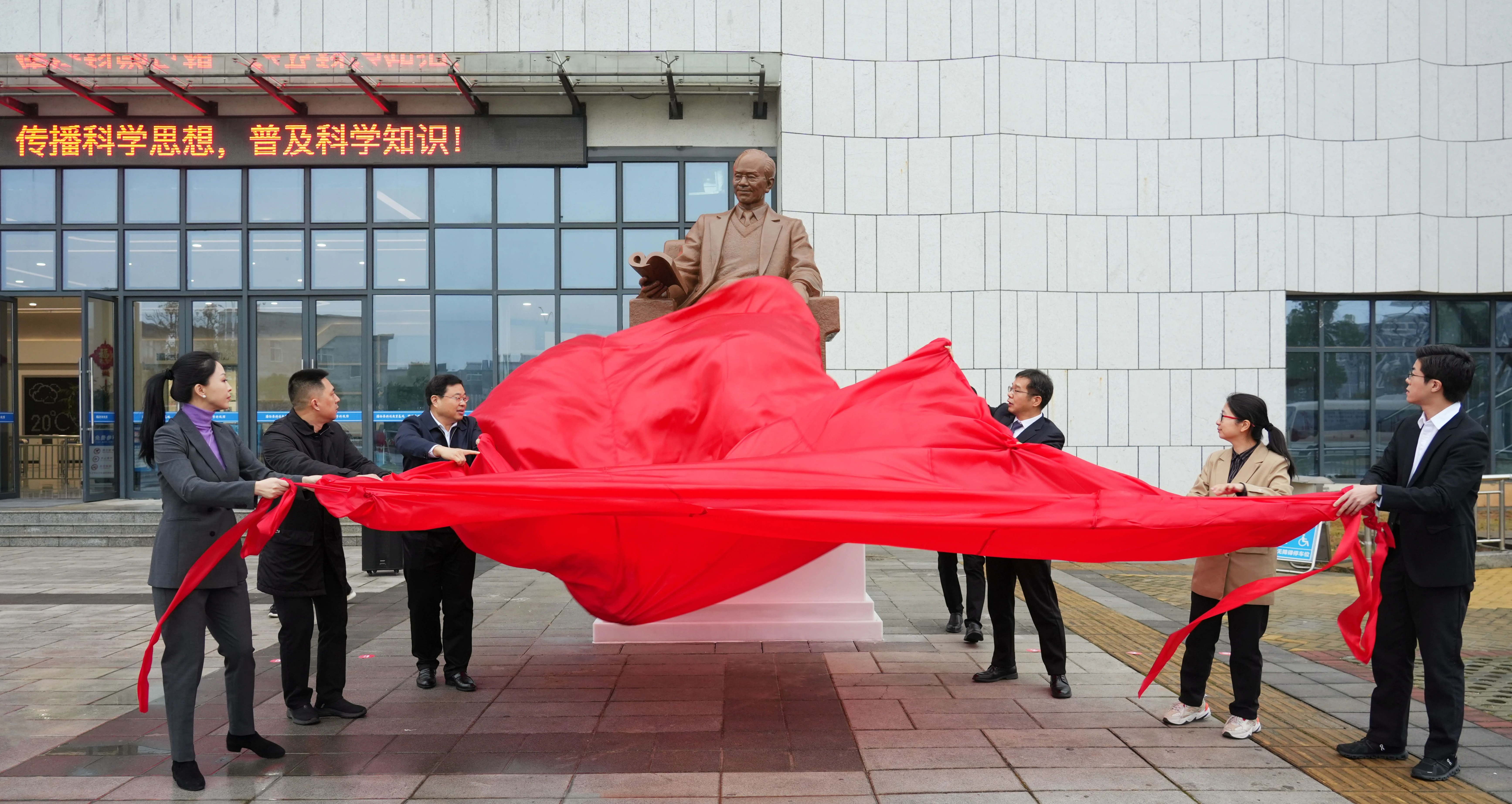 周明、卓雨晴、李涓、卢治轩、吴松以及潘际銮院士家属潘晨炜为雕像揭幕,高阔主持落成仪式