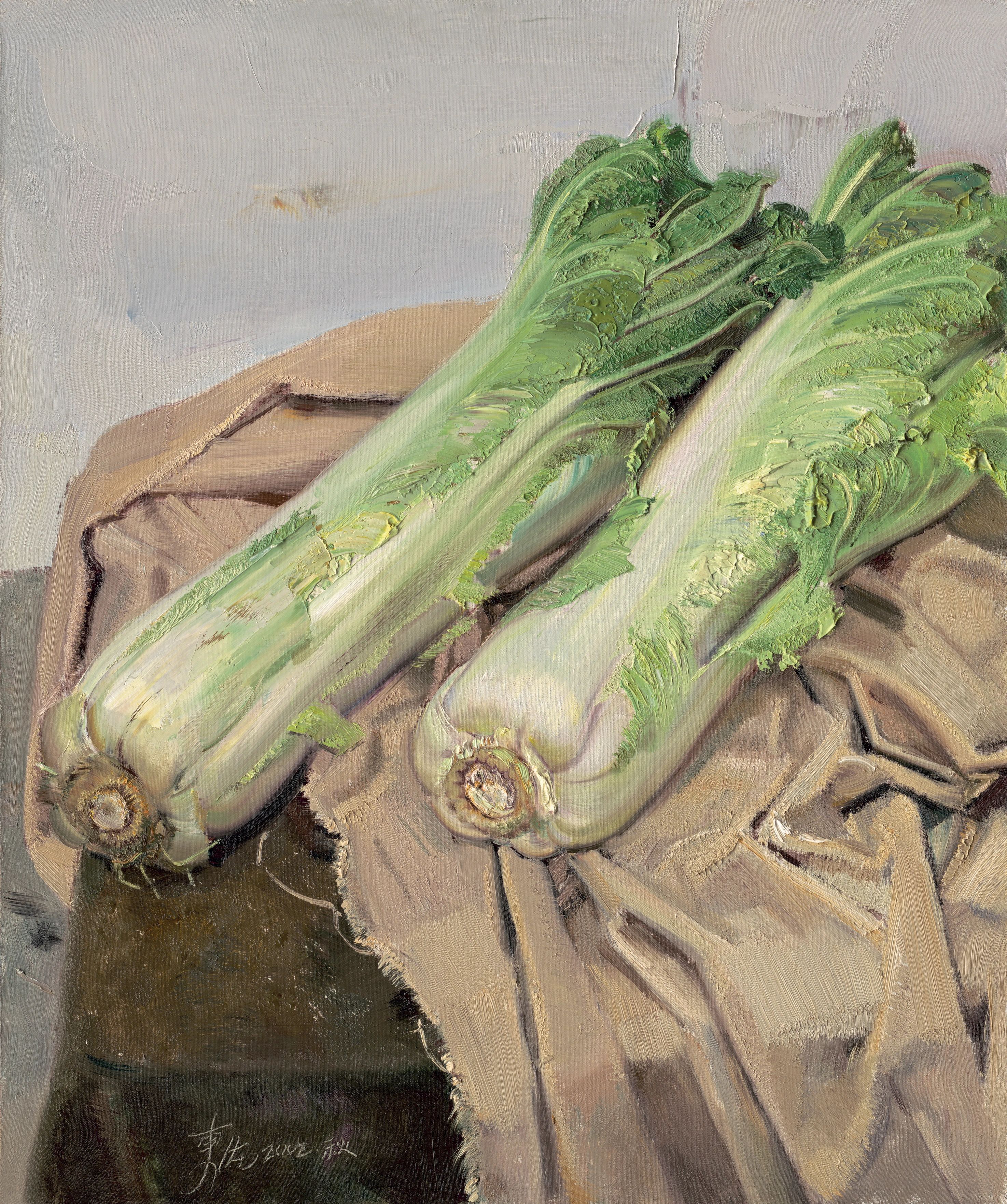 第五部分【土地的信物】,着重展示其笔下的白菜、石榴、桃子等静物。这些寻常物象,在他笔下转化为深沉的情感符号。