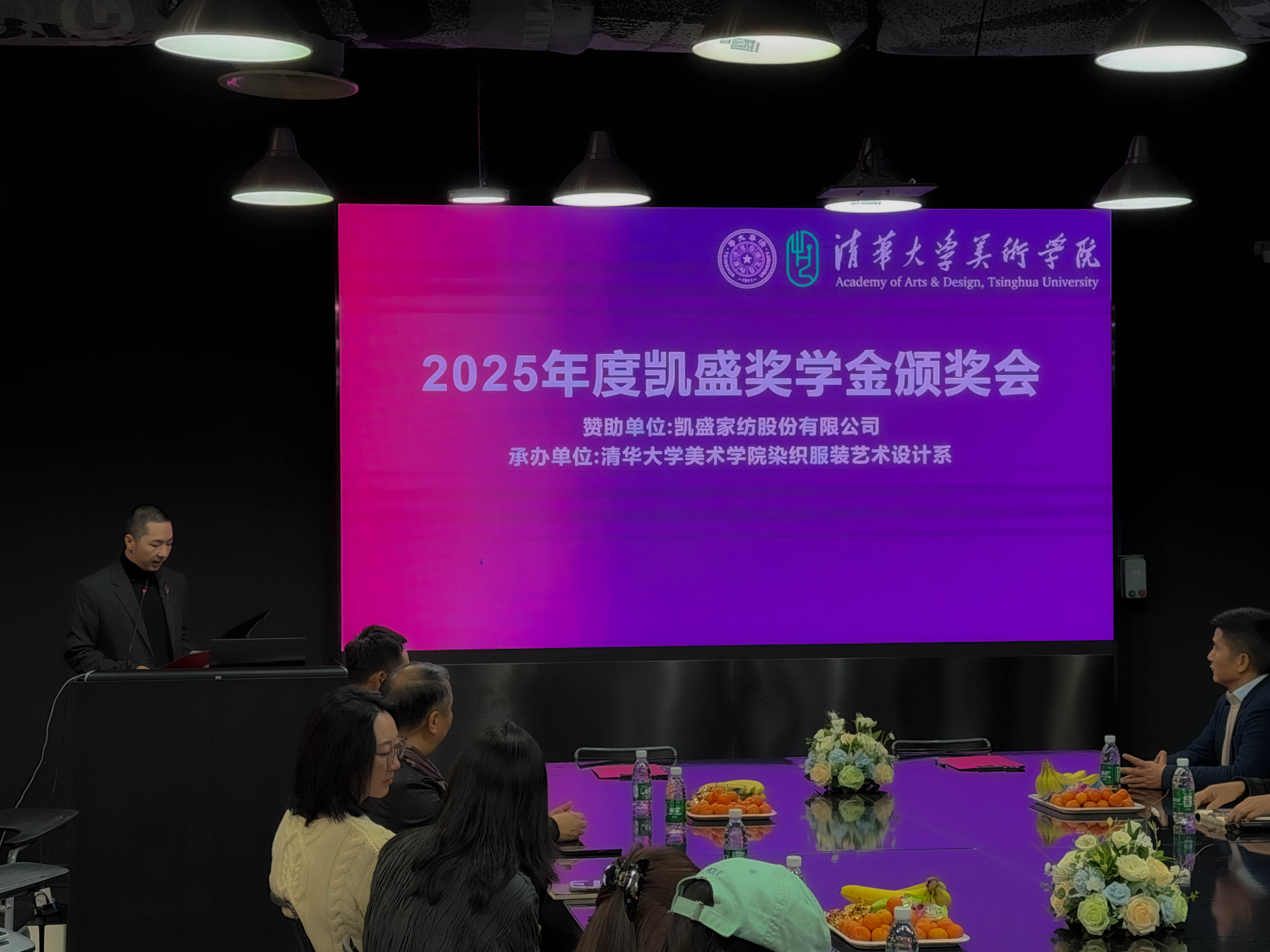 2026年1月9日,清华大学美术学院染织服装艺术设计系师生齐聚一堂,举行2025年度“凯盛奖学金”颁奖会。凯盛家纺股份有限公司创始人秦瑞岗、研发总监姜帅、营运中心总监王丁等企业代表,清华美院副院长李迎军,染织服装艺术设计系主任张宝华、党支部书记王悦,清华美院党委学生工作组组长张红娟,助理教授臧杰等学院老师,以及30余名染织服装艺术设计系研究生与本科生共同参与,见证校企合作新篇章。本次活动由副教授刘亚主持。