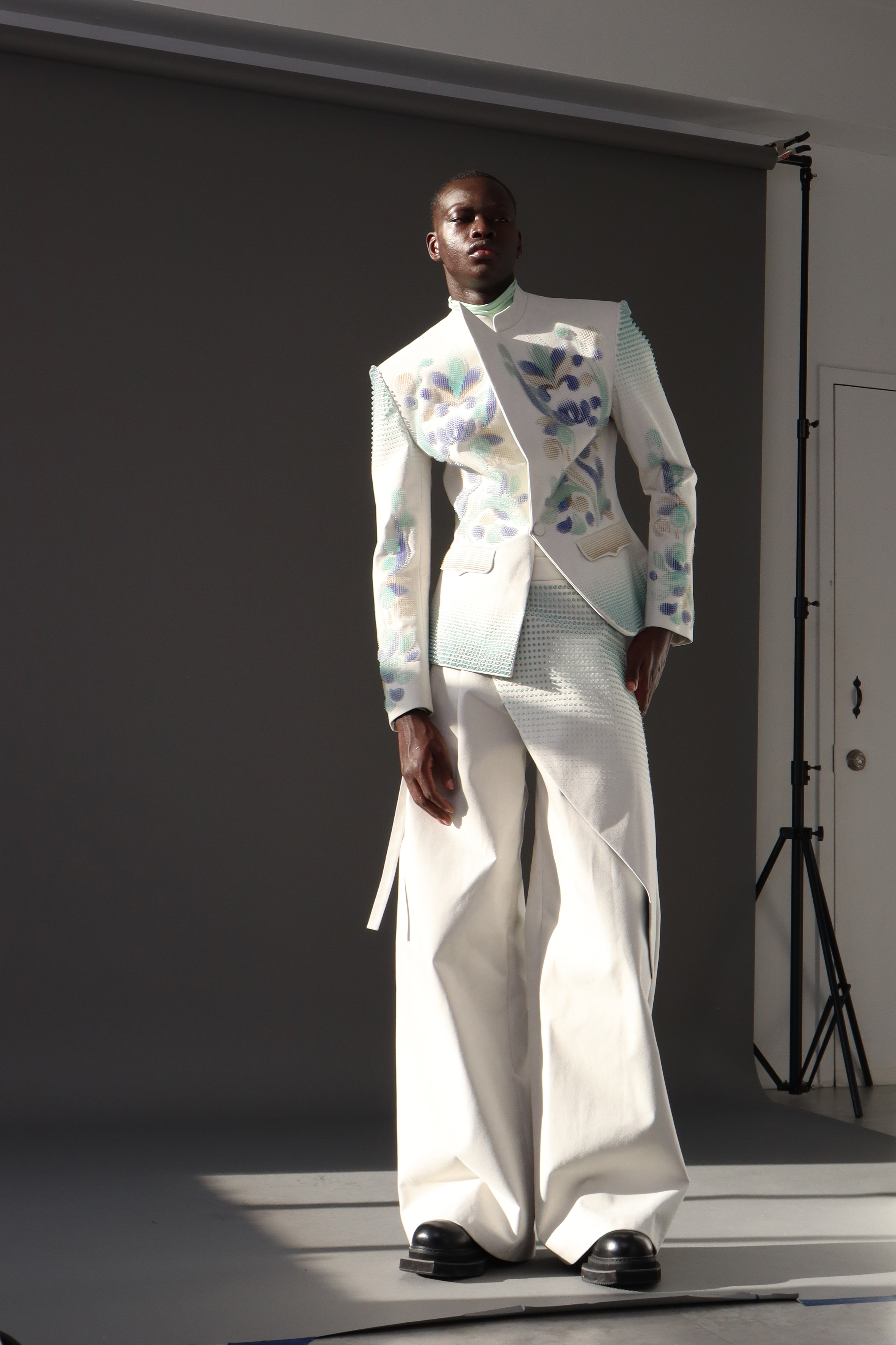 展览也集中呈现了清华美院在敦煌艺术研究与传承中形成的多元合作成果。学院通过与香港理工大学、湖北美术学院、湖北省时尚艺术研究中心、中国轻纺城建管委等机构的持续合作,推动敦煌主题在不同教学体系、研究平台与应用场景中的深化与拓展。文化校服设计《智鉴狮音》是清华美院与中国轻纺城建管委合作的项目成果,作品以敦煌图案意象为灵感,结合智能纺织与中式传统服装结构创新设计,体现了学术研究向实用产品转化的产业联动机制。在校际合作层面,作品《NO.328》源于清华美院与香港理工大学的长期合作,在敦煌艺术研究的基础上引入数字建模与3D打印时尚技术,探索传统文化在数字语境中的新形态表达。《丝路妙音》、《凤仪敦煌》是清华美院与湖北美术学院、湖北省时尚艺术研究中心合作完成的敦煌主题作品,以当代设计语言回应敦煌图像与精神内涵。这些作品共同表明,敦煌艺术的当代生命力,正通过开放的协作网络与前沿的科技语言持续迸发新的活力。