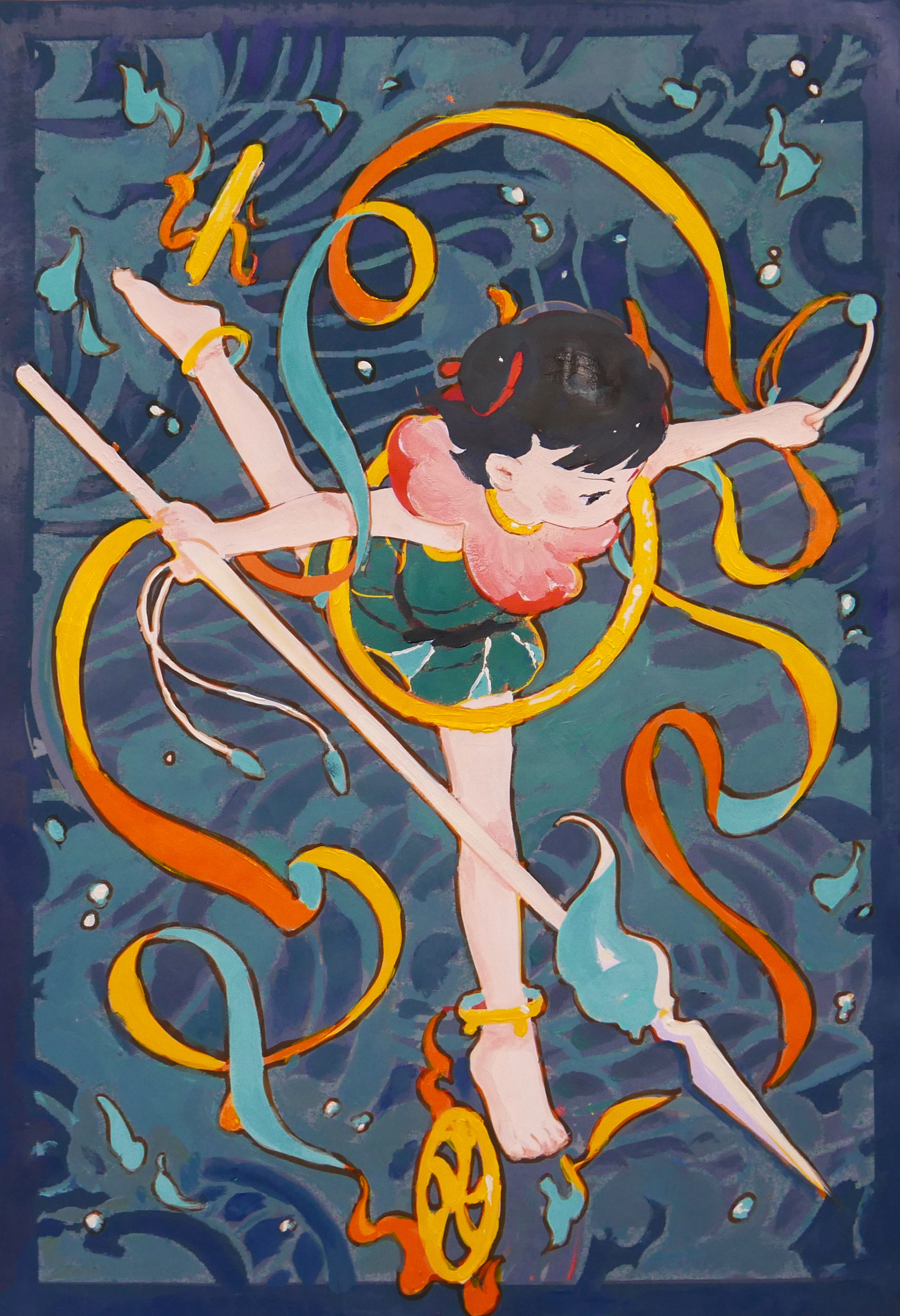 装饰艺术不仅存在于平面,也服务于立体空间,在环境设计、建筑设计、工业设计等领域均有广泛应用。因此,在进行设计实践之前,对于空间感的培养尤为重要。在“空间与构图”教学板块中,如何将图案、叙事或观念融入平面或立体空间,拓展装饰艺术的维度,进行综合性的设计表达,是训练的主要目标。为了突破课堂教学的局限性,我们精心设置了极具趣味性和参与感的环节。如在讲授克孜尔石窟、莫高窟等古代石窟的装饰艺术时,我们会组织学生来到一间空旷的教室,在墙上悬挂高清打印的壁画复原图,并将室内光源全部隔绝,让同学们分批次进入教室,仅借助手电筒的光线进行局部观看。这样的训练方式,是为了尽可能模拟石窟内的场景,让学生摒弃一览全局的便捷,学会沉下心研读每一处线条、每一组纹样的排布巧思,身临其境地感受壁画、造像上的图案或纹样从平面空间到立体空间的转化,逐步建立起由点到面、由局部到整体的感知能力。