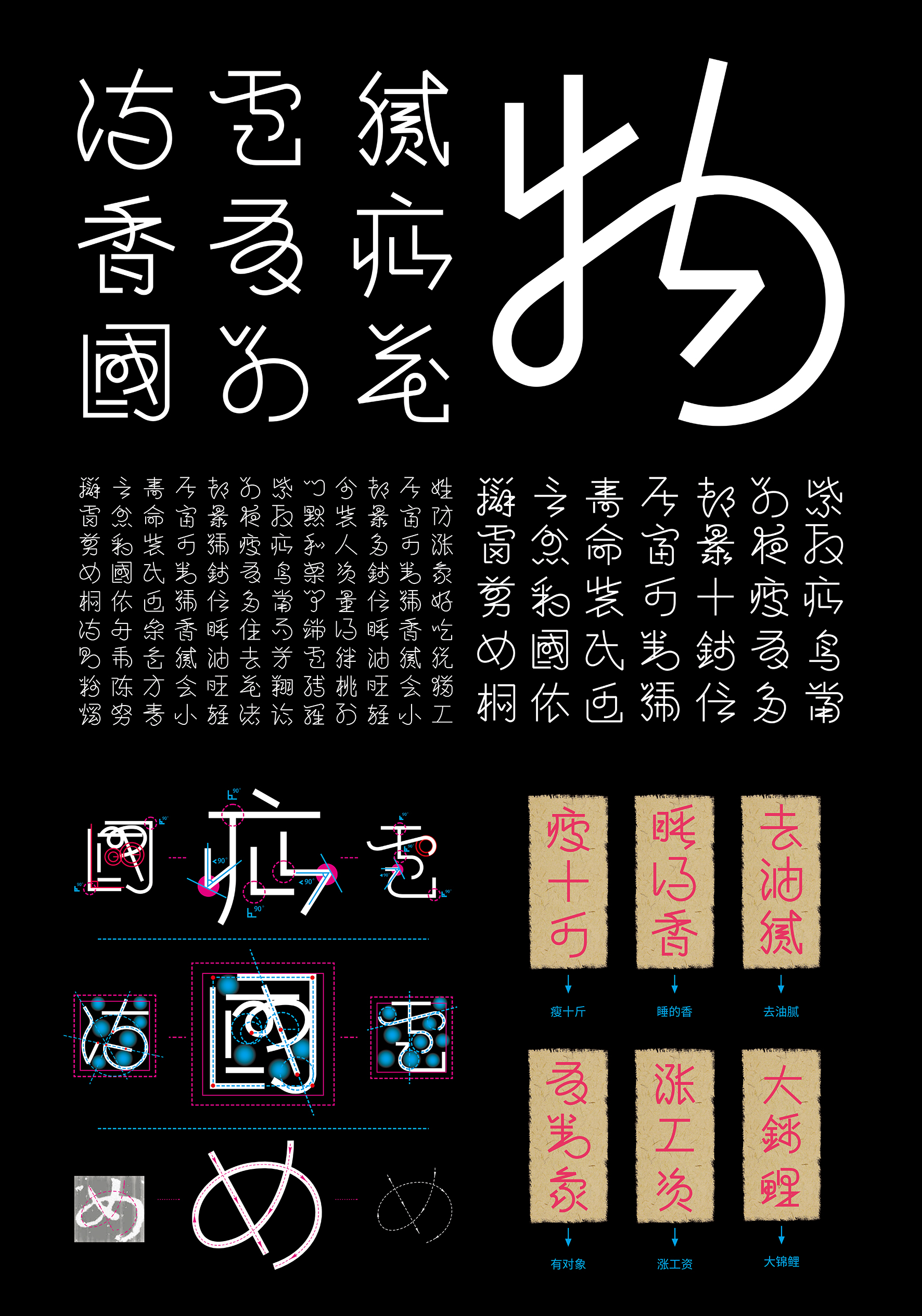 汉字在数千年的发展历程中,形成了多样的书体字形。本板块展示了以汉字不同书体为研究对象的艺术设计作品。