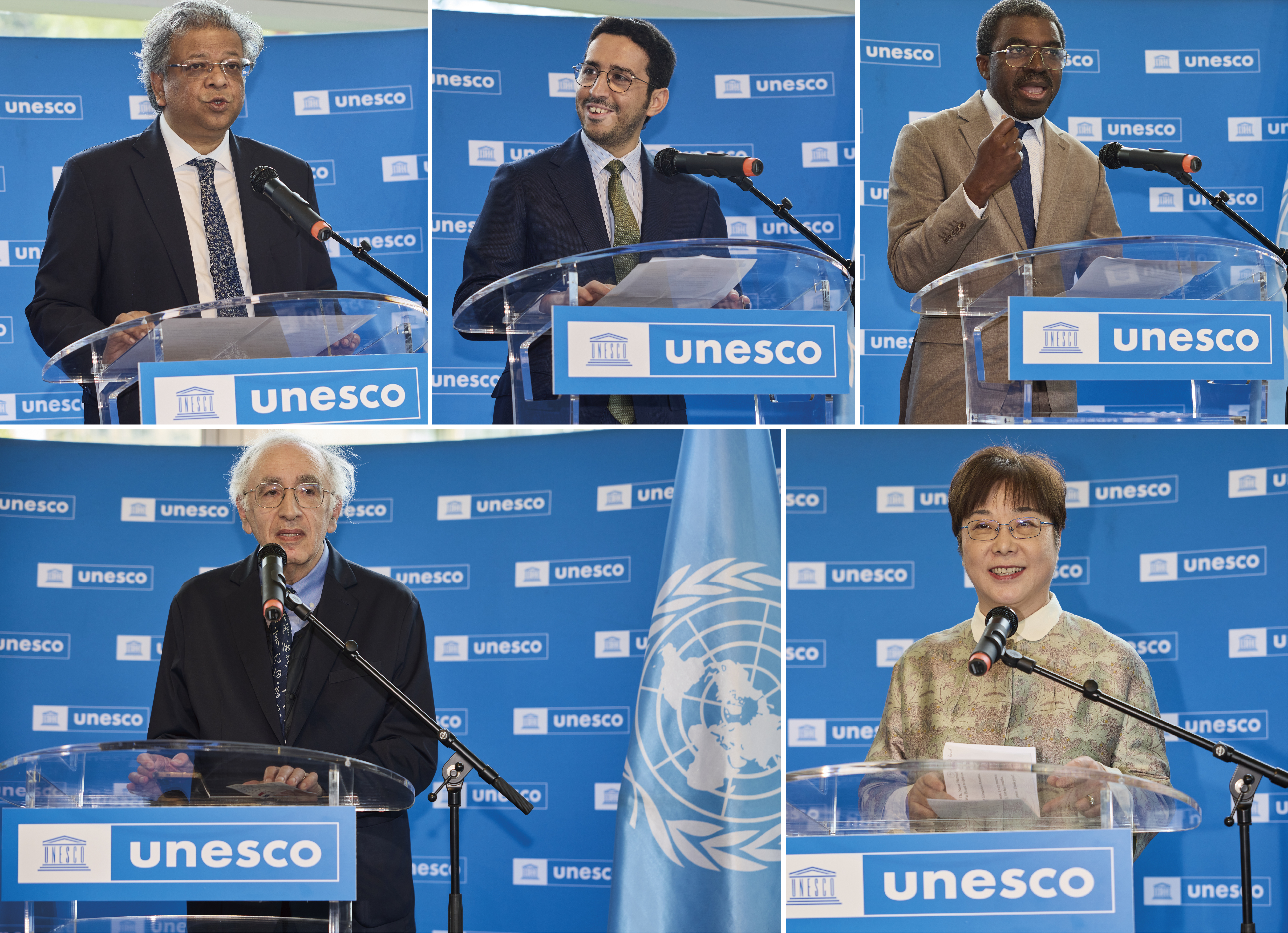 大会主席塔尔哈(Khondker M. Talha)、执行局主席辛扎布(Nasser Bin Hamad Al Hinzab)、世界遗产中心主任拉扎赫(Lazare Eloundou Assomo),以及法国汉学家、欧洲汉语教学协会名誉会长白乐桑(Joël Bellassen)、中国常驻联合国教科文组织大使衔代表杨新育,在开幕活动中发表致辞。
