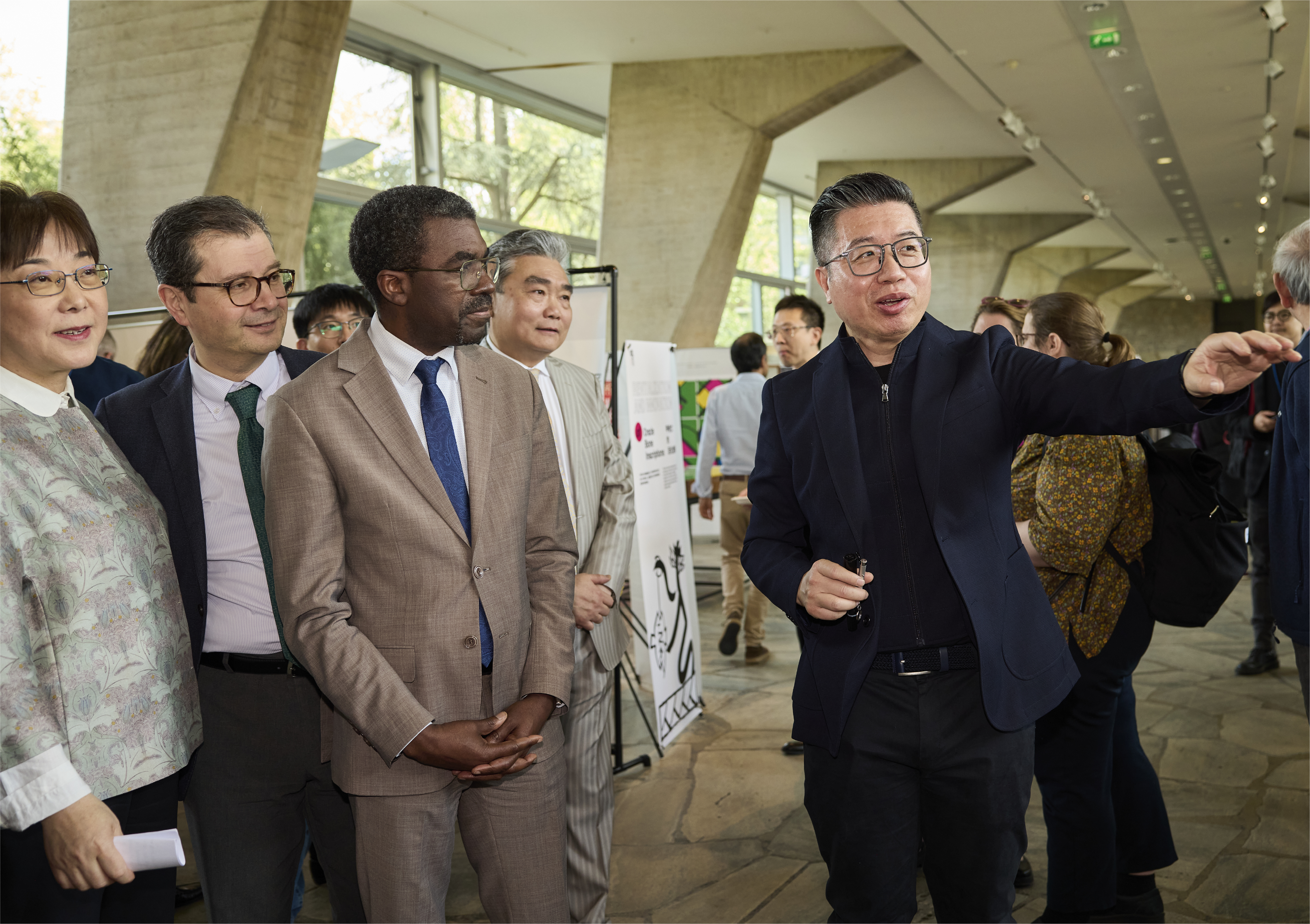 当地时间4月16日,“汉字智慧:中国汉字文化设计传播展”在位于巴黎的联合国教科文组织总部(UNESCO)启幕。联合国教科文组织大会主席塔尔哈(Khondker M. Talha)、联合国教科文组织执行局主席辛扎布(Nasser Bin Hamad Al Hinzab)、联合国教科文组织世界遗产中心主任拉扎赫·伊伦都·阿索莫(Lazare Eloundou Assomo)、中国常驻联合国教科文组织大使衔代表杨新育、中国常驻联合国教科文组织副代表王盈,以及法国汉学家、欧洲汉语教学协会名誉会长白乐桑(Joël Bellassen),展览艺术家、清华大学美术学院教授陈楠等300余名各国常驻代表、外交官及文化界人士等出席了开幕式。