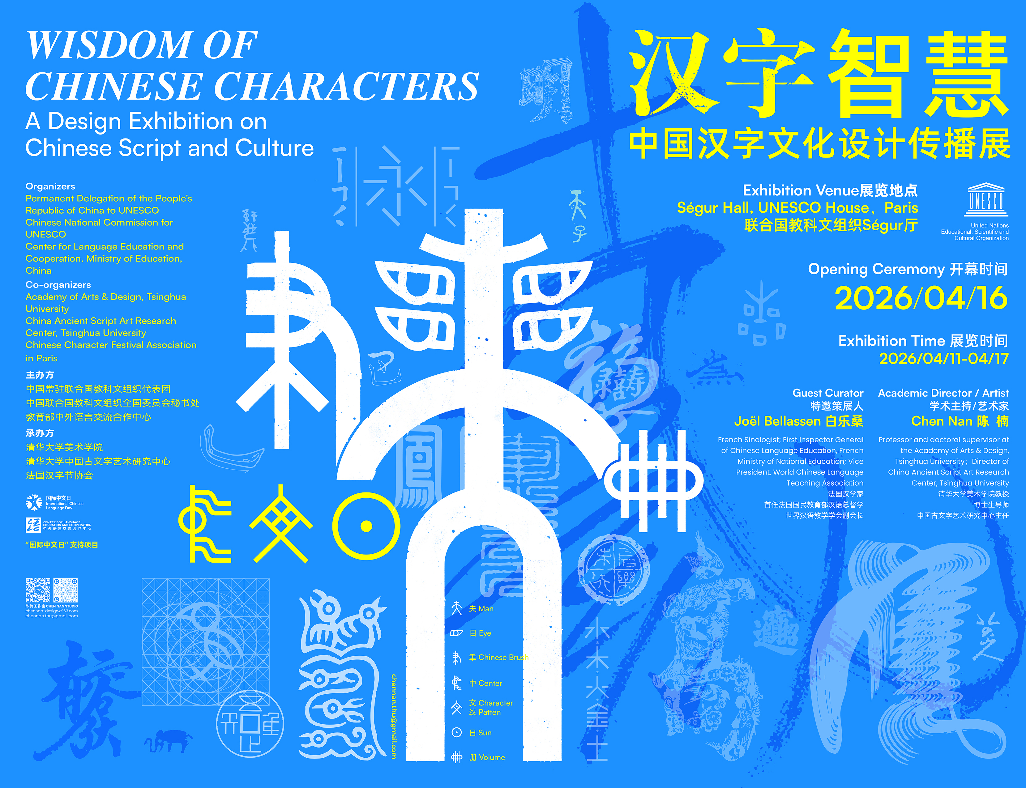 本次展览由中国常驻联合国教科文组织代表团、中国联合国教科文组织全国委员会、教育部中外语言交流合作中心联合主办,清华大学美术学院、清华大学中国古文字艺术研究中心、法国汉字节协会承办。陈楠教授是本次展览的总策划、艺术家,法国汉学家白乐桑担任特邀策展人。展览突出设计维度视角下的汉字艺术设计,通过平面视觉艺术、艺术装置、信息可视化图表、立体书、视频影像等多元形态,生动呈现汉字融入衣食住行各层面的设计智慧,展示了陈楠教授团队三十年来在汉字艺术设计与文化传播领域的成果。