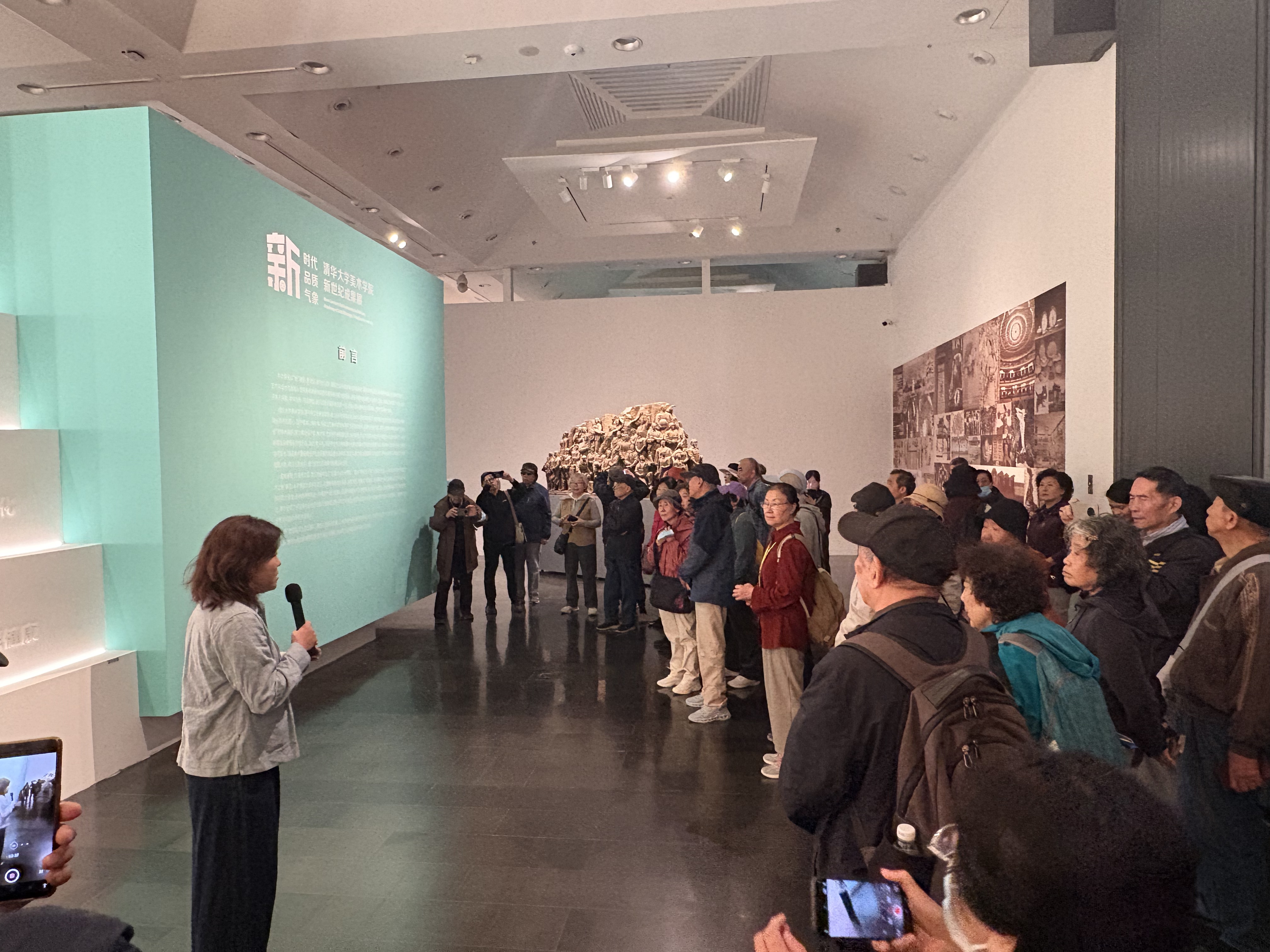 活动当日上午,一行人首先走进艺术博物馆四层,参观学院主办的“新时代、新品质、新气象:清华大学美术学院新世纪成果展”。本次展览系统梳理了学院1999年并入清华大学以来的发展脉络与探索突破,全面展示了新世纪办学路上的学术底蕴与精神风貌。展览统筹、学院副院长王小茉,策展人梁开两位老师现场全程讲解,围绕展览核心板块,细致介绍了学院多年来在艺术创作、学科建设、服务国家战略等领域的丰硕成果,带领老同志们重温学院发展历程,深度阐释“艺科融合”办学理念与实践成效。大家驻足细看、认真聆听,深切感受到学院日新月异的发展成就,内心倍感欣慰与自豪。