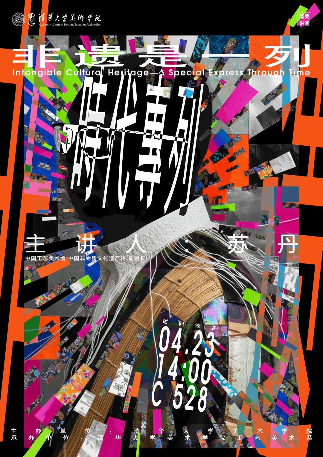 4月23日,由清华大学美术学院主办的“清美讲堂”在美术学院C528报告厅举行。中国工艺美术馆 中国非物质文化遗产馆副馆长苏丹,以“非遗是一列时代专列”为题,为现场师生与业界同仁带来了一场思想深刻、视野宏阔的学术讲座。本场讲座由清华大学美术学院党委副书记王晓昕主持,美术学院副院长李迎军、王小茉以及各系师生代表等出席。