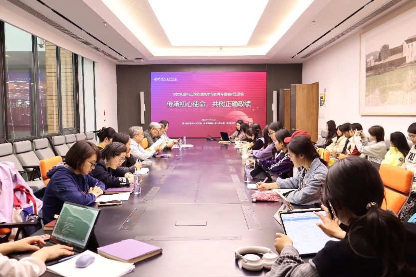 为深入学习贯彻习近平总书记关于树立和践行正确政绩观的重要论述,扎实推进学习教育走深走实,4月16日下午,美术学院机关一党支部、离退休教职工第五党支部、美 4 党支部在学院A327会议室开展主题为“传承初心使命,共树正确政绩”的联学共建活动。机关一党支部书记郭岱主持,三个党支部党员、发展对象、积极分子30余人共同参与学习研讨。