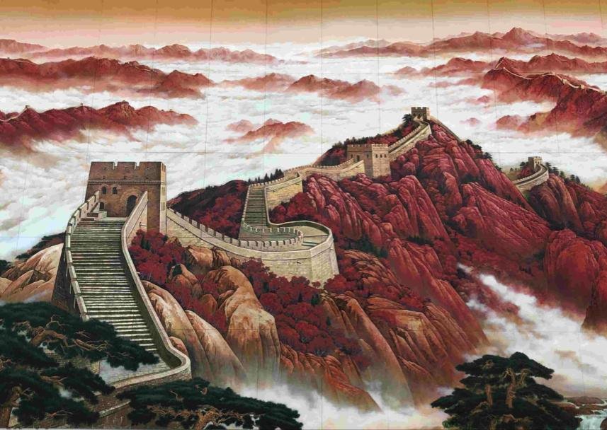 采用中国绘画鸟瞰式构图的《长城颂》漆壁画,表现经历了两千五百多年岁月磨洗的长城,至今依然屹立在世界的东方