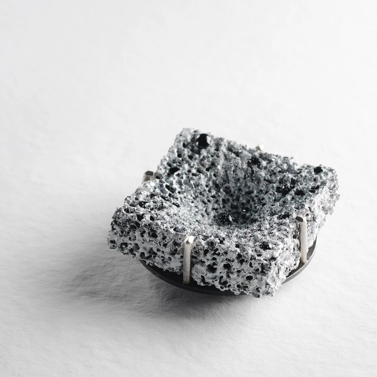 Stephen Bottomley 教授长期深耕珠宝设计及工艺创新,作品特色鲜明:融合珠宝制作传统技艺与当代工业材料,核心技法含珐琅釉彩、压花冲压成型及蚀刻工艺;灵感源自自然形态、东方意象与数学几何,以压花重复纹理构建多维视觉层次,作品兼具观赏性与创新性。