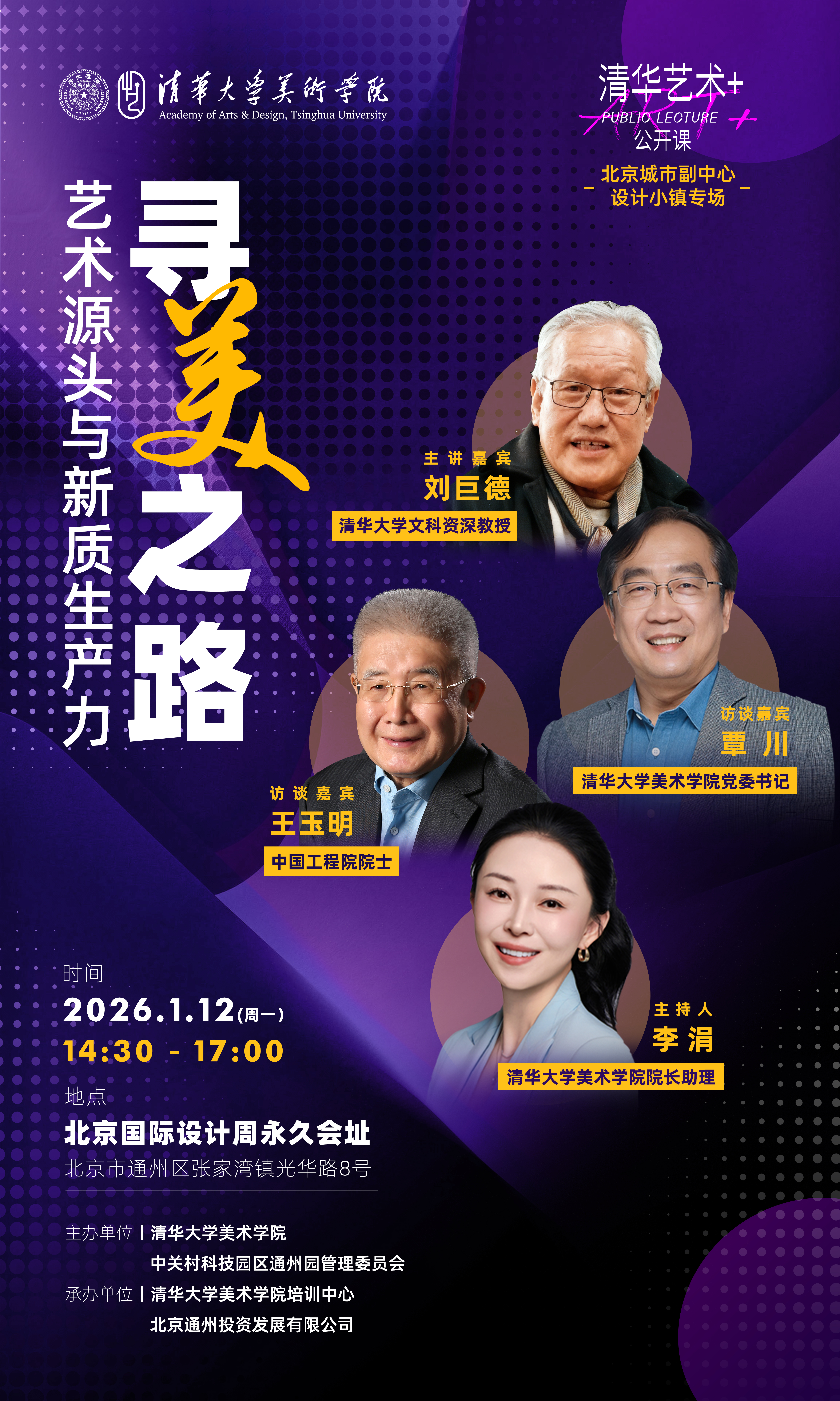为深入贯彻落实创新驱动发展战略,服务新时代首都高质量发展,依托清华大学美术学院在艺术创新与前沿探索方面的学科优势,结合中关村通州园区作为北京国际科技创新中心核心载体的战略定位,2026年首期公开课将开展“寻美之路:艺术源头与新质生产力——清华大学艺术公开课通州设计小镇专场”活动,旨在构建“艺术驱动创新、科技赋能设计”的融合发展平台,谱写校地合作新篇章。