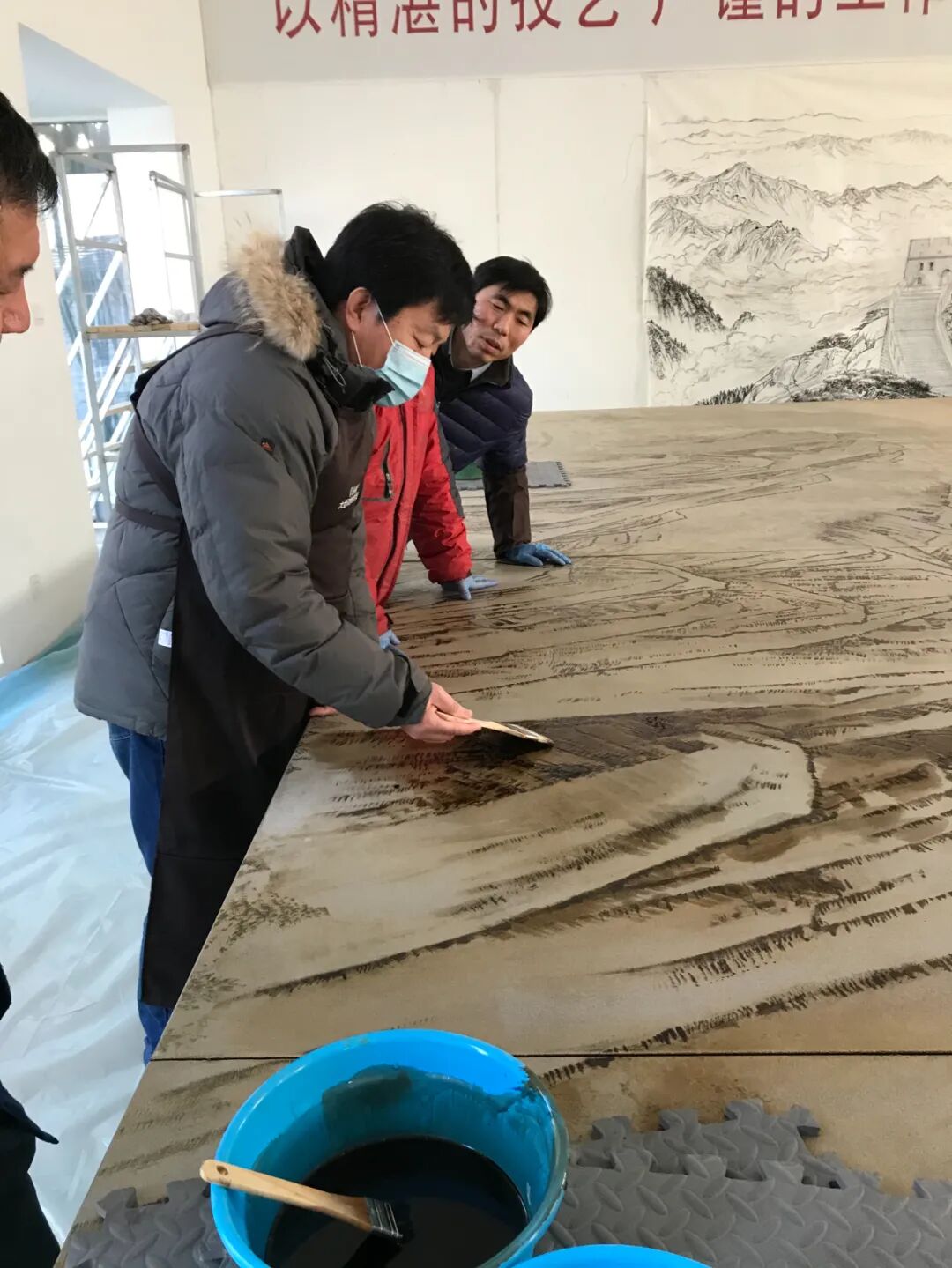 关于创作工艺方案,程向军教授多次征求乔十光先生的意见。著名漆画家乔十光教授是中国漆画的开拓者之一,是清华大学美术学院漆艺专业的创始人,他担任了这次《长城颂》漆壁画的艺术顾问。主创者程向军教授则多次到长城实地考察写生,反复推敲创作稿。这幅壁画是漆画史最大的室内漆壁画,对于壁画工艺实施方案有许多新挑战,艺术质量及安装工艺标准高。