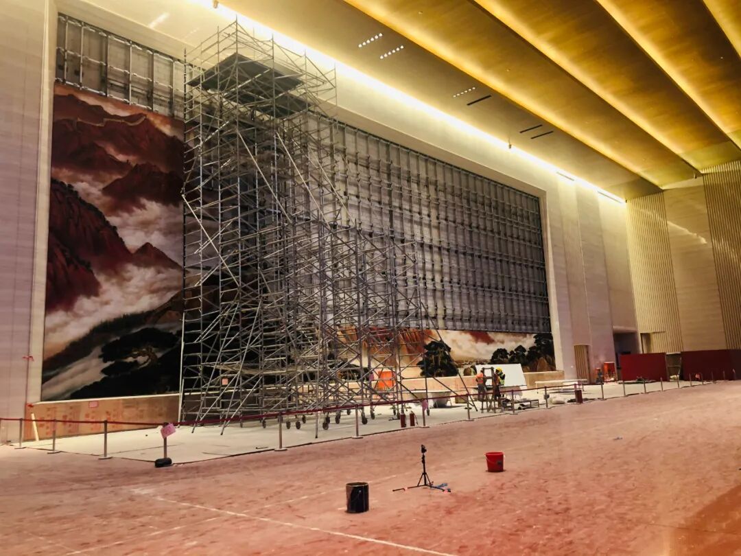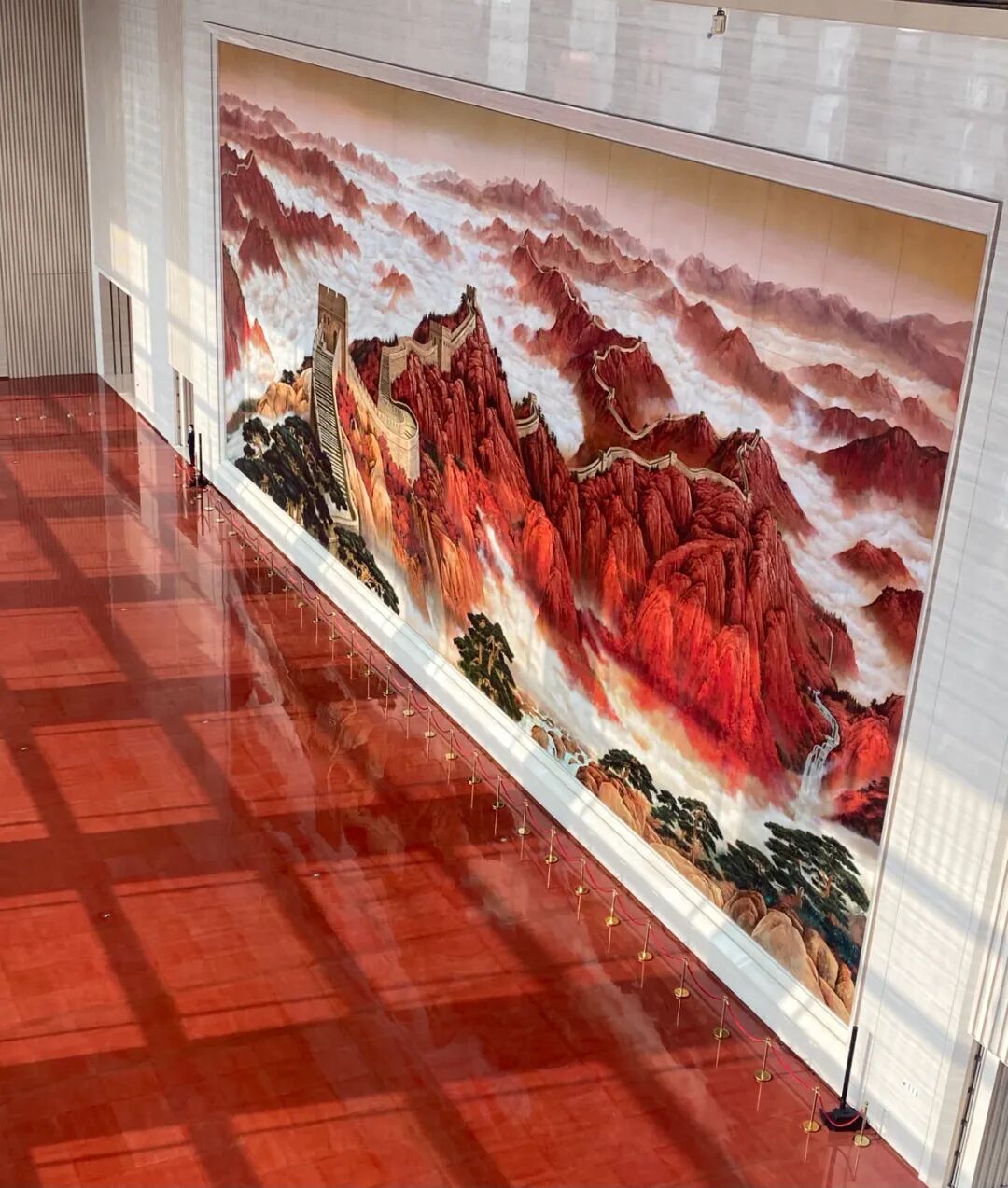 清华大学美术学院程向军教授创作《长城颂》漆壁画高15m,宽40m,由100块2mx3m的铝蜂窝板组成,寓意庆祝建党100周年。壁画釆用建筑干掛技术安装,是专为中国共产党历史展览馆序厅量身定做,壁画总面积600平米,是漆画史上前所未有的超大体量作品。